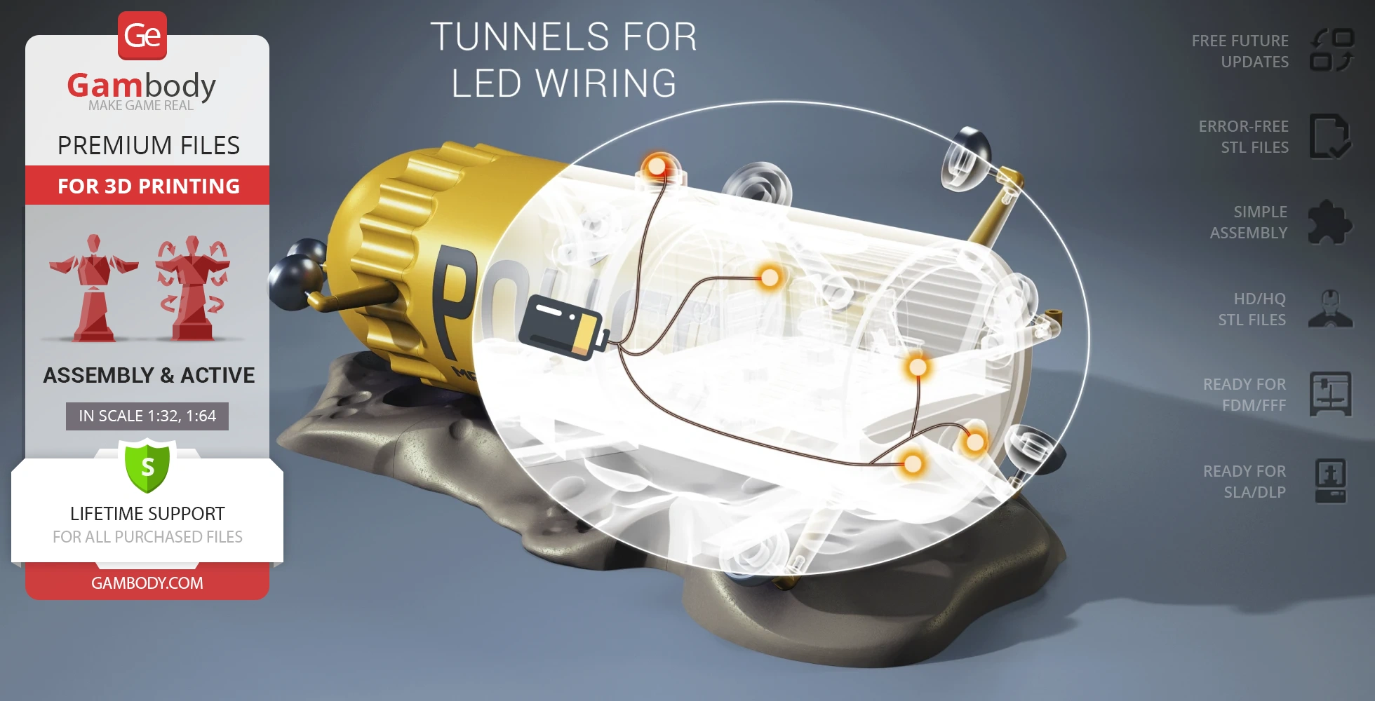 The compact and functional Space Coupe could not leave indifferent our skillful 3D artist who designed this amazing vehicle for 3D printing. The vehicle has an elongated shape with nine thrusters attached to the hull that can be positioned according to your preferences or printed as static. The hull features engraved lettering to ease the painting process. Talking about the interior, you will be impressed by its level of detail, you can start thinking of the pilots and passengers right now! And the possibility of lighting up the cockpit, dashboard, navigation, and emergency lights is like icing on the cake! Tracy’s Space Coupe is made to manifest your dreams!