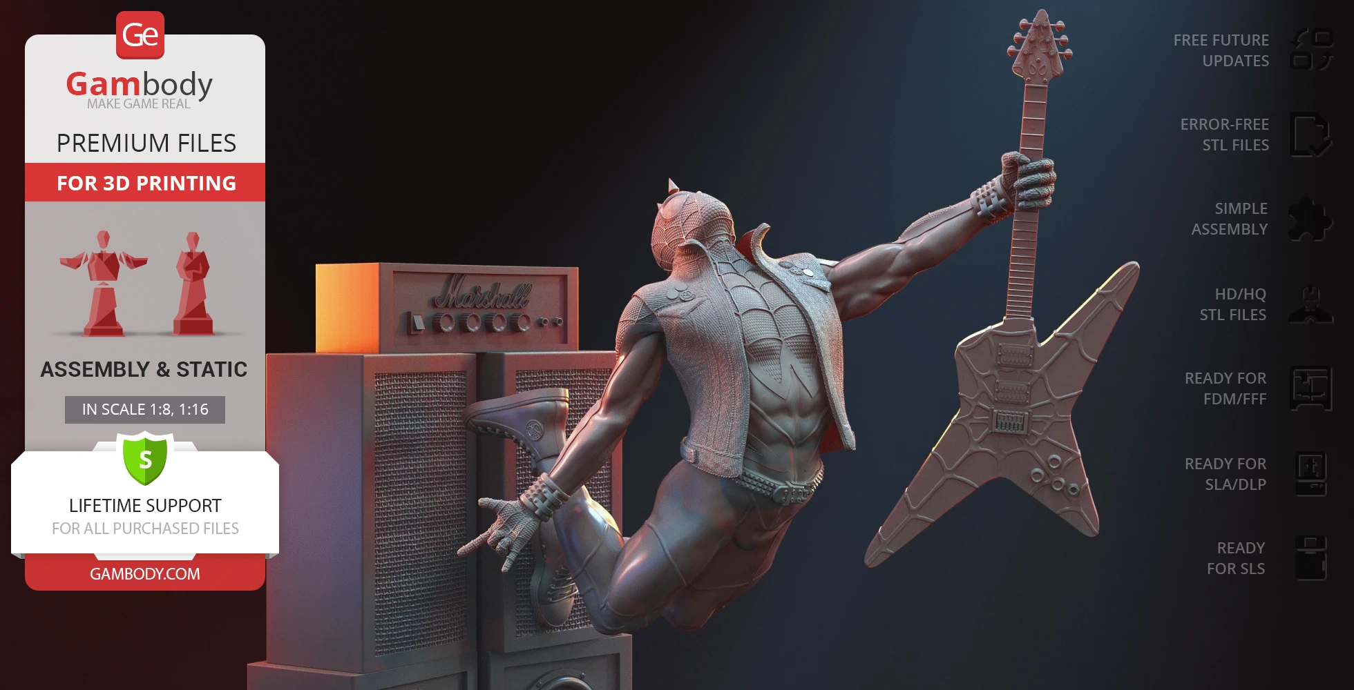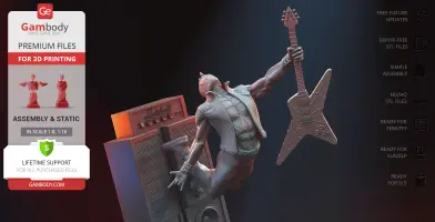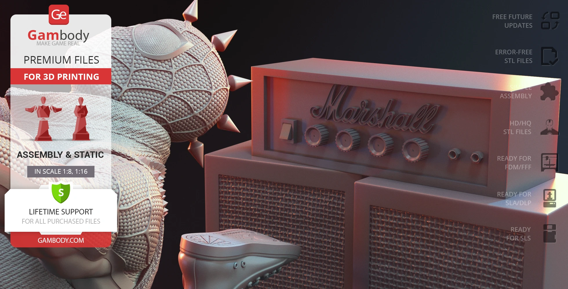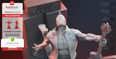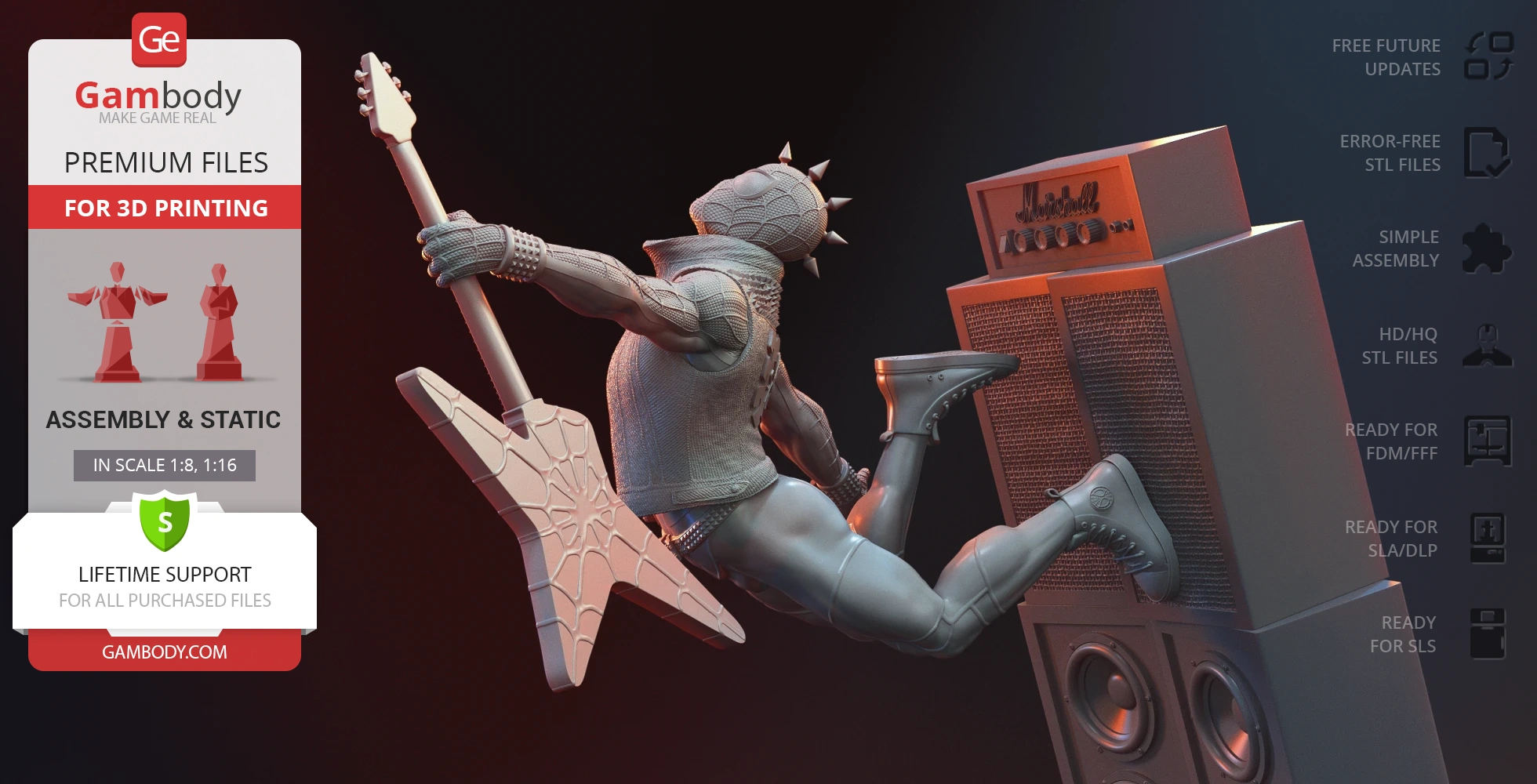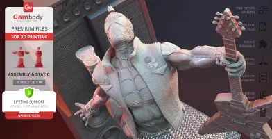 The Earth-138 version of Spider-Man inspired our contributing 3D artist to create this authentic model for 3D printing. The chosen scene looks like a live performance of the punk-rock star, as emotional and impressive. Spider-Punk is depicted in the jump pushing the feet against the guitar amp and holding his instrument. The style of the superhero fully represents his belonging to the punk subculture: the costume of the hero consists of a battle jacket with patches and badges, high sneakers, a face mask decorated with spikes, the accessories include studded bracelets and a belt, the guitar of Spider-Punk features famous web pattern. The expressiveness of the hero is another feature that makes the model look so original, each detail of the scene is made with great mastery and can't but impress! If you are dreaming of an exclusive outstanding project, Spider-Punk 3D printing design is what you need!