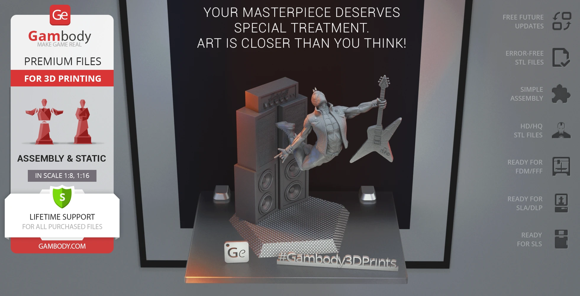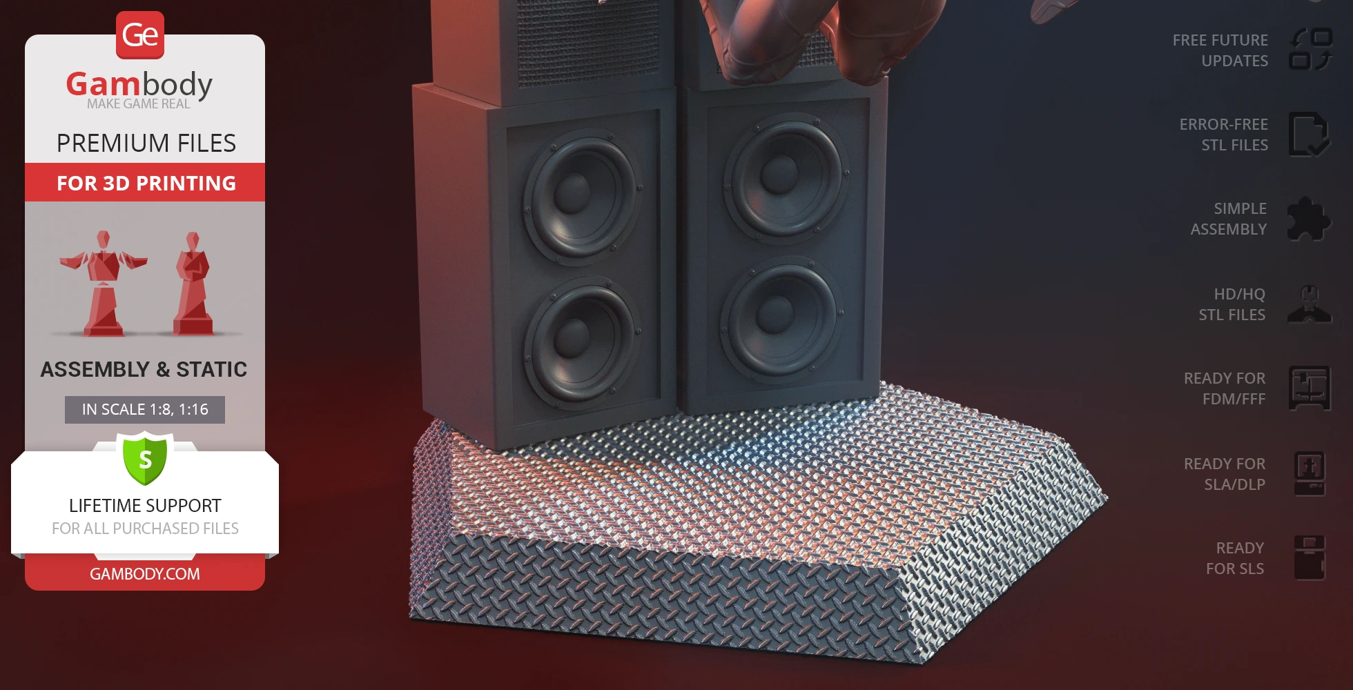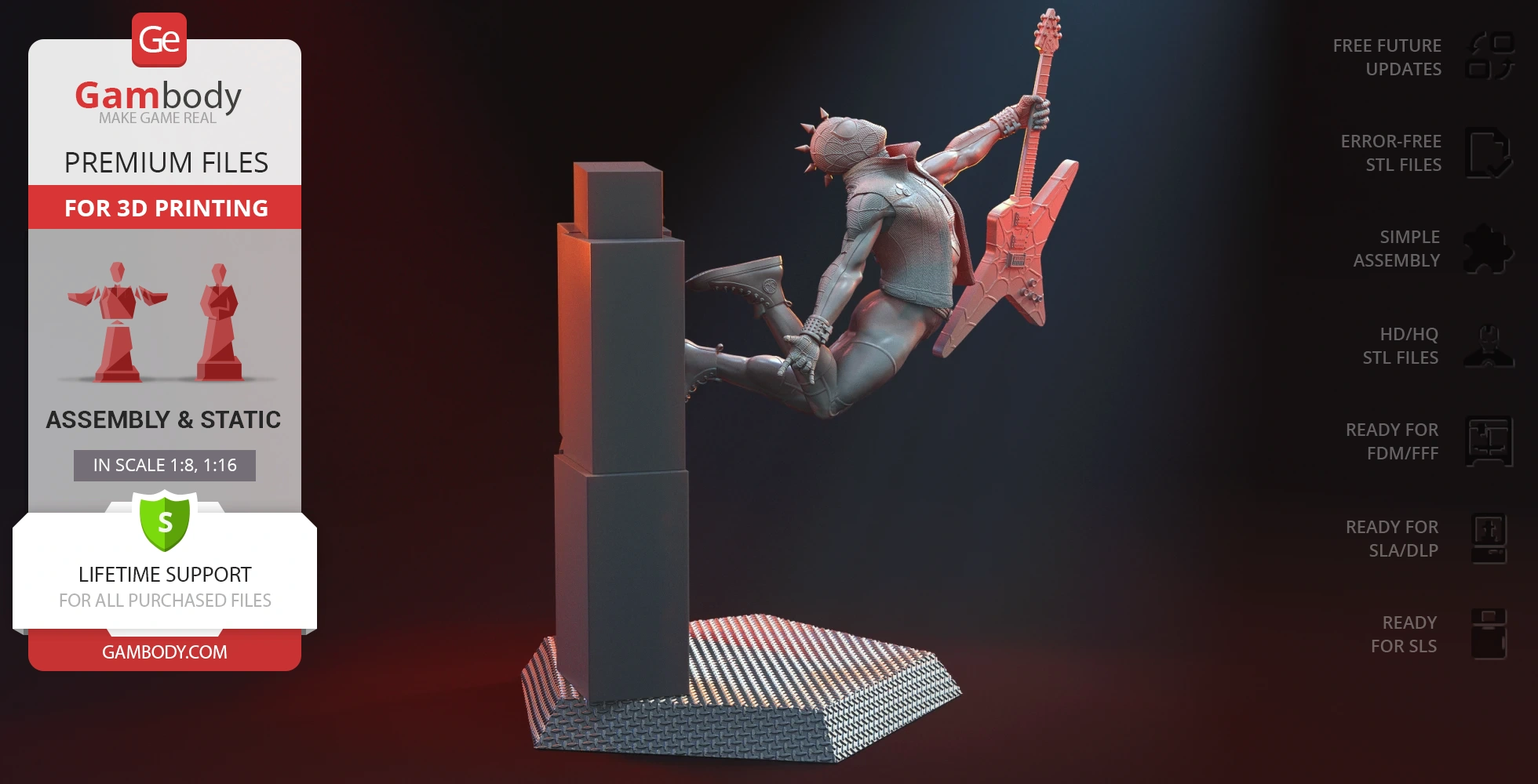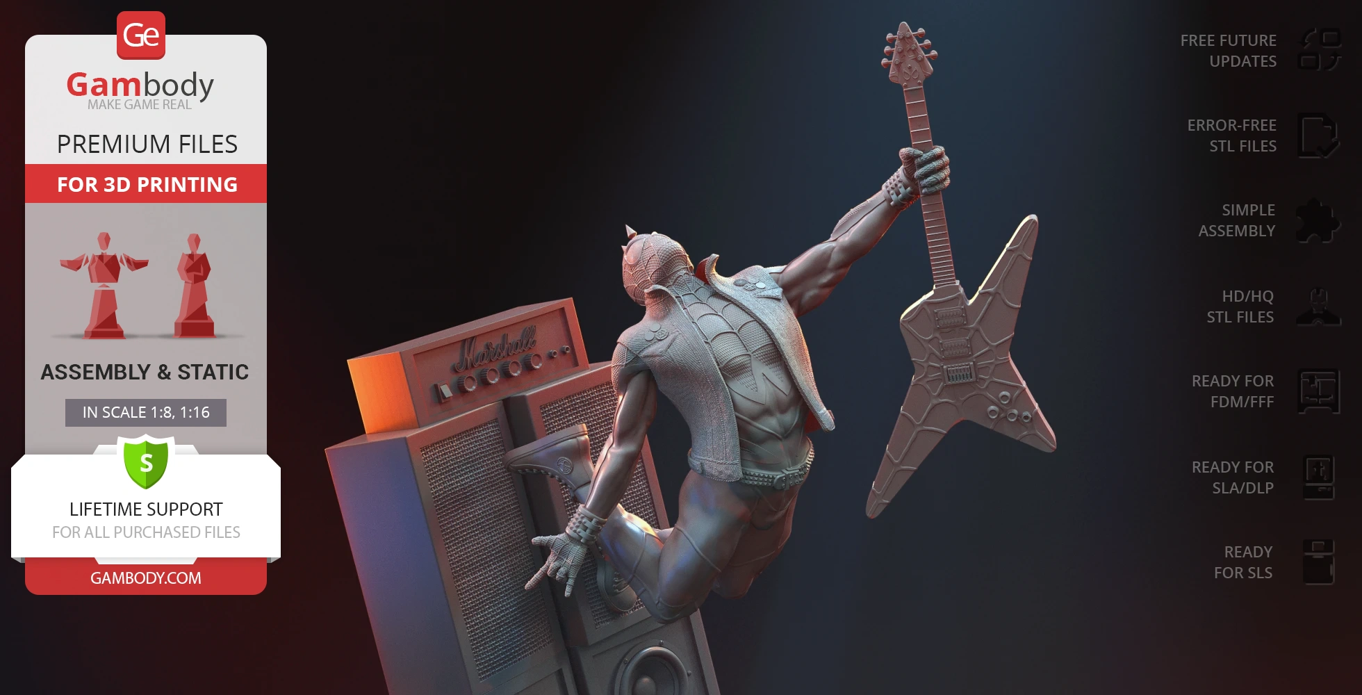 The Earth-138 version of Spider-Man inspired our contributing 3D artist to create this authentic model for 3D printing. The chosen scene looks like a live performance of the punk-rock star, as emotional and impressive. Spider-Punk is depicted in the jump pushing the feet against the guitar amp and holding his instrument. The style of the superhero fully represents his belonging to the punk subculture: the costume of the hero consists of a battle jacket with patches and badges, high sneakers, a face mask decorated with spikes, the accessories include studded bracelets and a belt, the guitar of Spider-Punk features famous web pattern. The expressiveness of the hero is another feature that makes the model look so original, each detail of the scene is made with great mastery and can't but impress! If you are dreaming of an exclusive outstanding project, Spider-Punk 3D printing design is what you need!
