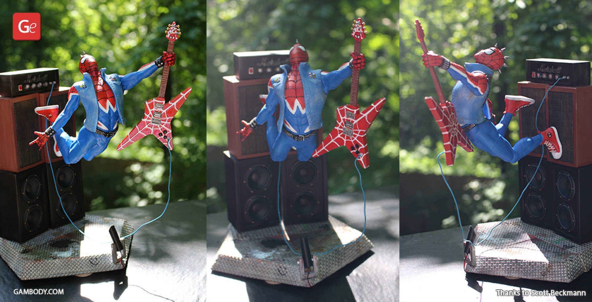 A solid Spider-Punk model on and separately from the stylised platform.The assembly parts are connected using specially designed integrated connectors that fit securely into the corresponding slots. Optionally, for added strength and rigidity, the static connections can be glued together;