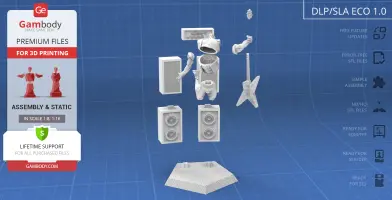 Some parts are hollowed out to save resin. The assembly parts are connected using specially designed integrated connectors that fit securely into the corresponding slots. Optionally, for added strength and rigidity, the static connections can be glued together;