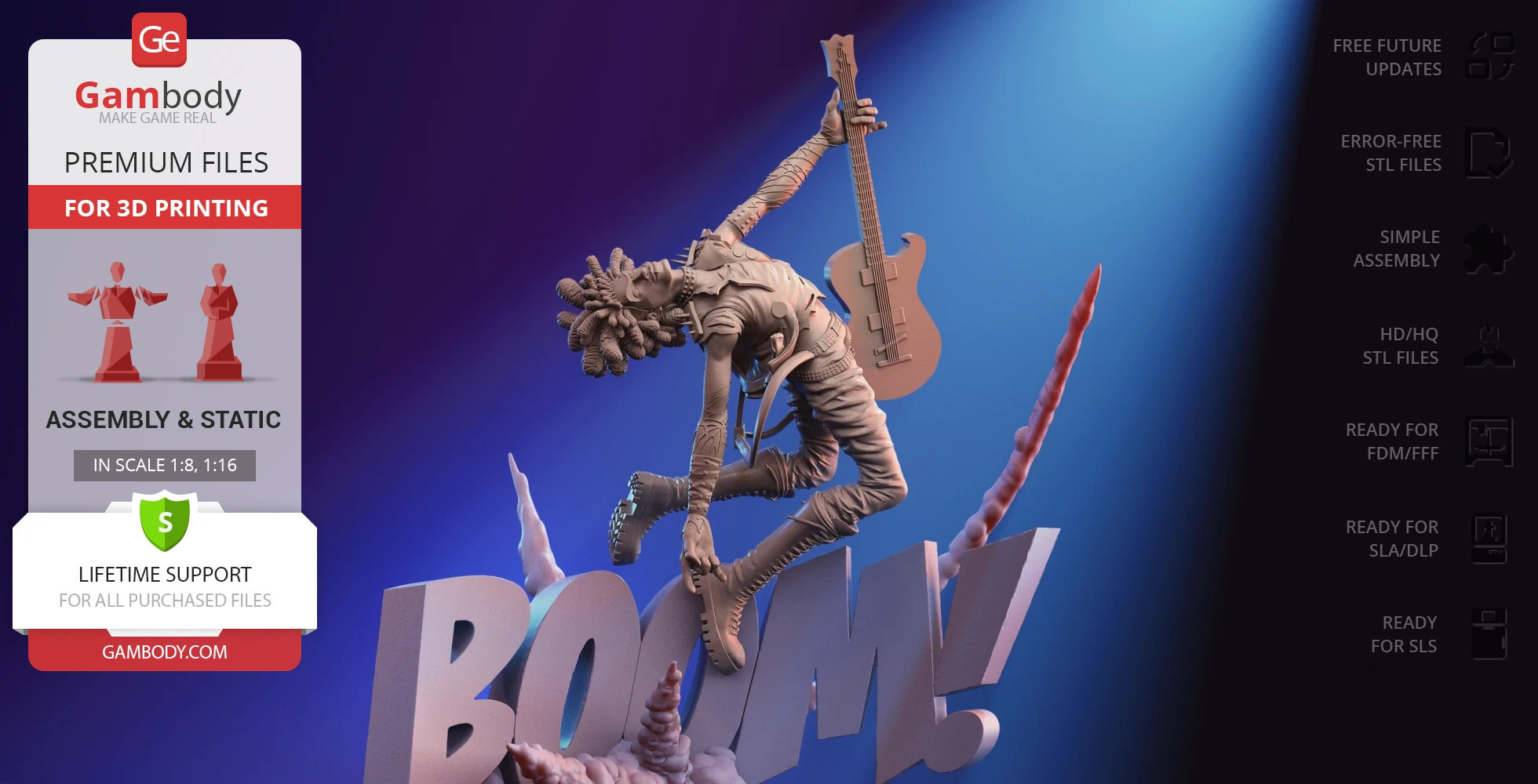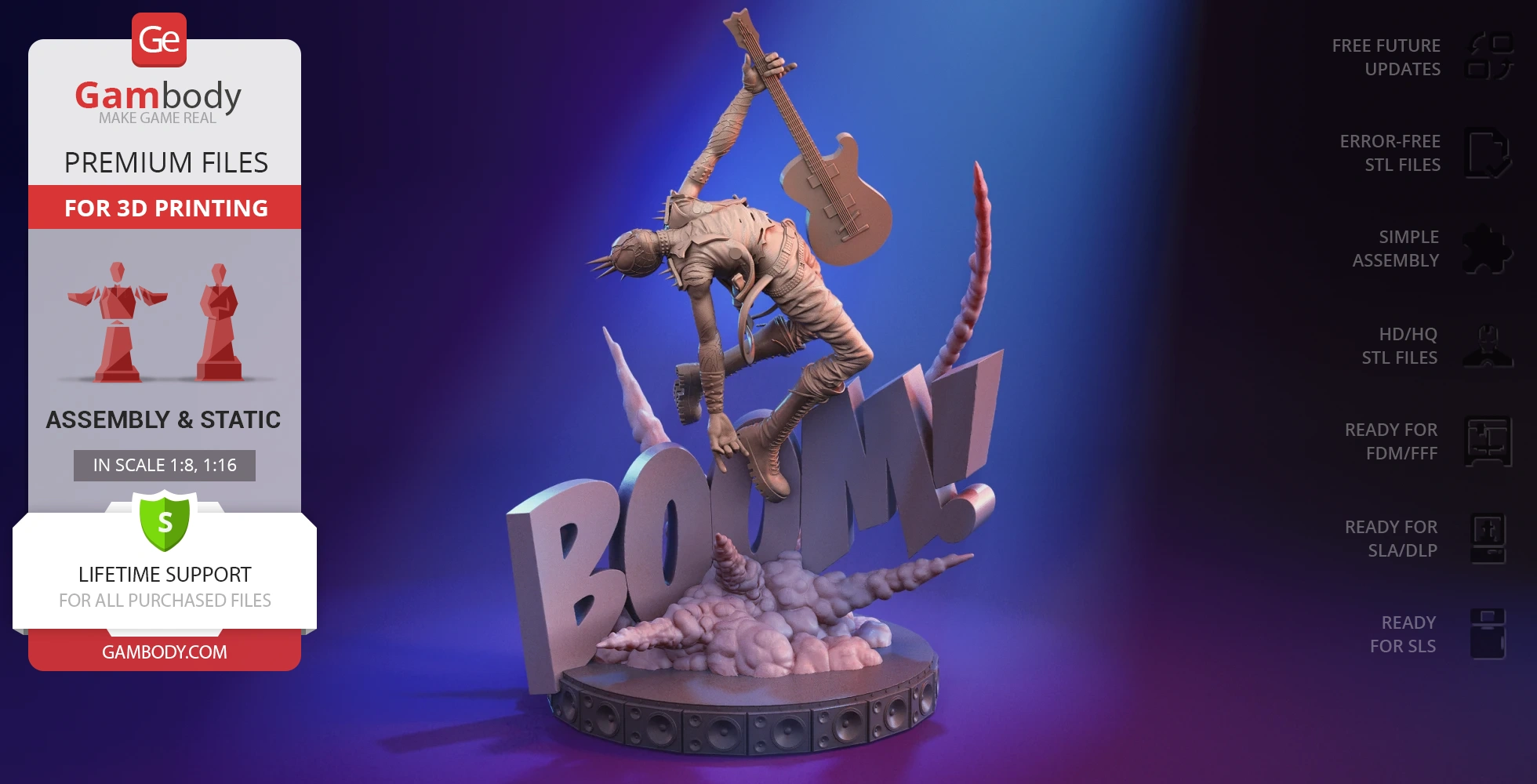 This Spider-Verse version of Spider-Man has inspired the creation of a striking 3D print model, ideal for enthusiasts of Marvel memorabilia and 3D printing fans. The model captures Spider-Punk in a dynamic live performance pose, positioned mid-jump with the word "BOOM" as a stand, emphasizing the energy and impact of his punk-rock persona.