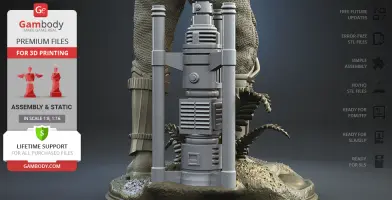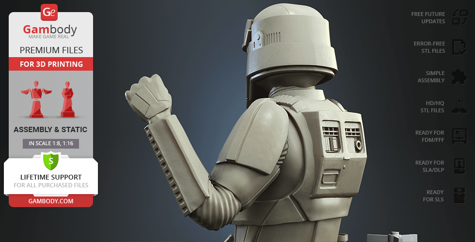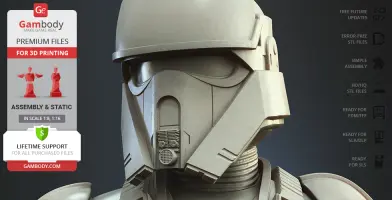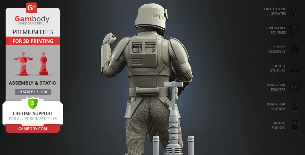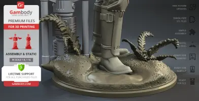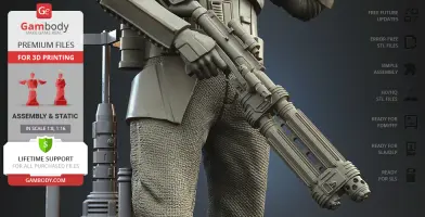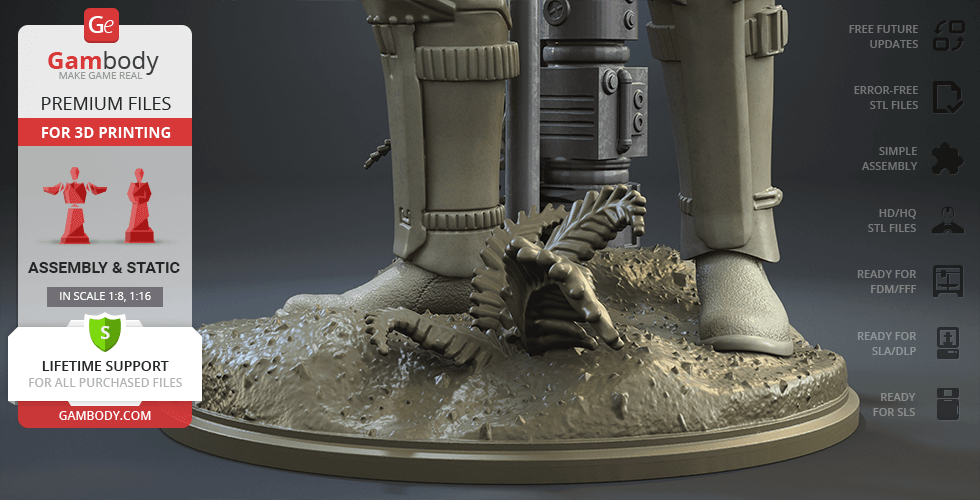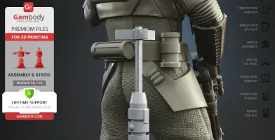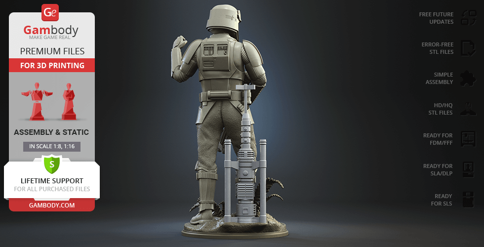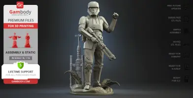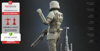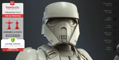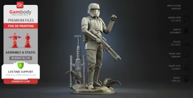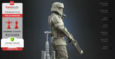 With the Shoretrooper 3D print model, you will feel the humid breeze of the Scarif. The character is surrounded by a familiar terrain - the tropical plants, sand under the boots, and the moisture vaporator nearby. The trooper’s armour is adapted for the climate and freedom of movement, and the textured baggy pants with no thigh armour create a recognisable look. The highly detailed model equipped with the signature blaster rifle is greeting you with a friendly gesture! But are you truly on the Shoretrooper’s side?