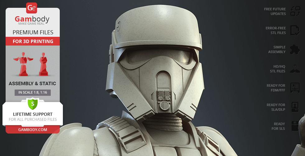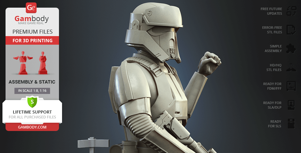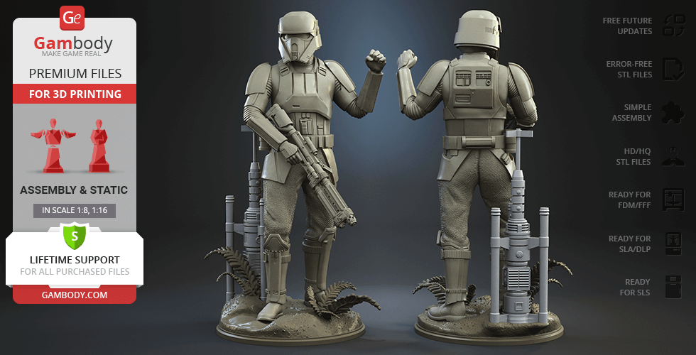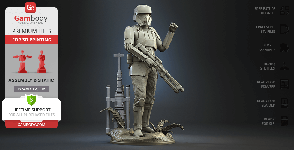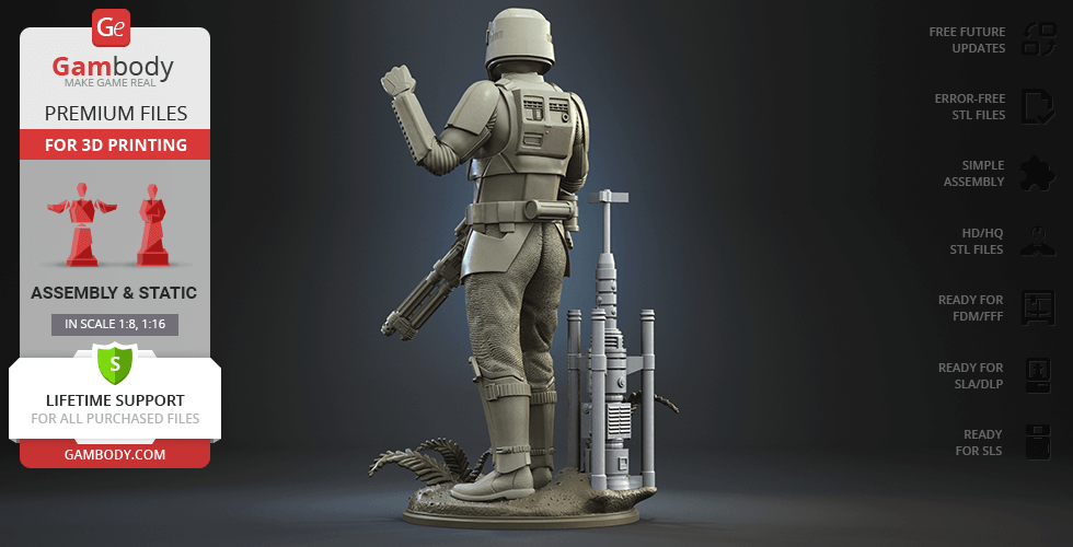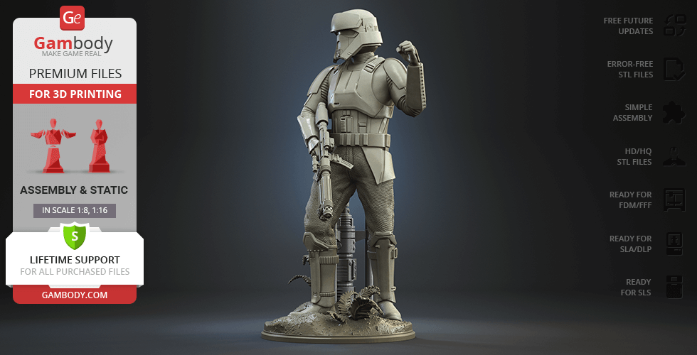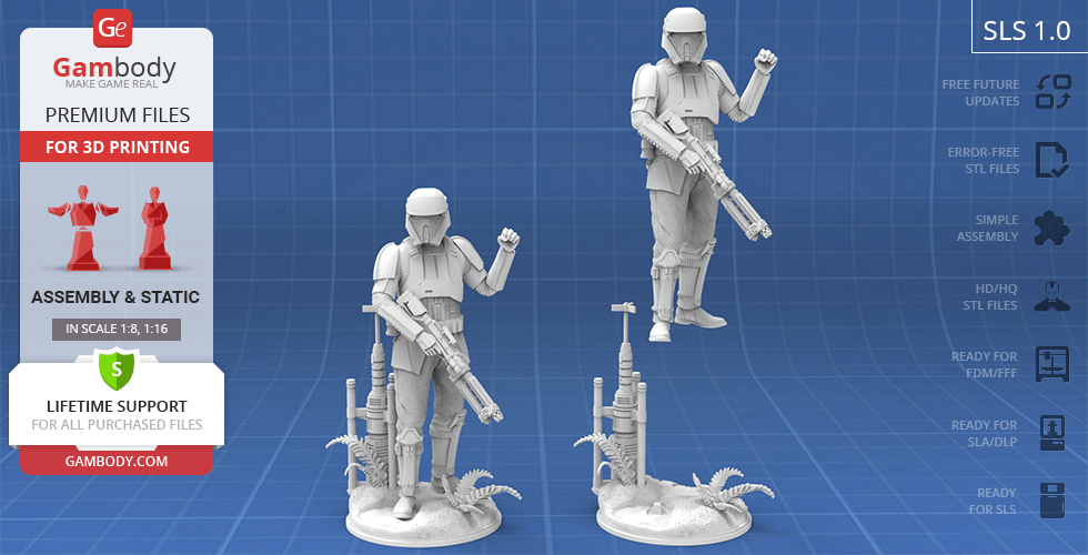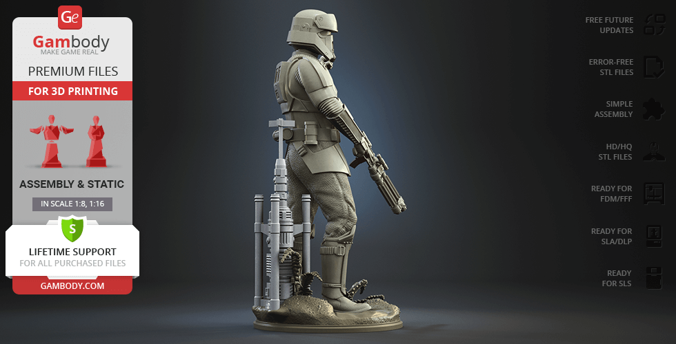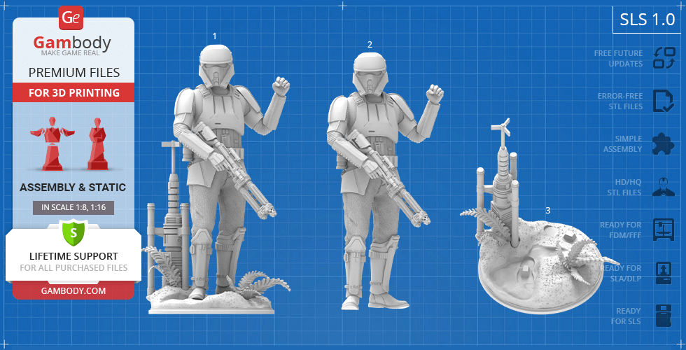 - 4 versions of Shoretrooper STL files for FFF/FDM, DLP/SLA, DLP/SLA Eco, and SLS — files for all versions are available for download after the purchase;