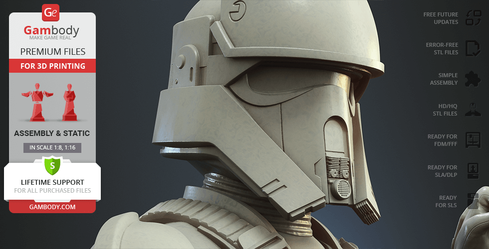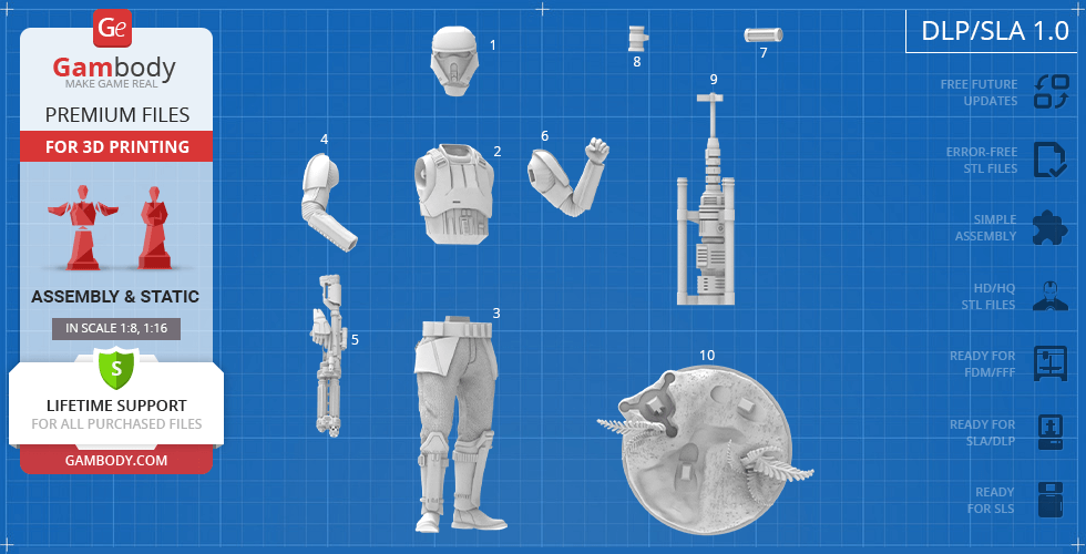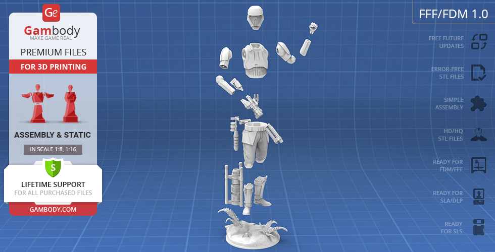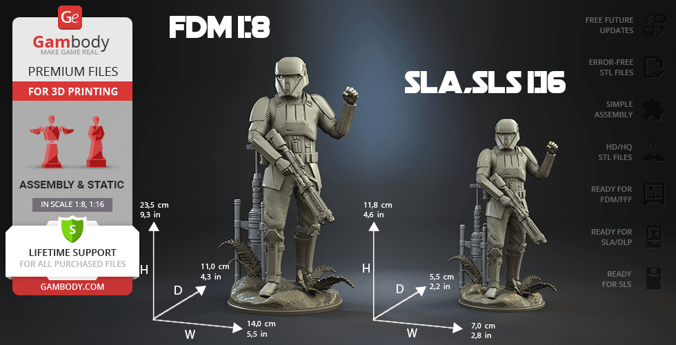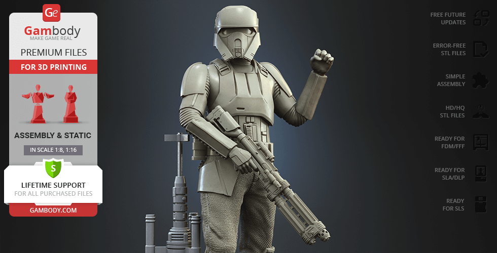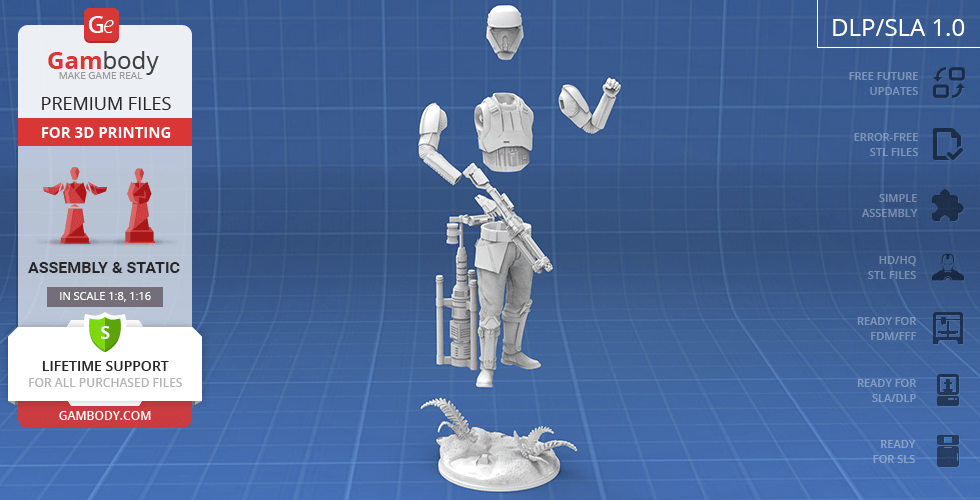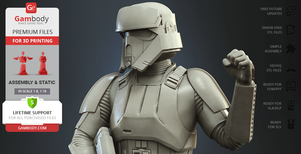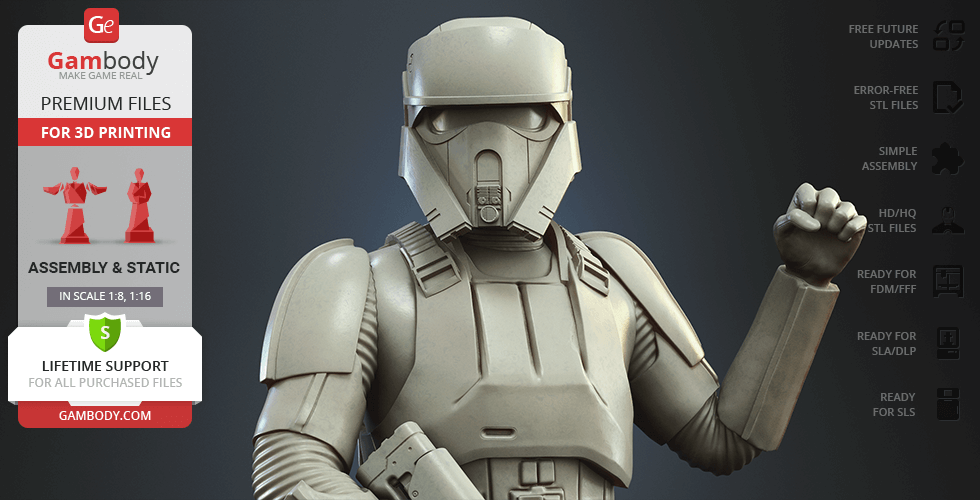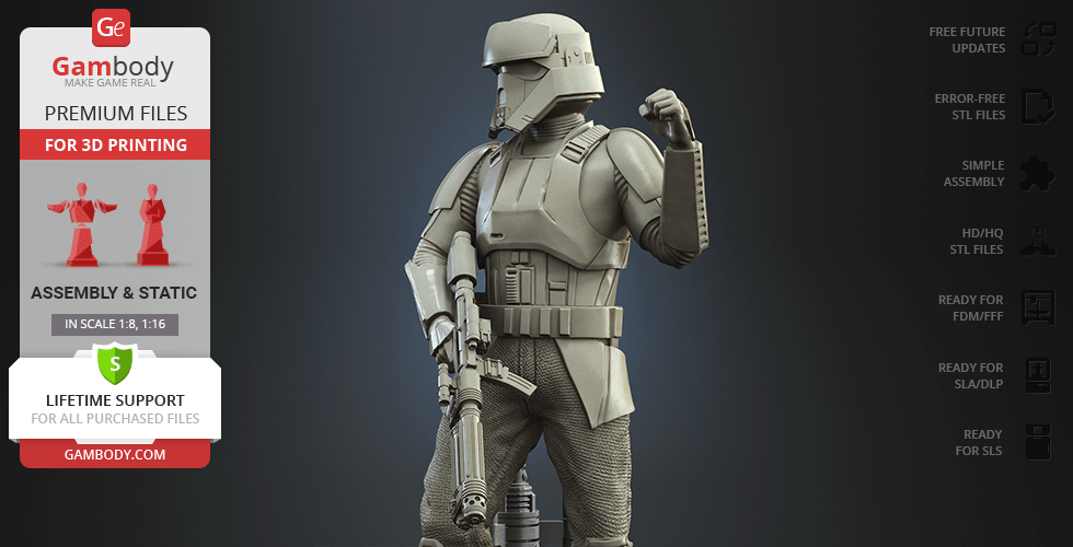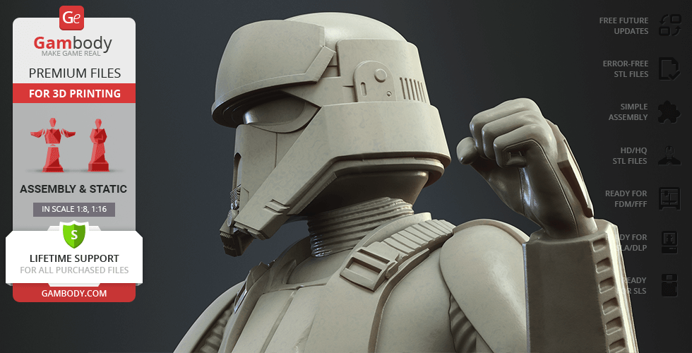 - 4 versions of Shoretrooper STL files for FFF/FDM, DLP/SLA, DLP/SLA Eco, and SLS — files for all versions are available for download after the purchase;