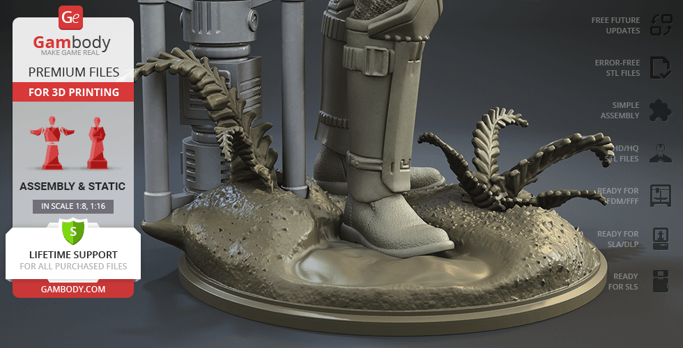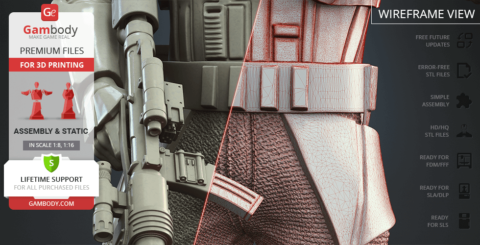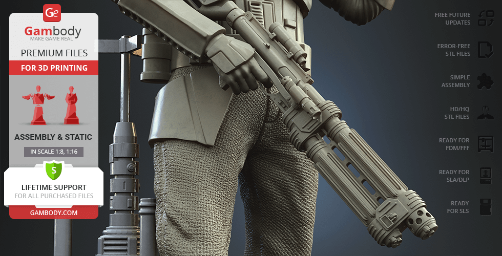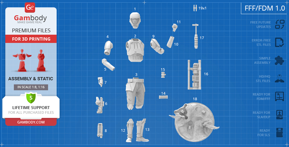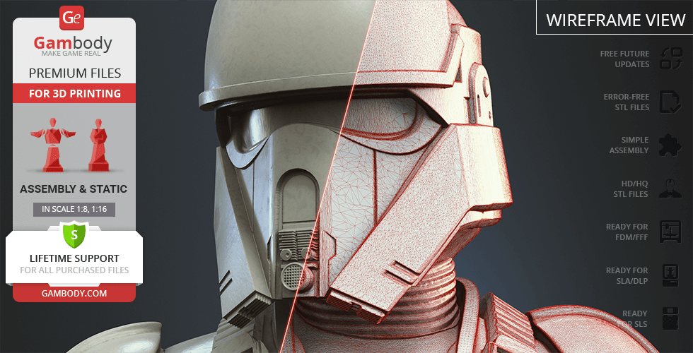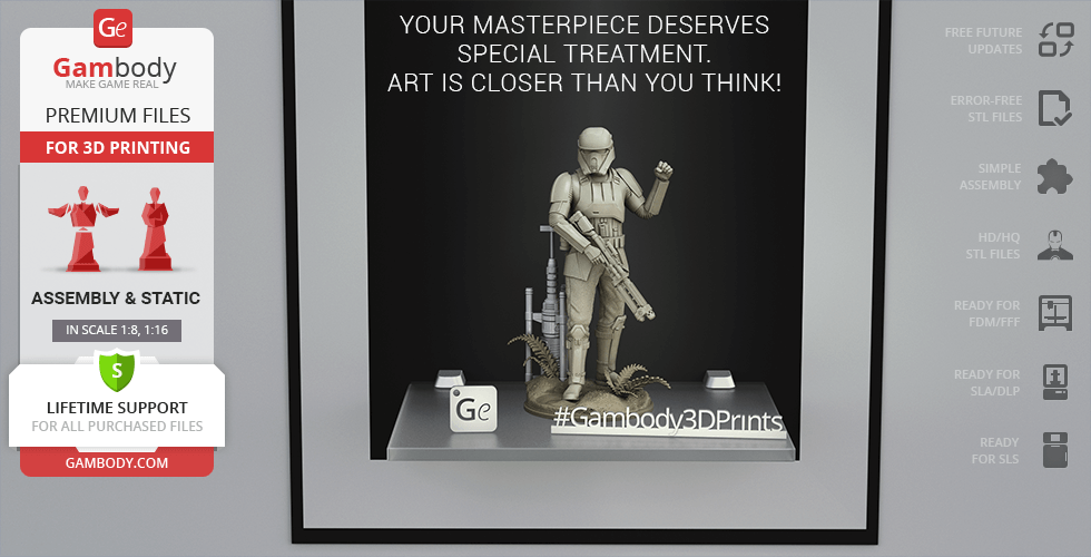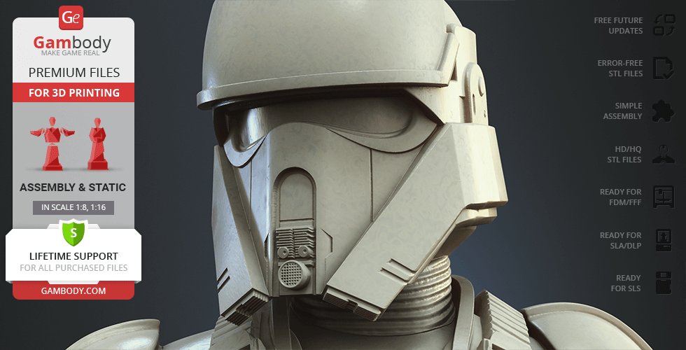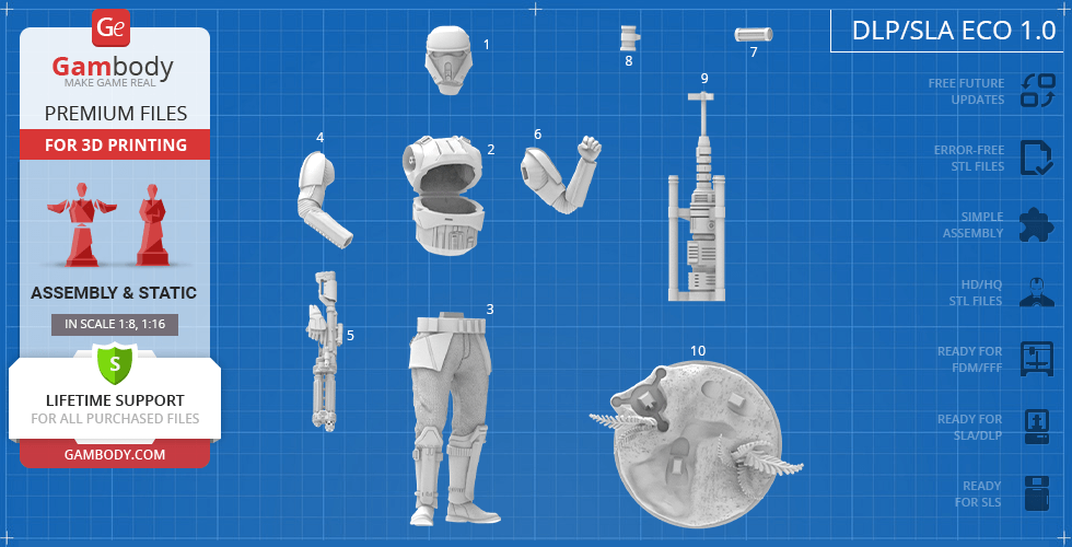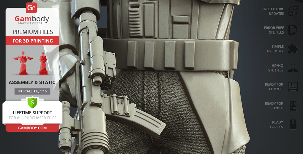 - 4 versions of Shoretrooper STL files for FFF/FDM, DLP/SLA, DLP/SLA Eco, and SLS — files for all versions are available for download after the purchase;