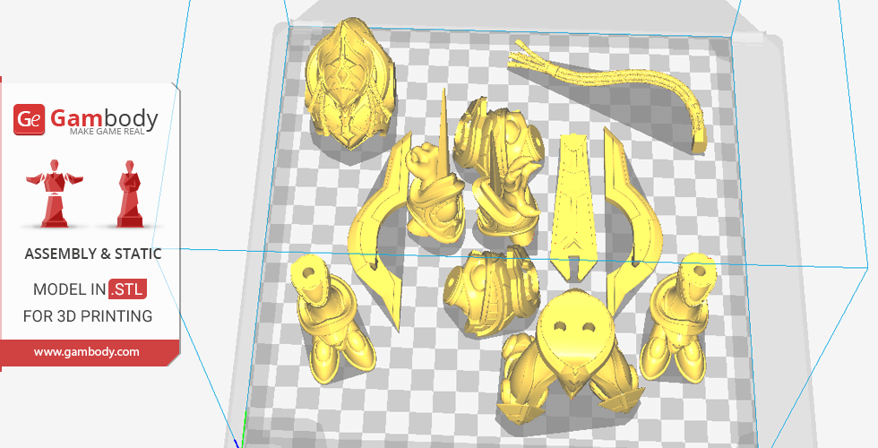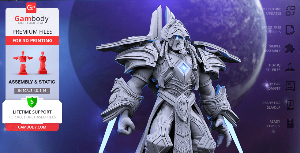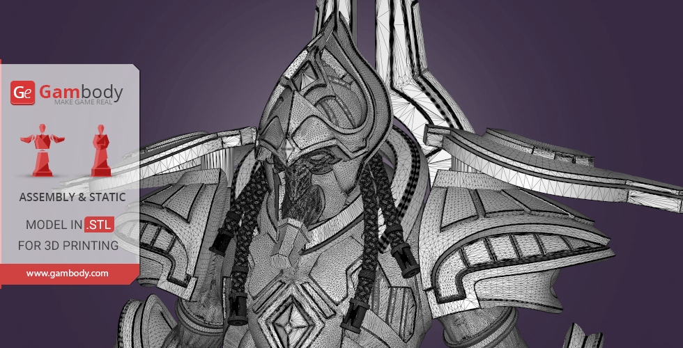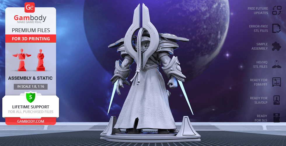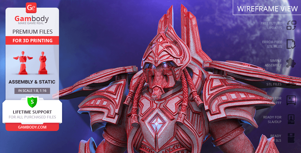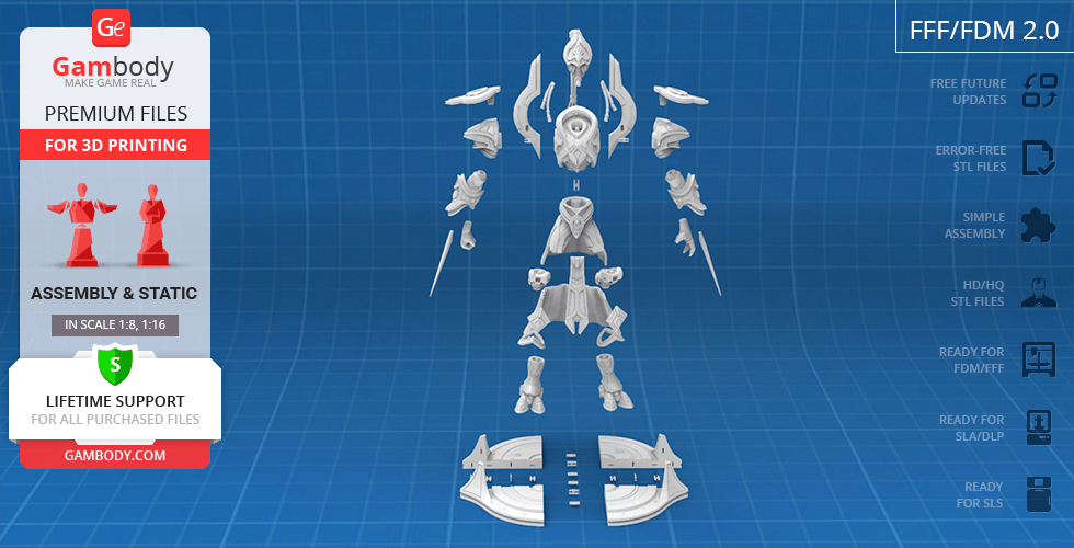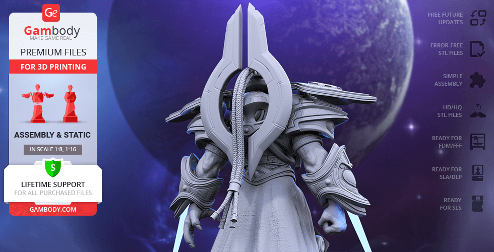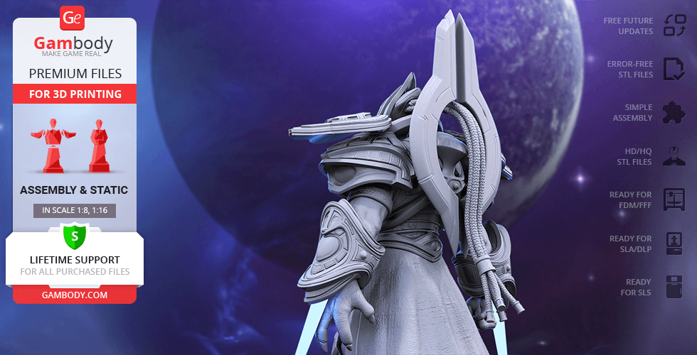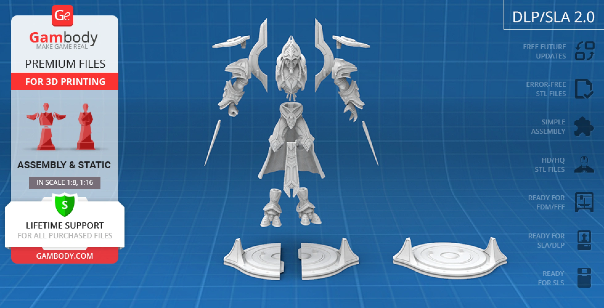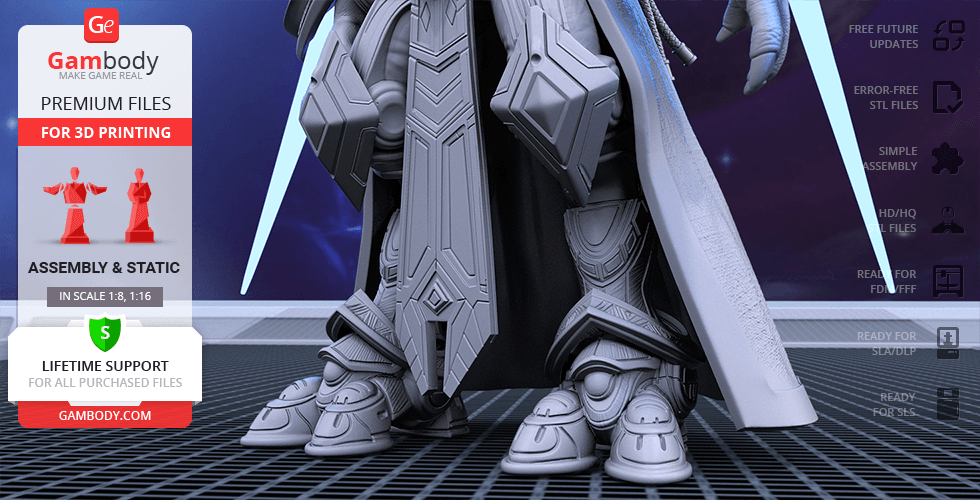 Artanis figurine for 3D printing is a static assembly model and its updating and adaptation for different types of 3D printers took Gambody team 56 hours in total. For all the StarCraft fans to print the cleanest figurine possible the model’s cutting was completely revised, the figurine was divided into assembly parts anew and adapted for different types of 3D printers taking into account the present-day technology advancements. The anatomy and body proportions of hierarch Artanis were thoroughly reviewed during the moderation process for the warrior to be depicted harmoniously in the intended pose. The model’s cutting was chosen by our team to minimise the amount of filament needed for generated support and some of the parts were hollowed out for you in the model’s Eco version to save resin. In order to ensure the smooth 3D printed result, all Artanis’ braided ponytails, the figurine's psi-blades, cloak, pauldrons, knee-caps etc. are now available as separate STL files. All the assembly parts are provided in STL files in recommended positions that were worked out so to ensure the smoothness of the details’ surfaces after printing and that the 3D printing beginners won't face difficulties when placing the parts on a build plate.