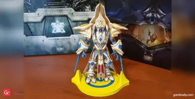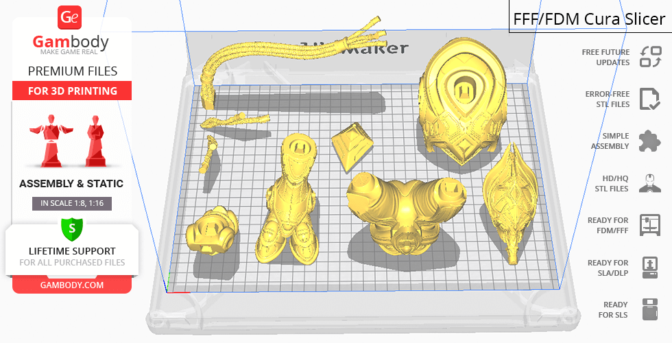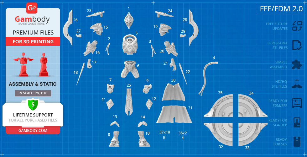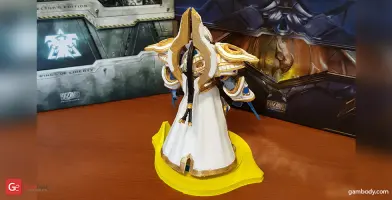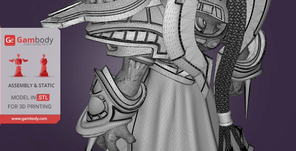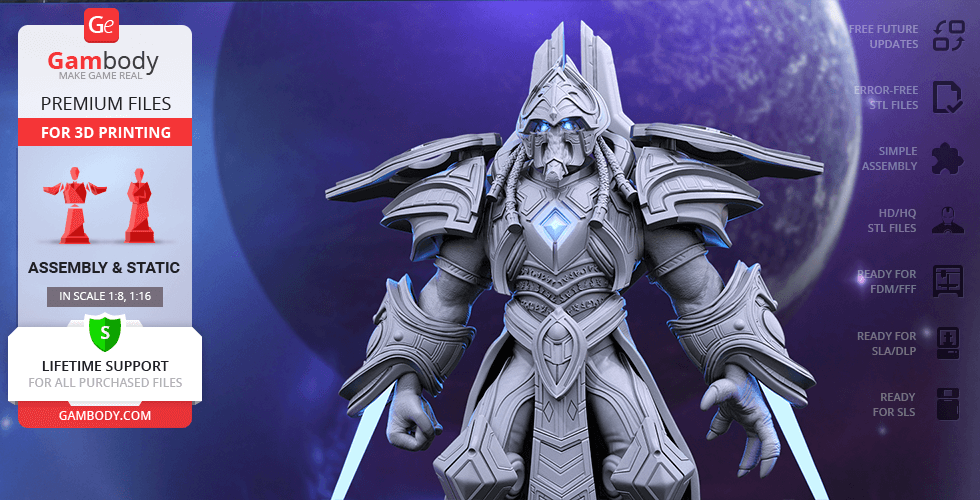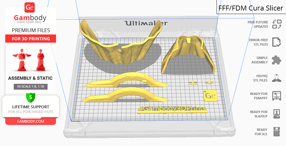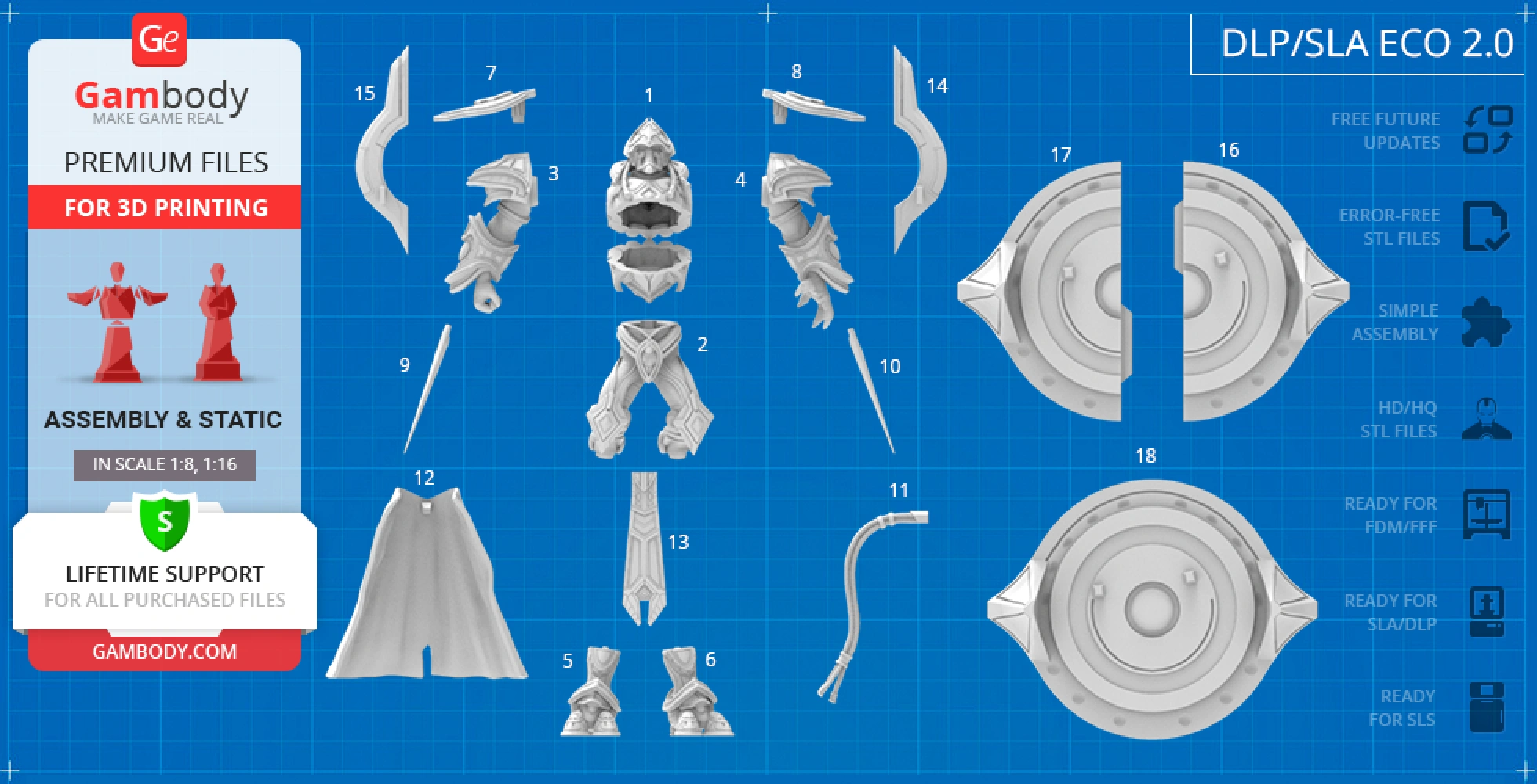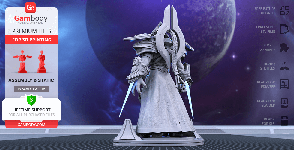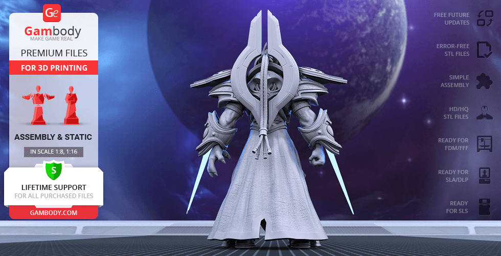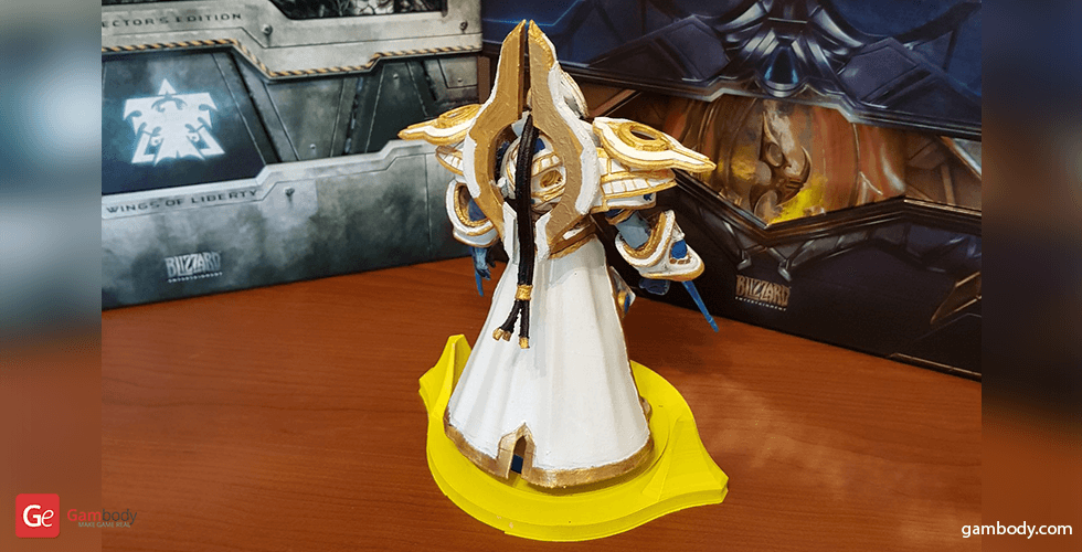 Artanis figurine for 3D printing is a static assembly model and its updating and adaptation for different types of 3D printers took Gambody team 56 hours in total. For all the StarCraft fans to print the cleanest figurine possible the model’s cutting was completely revised, the figurine was divided into assembly parts anew and adapted for different types of 3D printers taking into account the present-day technology advancements. The anatomy and body proportions of hierarch Artanis were thoroughly reviewed during the moderation process for the warrior to be depicted harmoniously in the intended pose. The model’s cutting was chosen by our team to minimise the amount of filament needed for generated support and some of the parts were hollowed out for you in the model’s Eco version to save resin. In order to ensure the smooth 3D printed result, all Artanis’ braided ponytails, the figurine's psi-blades, cloak, pauldrons, knee-caps etc. are now available as separate STL files. All the assembly parts are provided in STL files in recommended positions that were worked out so to ensure the smoothness of the details’ surfaces after printing and that the 3D printing beginners won't face difficulties when placing the parts on a build plate.