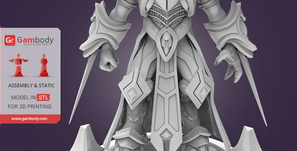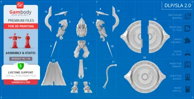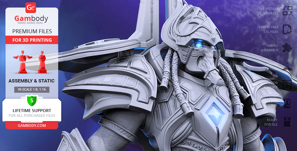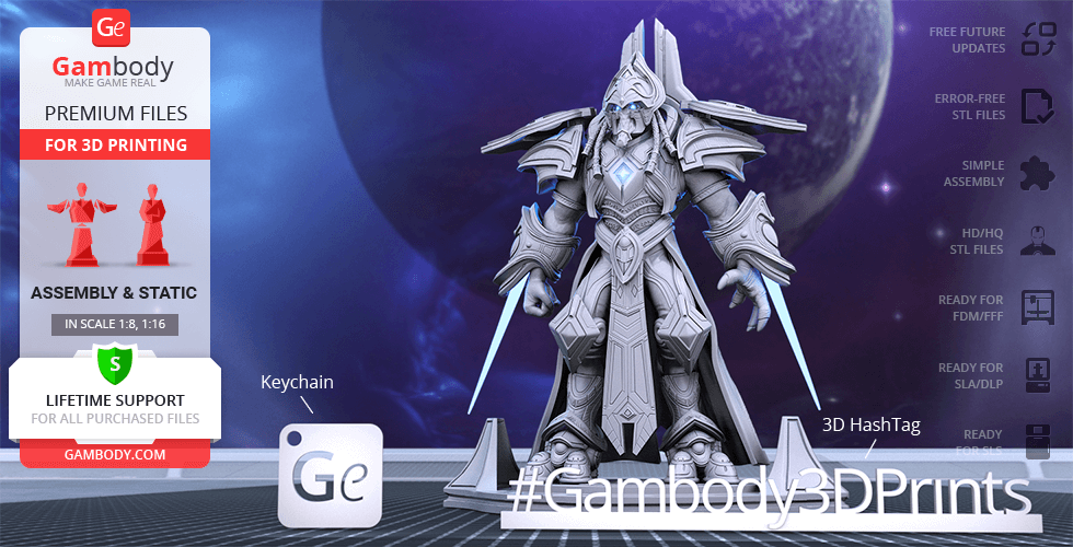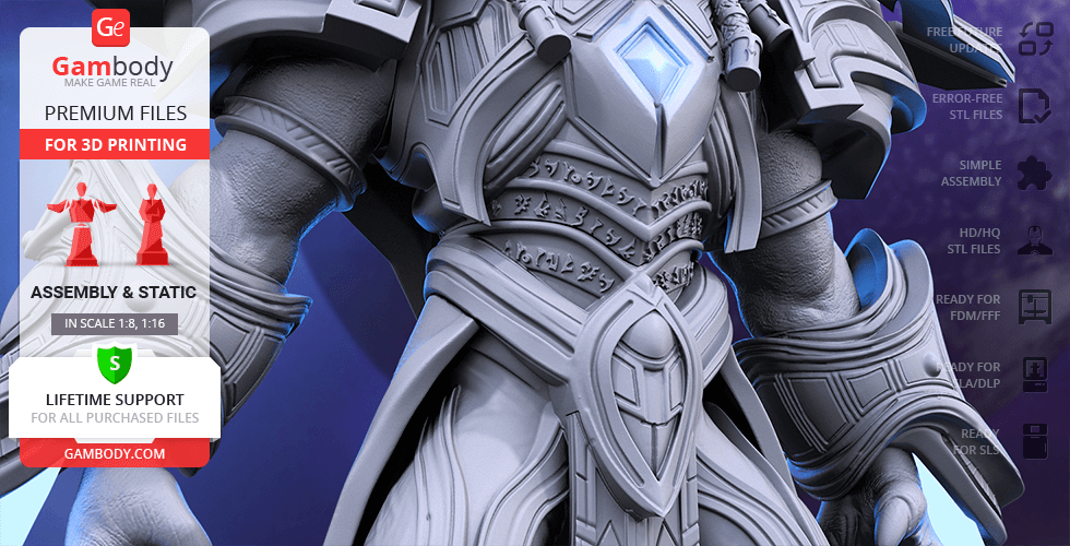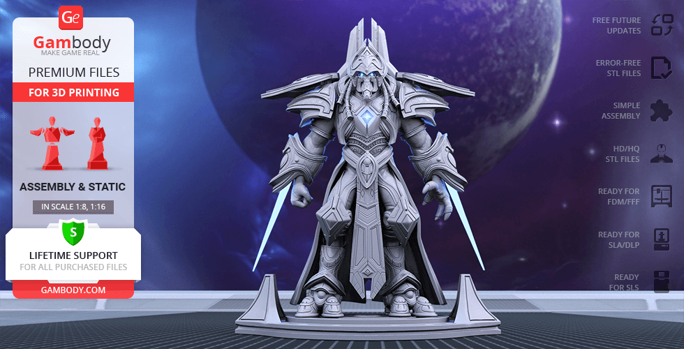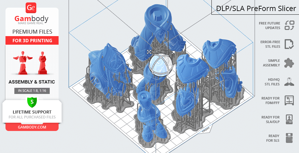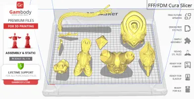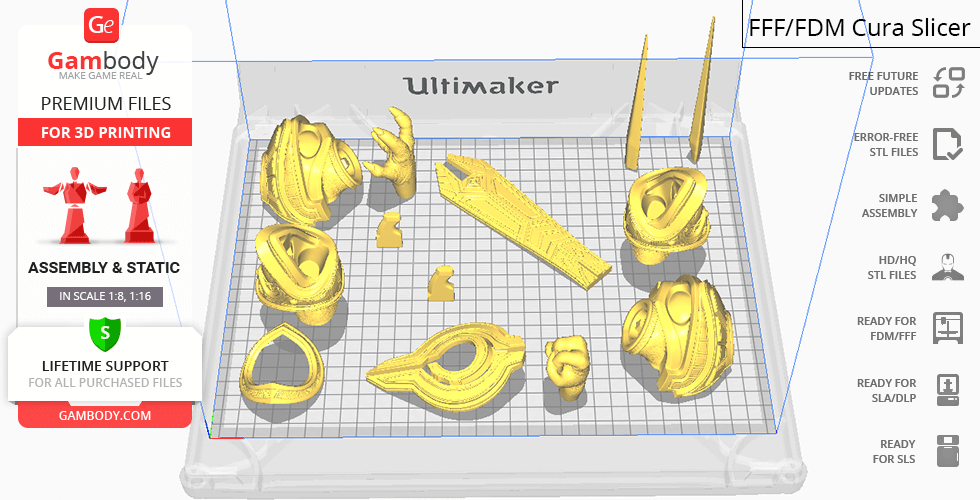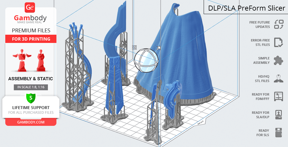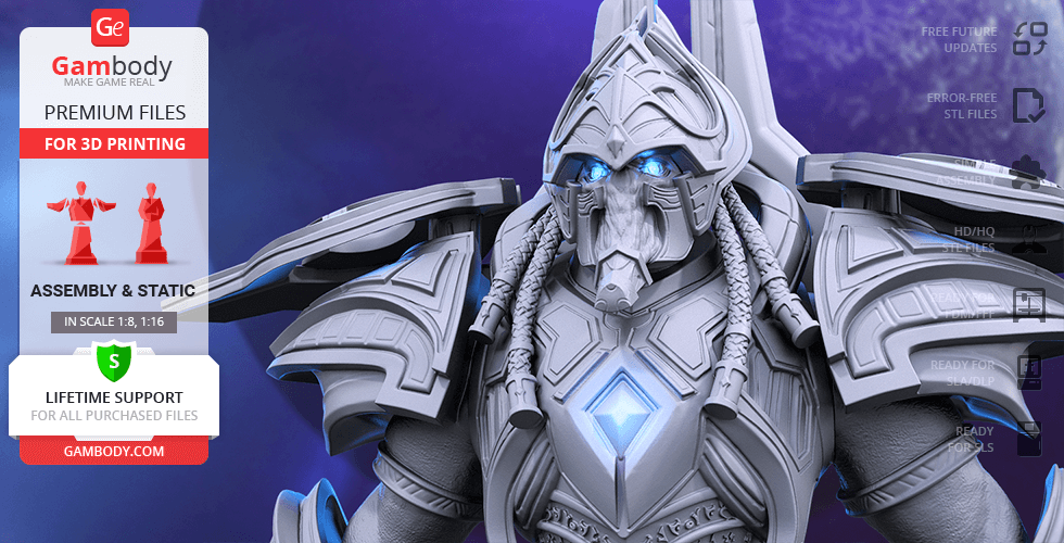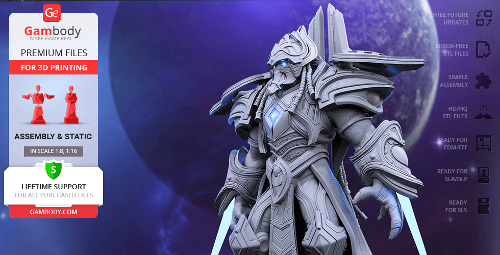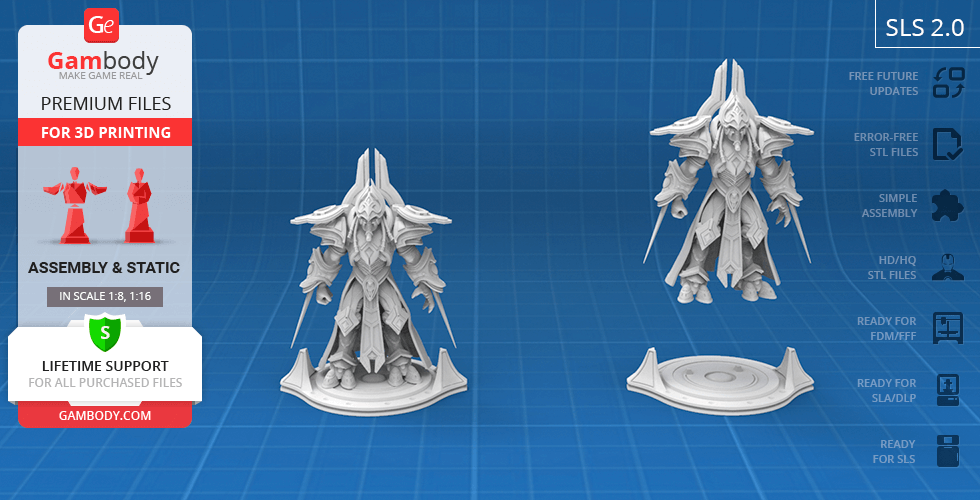 Artanis figurine for 3D printing is a static assembly model and its updating and adaptation for different types of 3D printers took Gambody team 56 hours in total. For all the StarCraft fans to print the cleanest figurine possible the model’s cutting was completely revised, the figurine was divided into assembly parts anew and adapted for different types of 3D printers taking into account the present-day technology advancements. The anatomy and body proportions of hierarch Artanis were thoroughly reviewed during the moderation process for the warrior to be depicted harmoniously in the intended pose. The model’s cutting was chosen by our team to minimise the amount of filament needed for generated support and some of the parts were hollowed out for you in the model’s Eco version to save resin. In order to ensure the smooth 3D printed result, all Artanis’ braided ponytails, the figurine's psi-blades, cloak, pauldrons, knee-caps etc. are now available as separate STL files. All the assembly parts are provided in STL files in recommended positions that were worked out so to ensure the smoothness of the details’ surfaces after printing and that the 3D printing beginners won't face difficulties when placing the parts on a build plate.