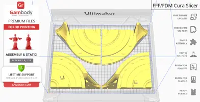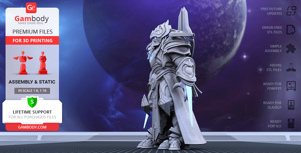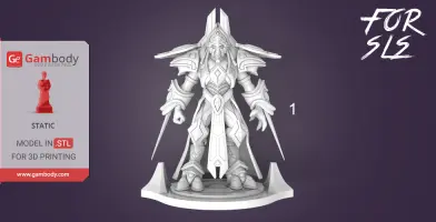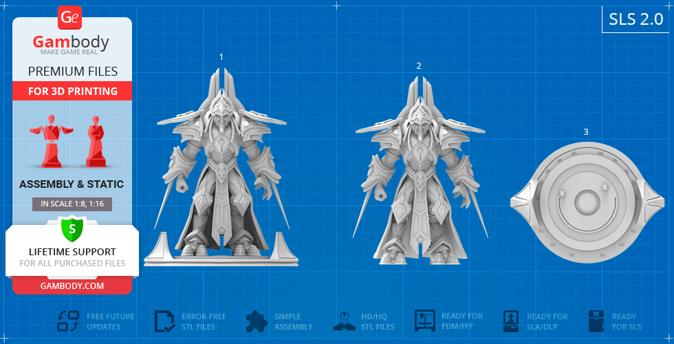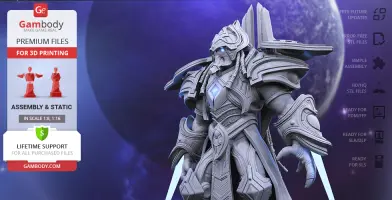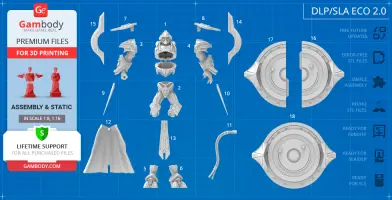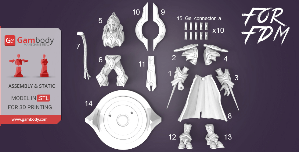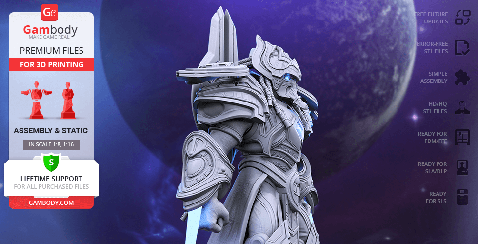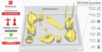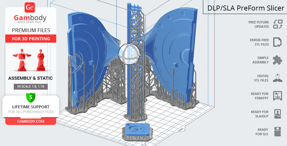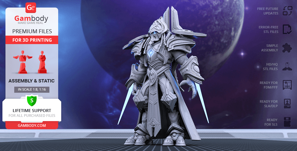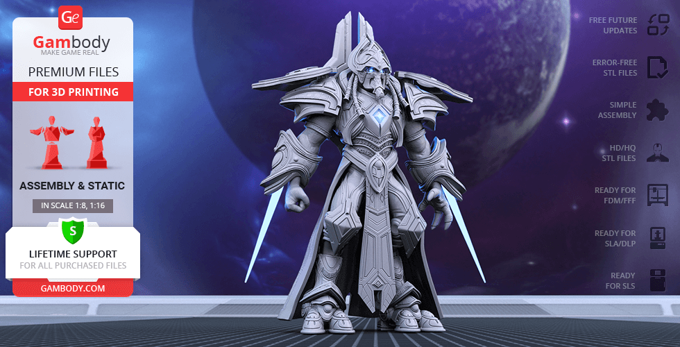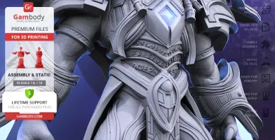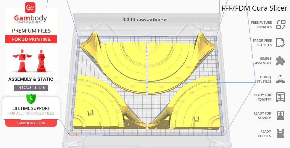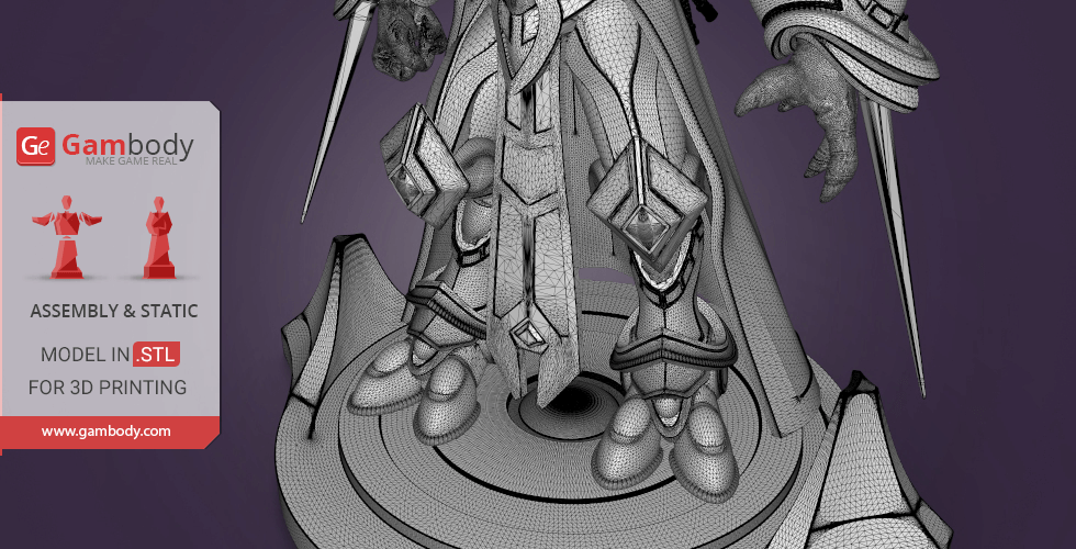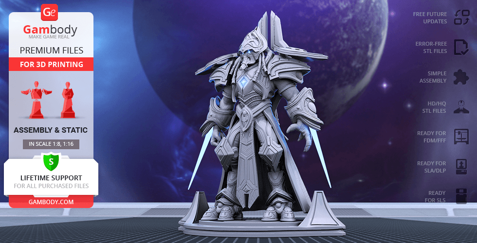 Artanis figurine for 3D printing is a static assembly model and its updating and adaptation for different types of 3D printers took Gambody team 56 hours in total. For all the StarCraft fans to print the cleanest figurine possible the model’s cutting was completely revised, the figurine was divided into assembly parts anew and adapted for different types of 3D printers taking into account the present-day technology advancements. The anatomy and body proportions of hierarch Artanis were thoroughly reviewed during the moderation process for the warrior to be depicted harmoniously in the intended pose. The model’s cutting was chosen by our team to minimise the amount of filament needed for generated support and some of the parts were hollowed out for you in the model’s Eco version to save resin. In order to ensure the smooth 3D printed result, all Artanis’ braided ponytails, the figurine's psi-blades, cloak, pauldrons, knee-caps etc. are now available as separate STL files. All the assembly parts are provided in STL files in recommended positions that were worked out so to ensure the smoothness of the details’ surfaces after printing and that the 3D printing beginners won't face difficulties when placing the parts on a build plate.