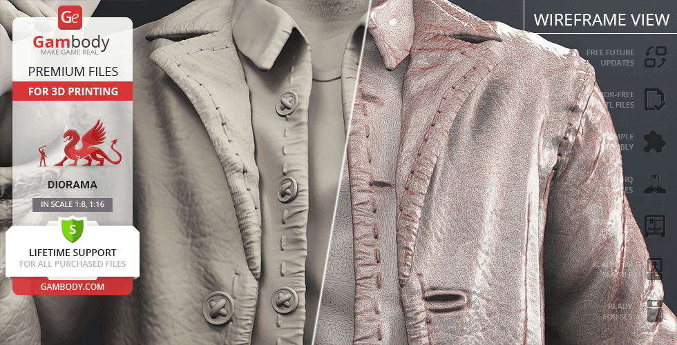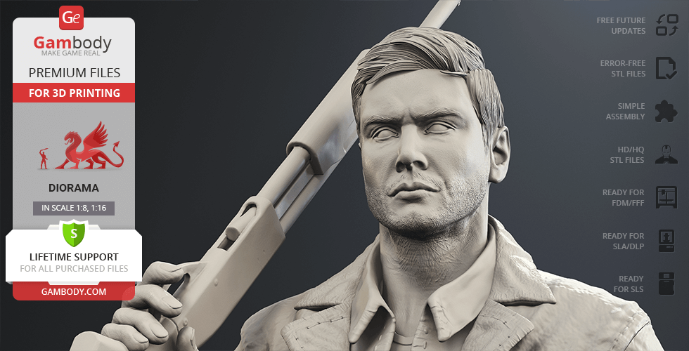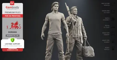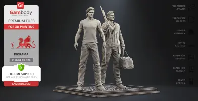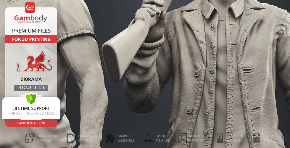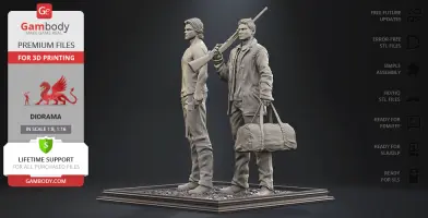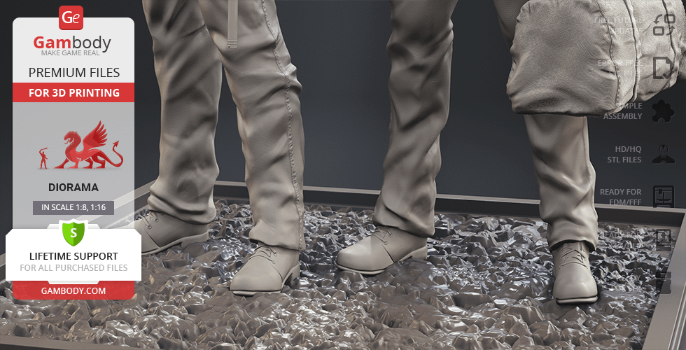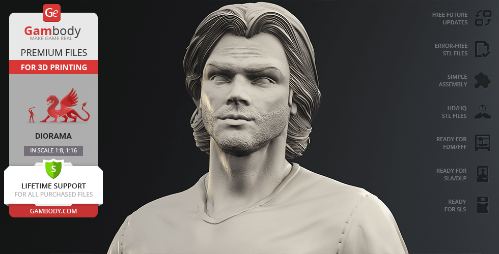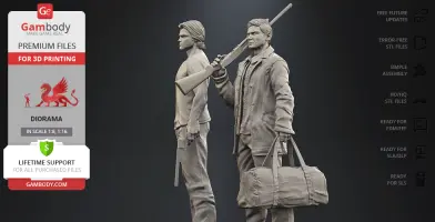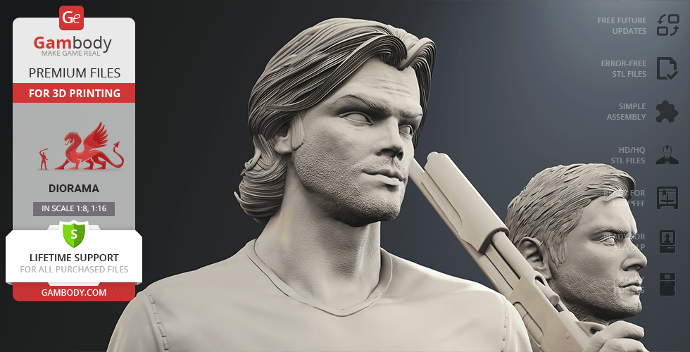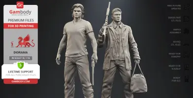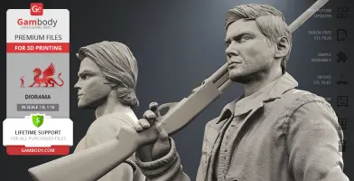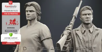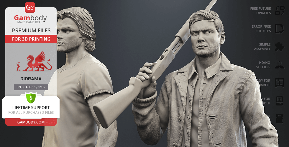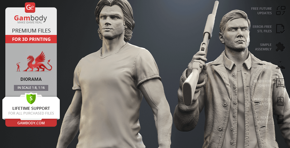 Inspired by the beloved by spectators adventure television series, our contributing 3D artists created this great 3D printing diorama. The appearance of both protagonists is made with great mastery—the recognizable hairstyles of the brothers, their physique and their facial shape, even the stubble on their faces, the author has thought through the design of the models down to the finest detail. The chosen positions of Sam and Dean speak of the decisiveness and fearlessness of hunters. Equipped with a scoped rifle and Colt and enlisting the support of each other, this couple is ready to confront the most evil enemies of all time! But who said that they don’t need an ally?