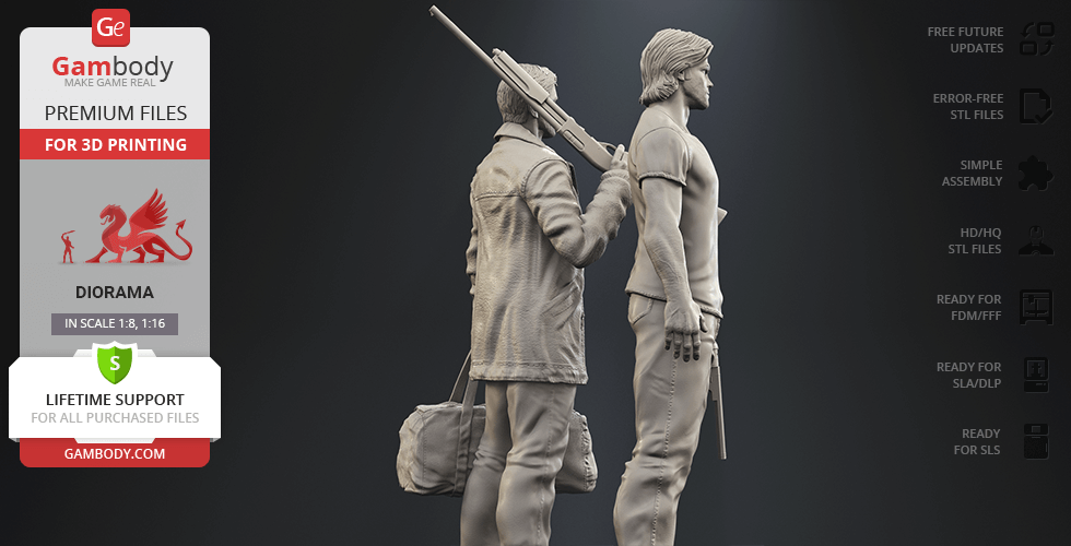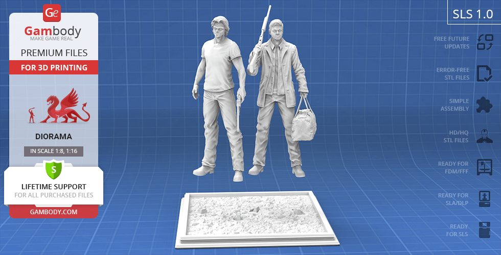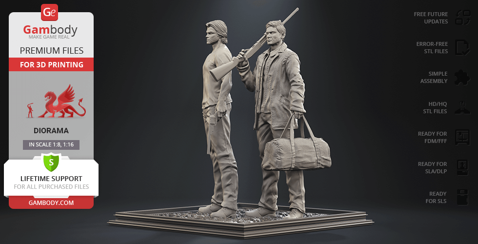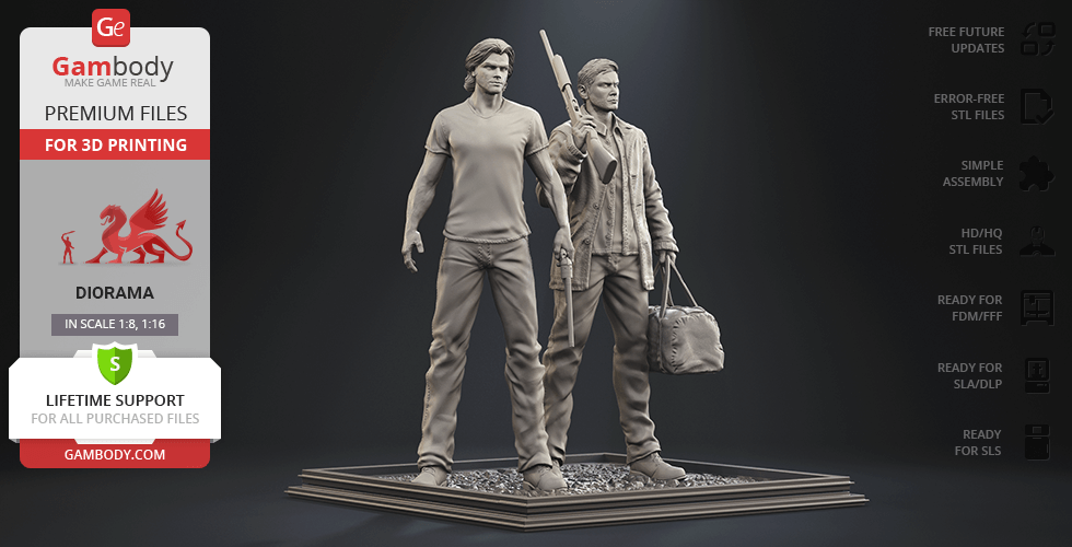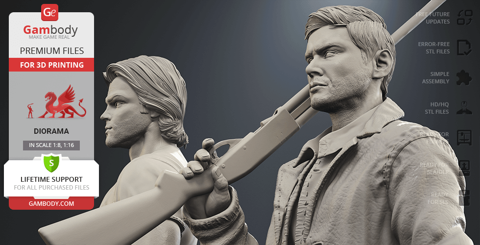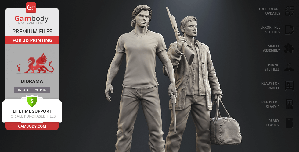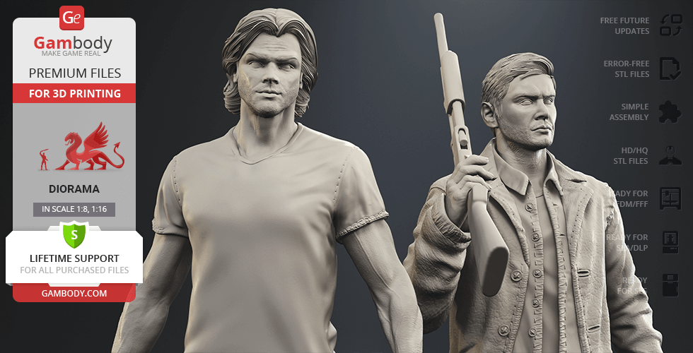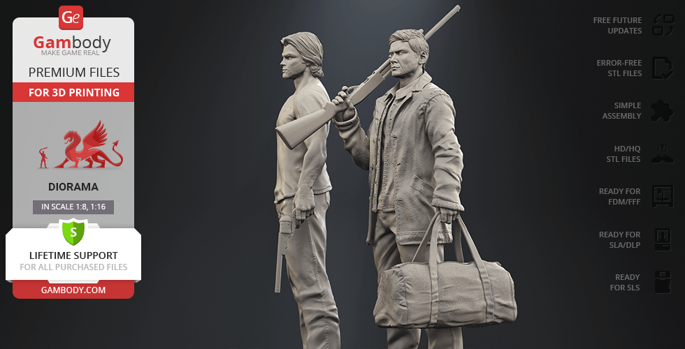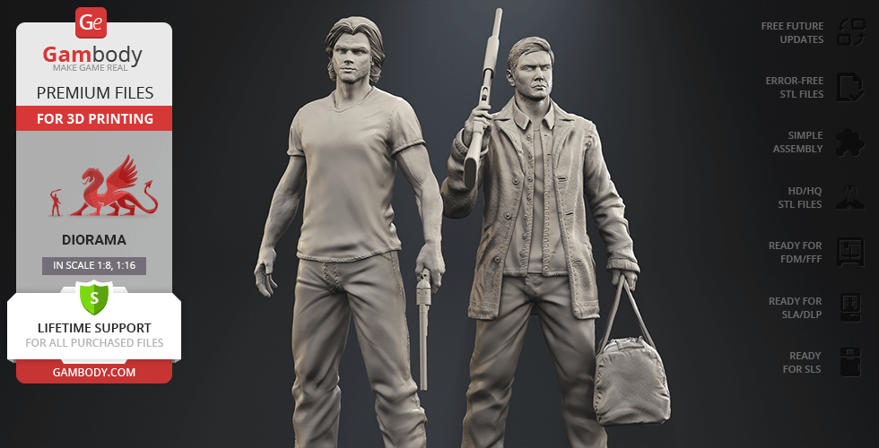 - 4 versions of Supernatural Sam & Dean diorama STL files for FFF/FDM, DLP/SLA, DLP/SLA Eco, and SLS — files for all versions are available for download after the purchase;