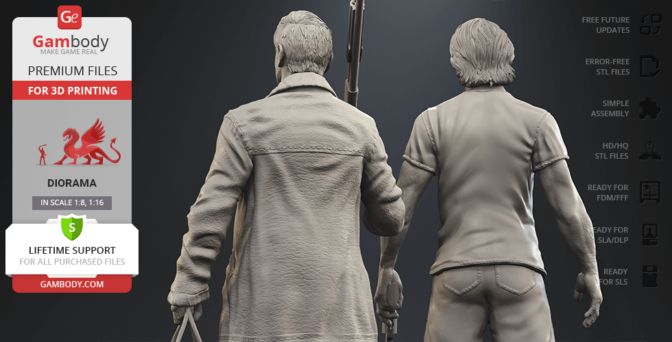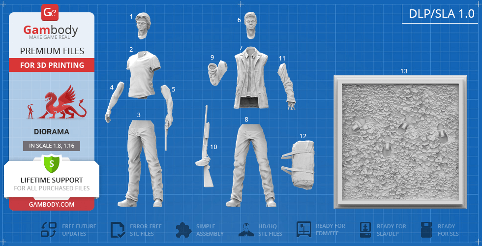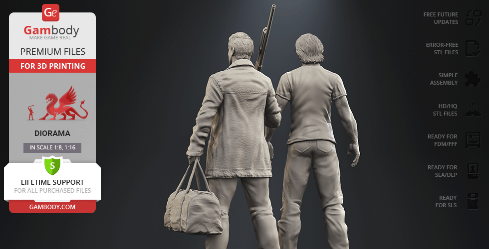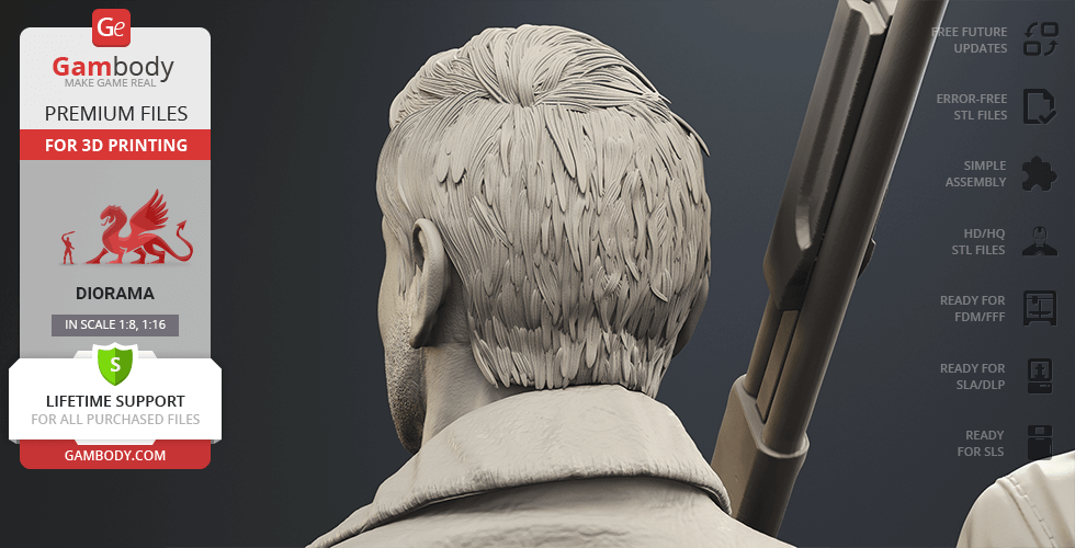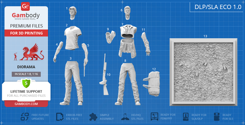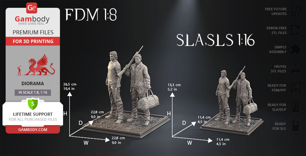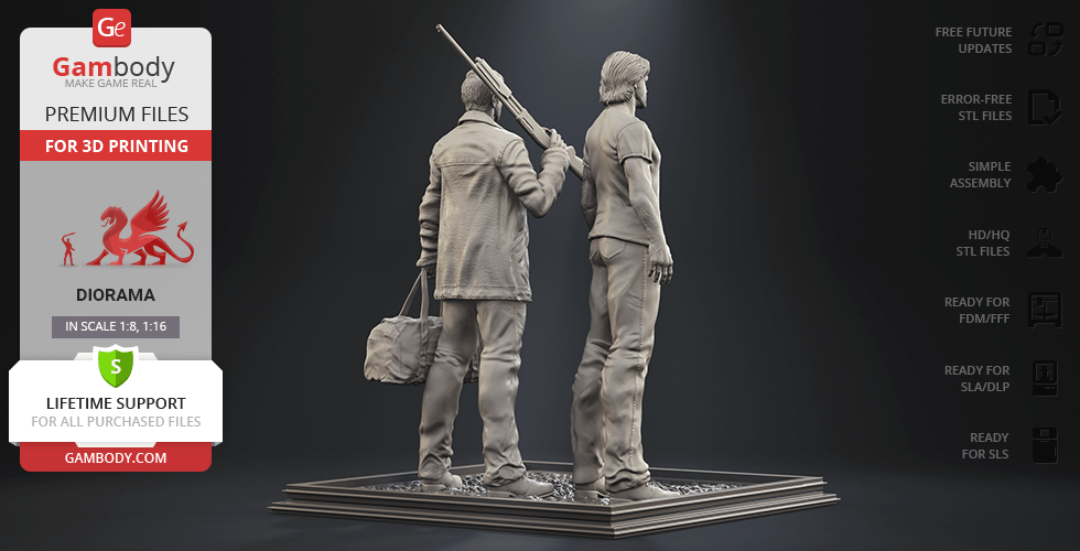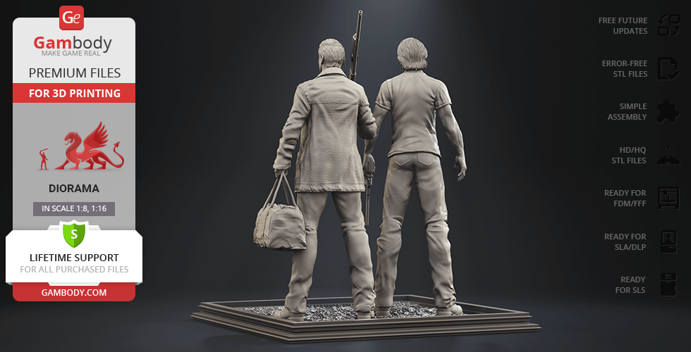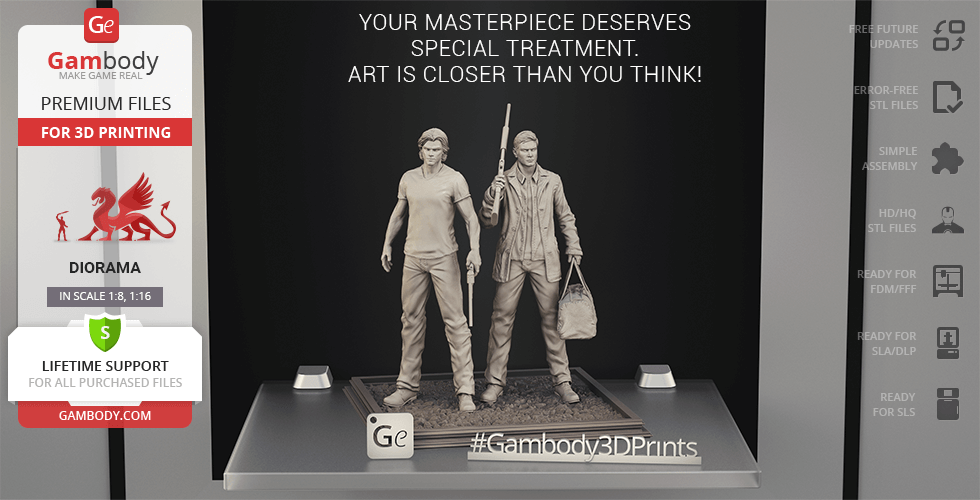 - 4 versions of Supernatural Sam & Dean diorama STL files for FFF/FDM, DLP/SLA, DLP/SLA Eco, and SLS — files for all versions are available for download after the purchase;