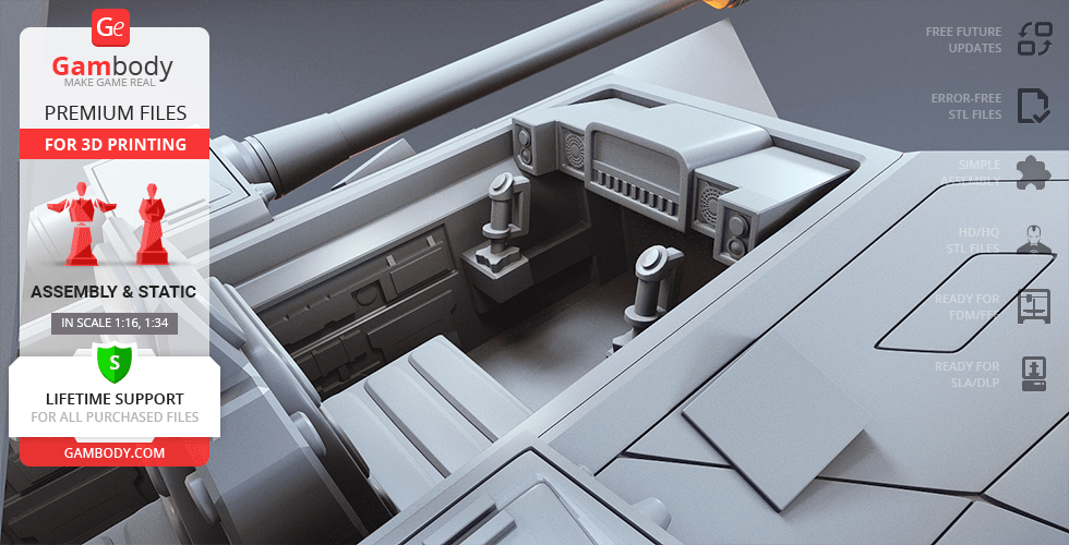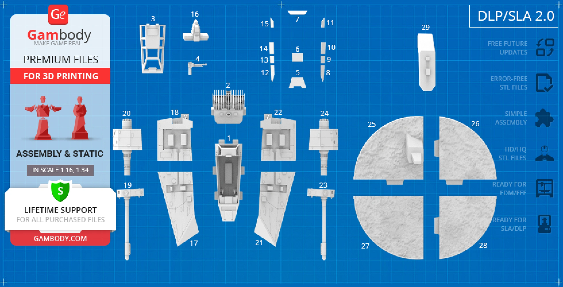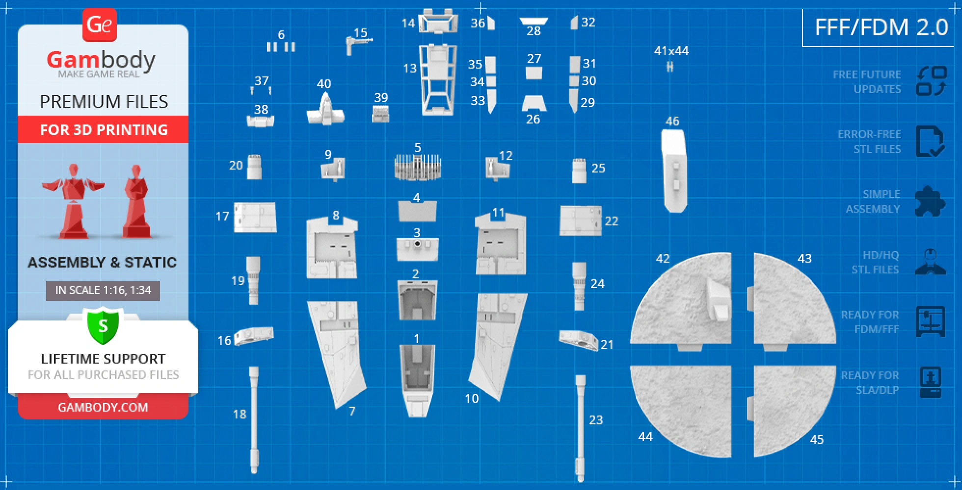 All assembly parts are provided in STL files in recommended positions that were worked out in order to ensure the smoothness of the details’ surfaces after printing and that the 3D printing beginners won't face difficulties when placing the parts on a build plate. When downloading any model's file you will also receive "Assembly Manual" for FFF/FDM 2.0 and DLP/SLA/SLS 1.0 versions in PDF format.