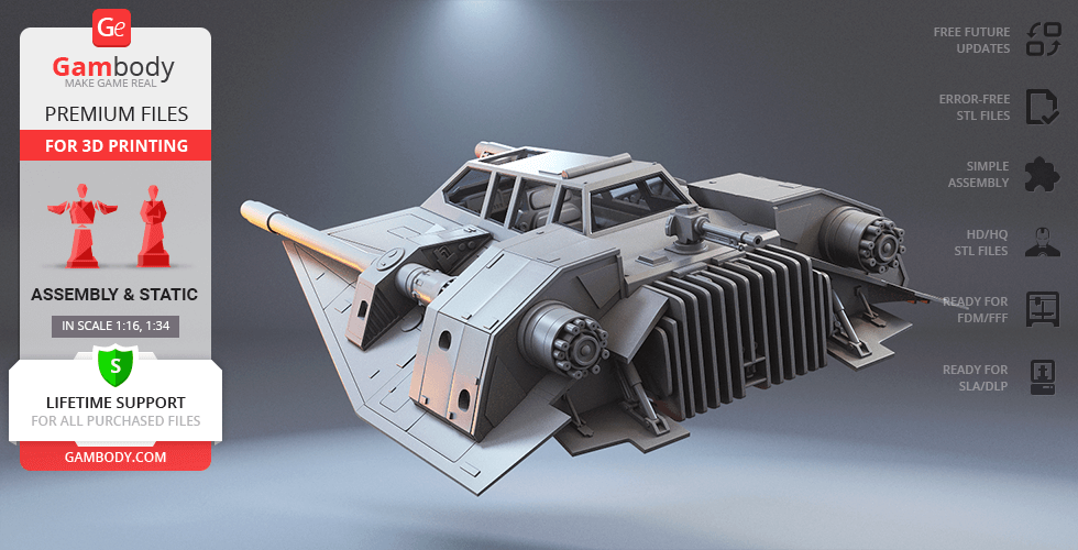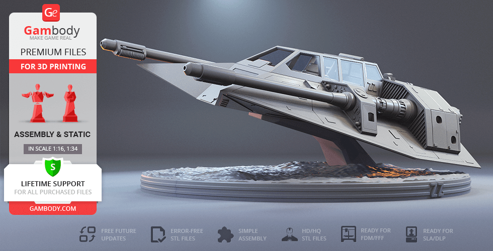 T-47 Snowspeeder for 3D printing is a static assembly model and its updating and adaptation for different types of 3D printers took Gambody team 50 hours in total. Due to the fact that this model was first released on Gambody back in 2017, for all Star Wars fans to print the best Rebels’ iconic fighter possible, the model was upgraded from the ground up, cut into assembly parts anew, and adapted for different types of 3D printers taking into account the present-day technology advancements.