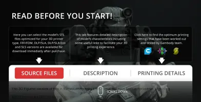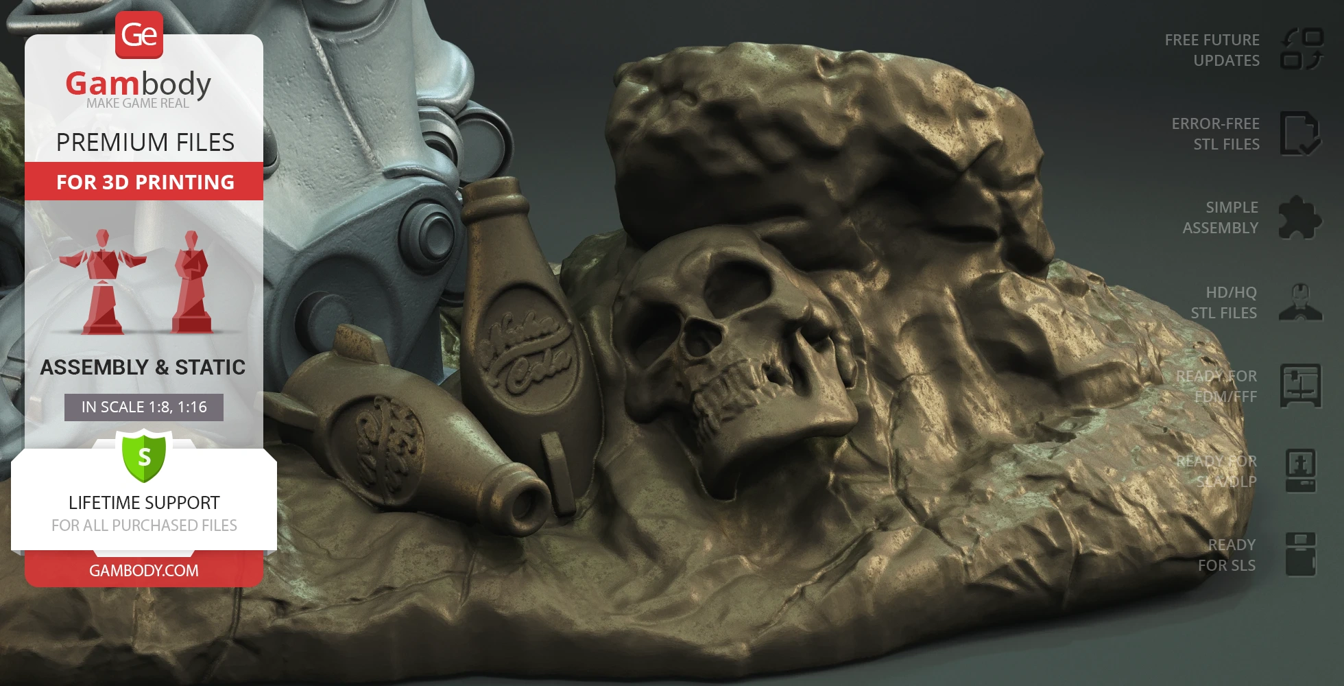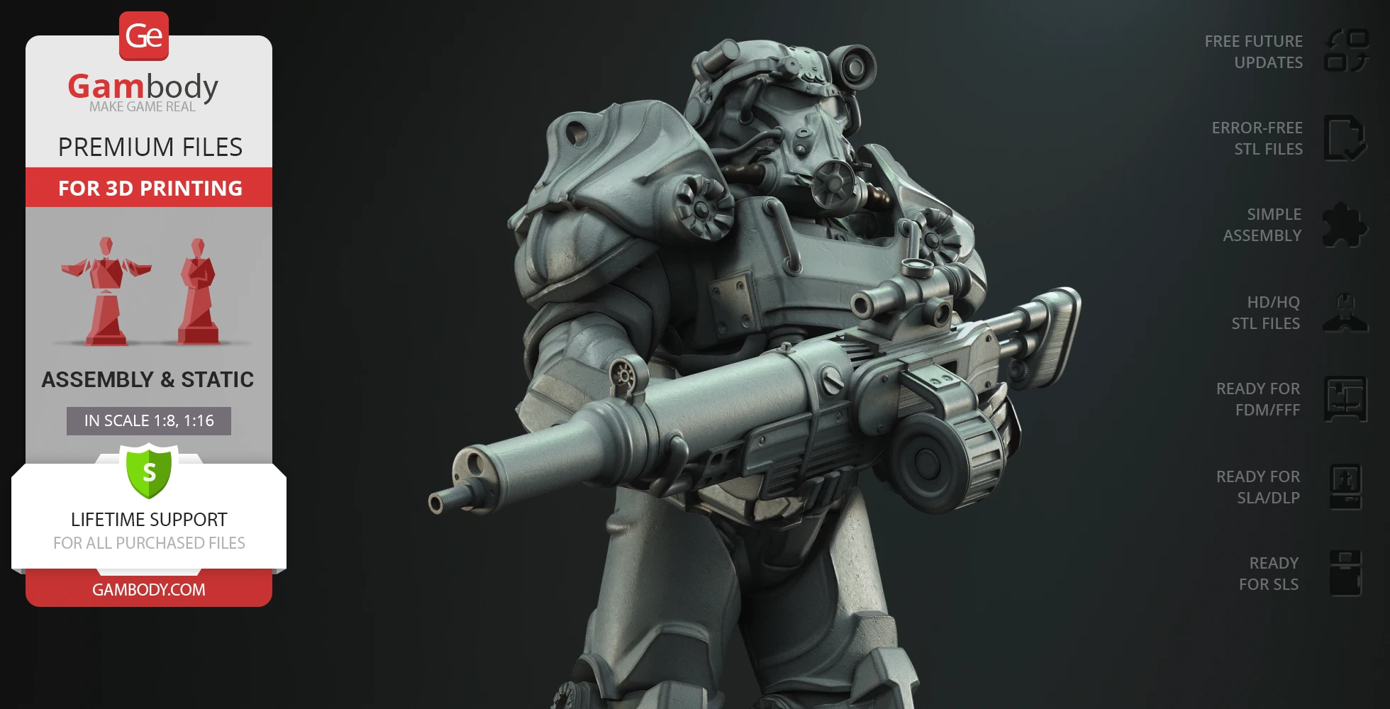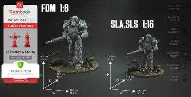 • The model is available in recommended scales of 1:8 for the FFF/FDM version and 1:16 for the DLP/SLA/SLS versions, based on the 2.2-meter height of the T-60 Power Armor Suit.