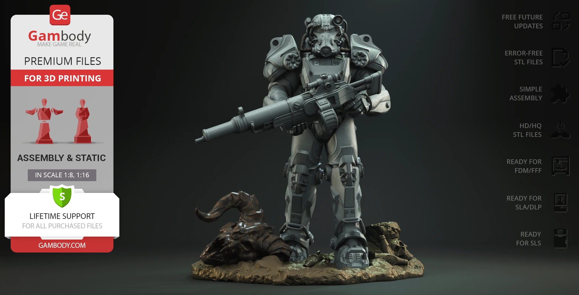 • STL files of high-poly T-60 Power Armor model for 3D printing consist of 56 files;