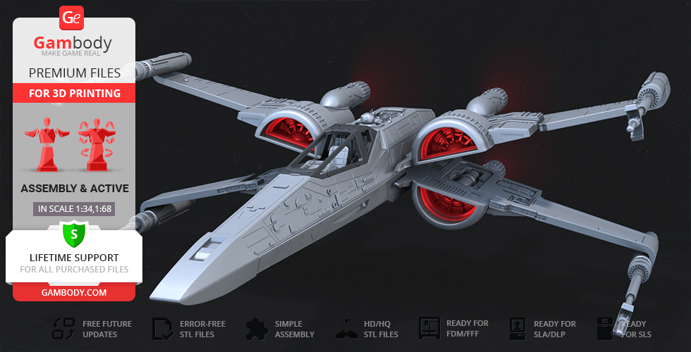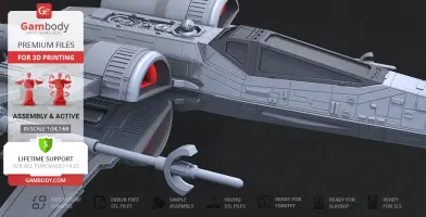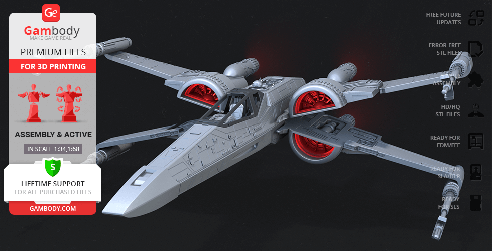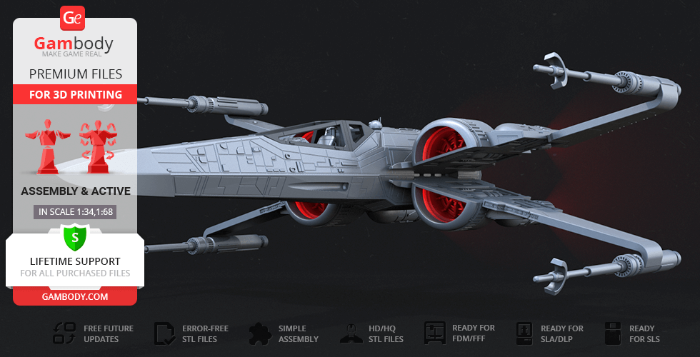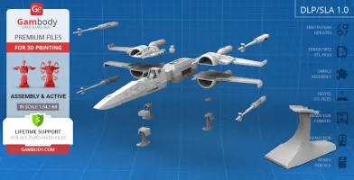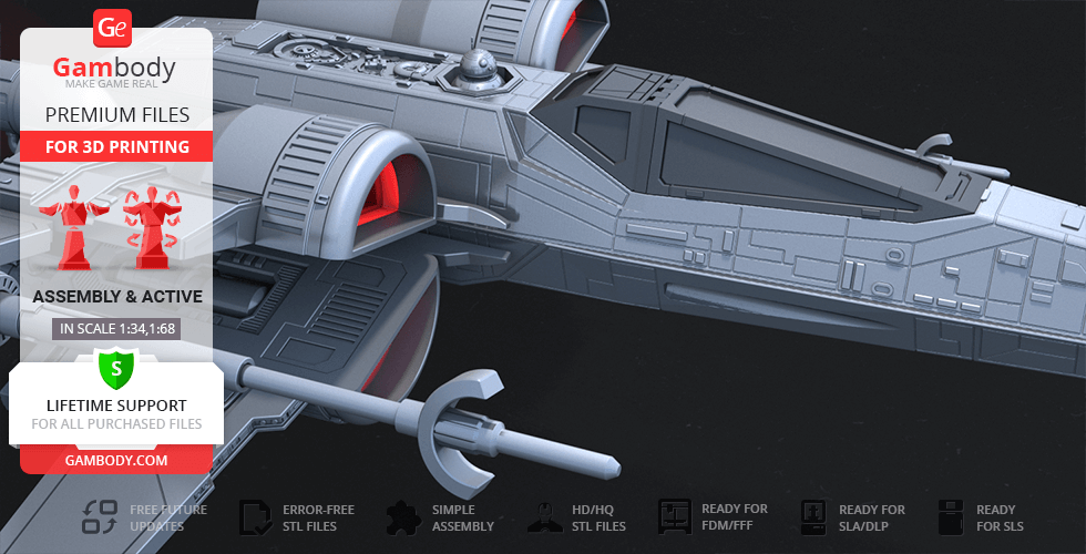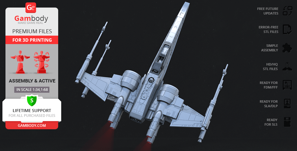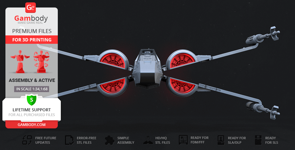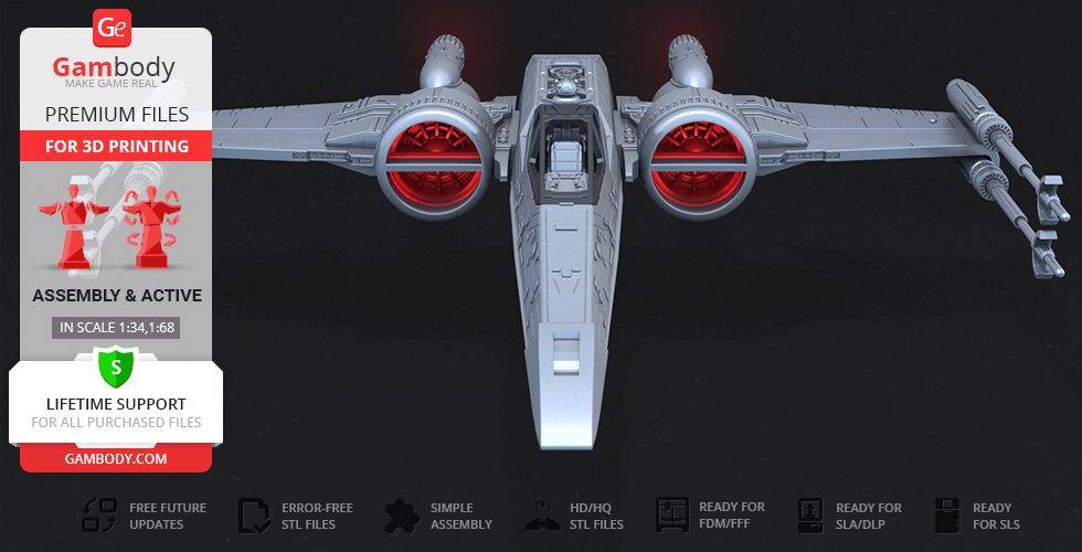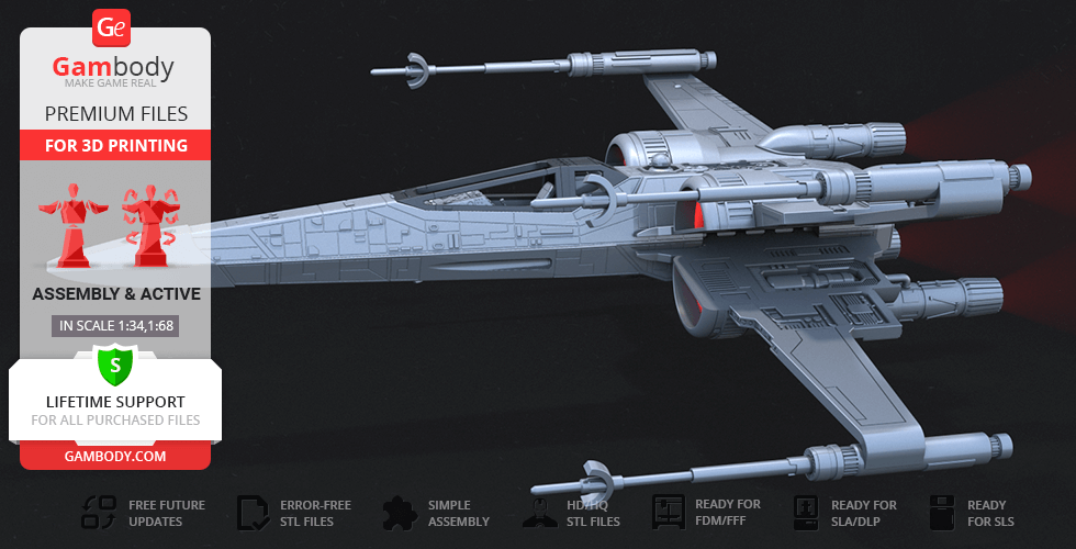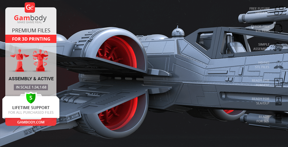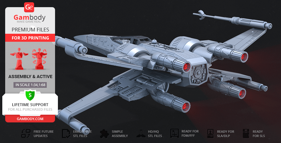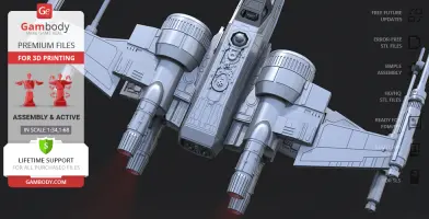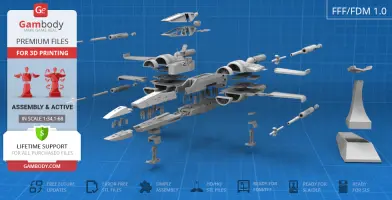 T-70 X-Wing model for 3D printing is an articulated assembly model and its moderation and adaptation for different types of 3D printers took Gambody team 35 hours in total. The model’s cutting was chosen to minimise the amount of filament needed for generated support. Moreover, for you to receive the cleanest printing result possible the starfighter was divided into many assembly parts, e.g. laser cannons, proton torpedo launchers, landing gear parts and even BB-8 astromech who occupies his designated place are provided as separate STL files. For you to display the X-Wing model among your starships collection there is a platform, though its usage is optional - you can also assemble the fighter with landing gear instead of using caps. The model’s wings can fold and unfold and X-Wing’s canopy is also articulated for you to display the starfighter in different modes. There can also be found special tunnels throughout the whole model that were designed by our team for you to easily introduce LED wiring. All the assembly parts are provided in STL files in recommended positions that were worked out so to ensure the smoothness of the details’ surfaces after printing and so that the 3D printing beginners won't face difficulties when placing the parts on a build plate.