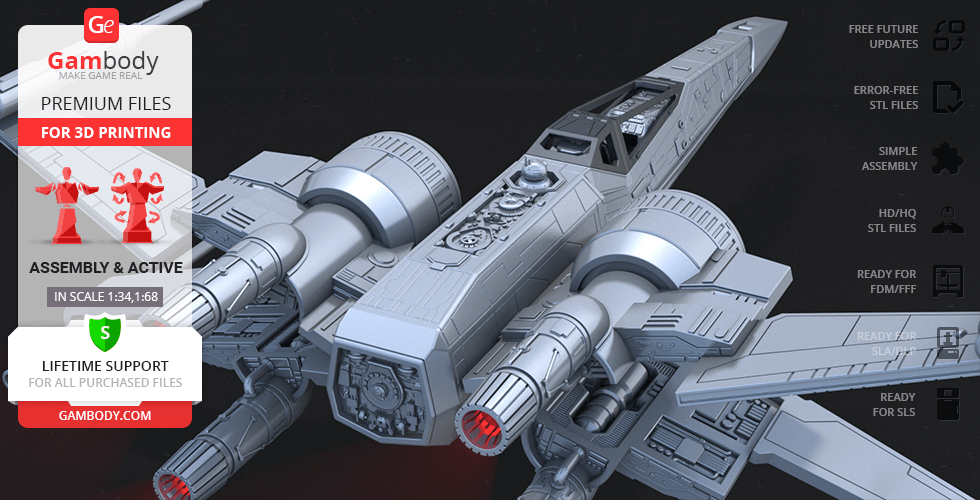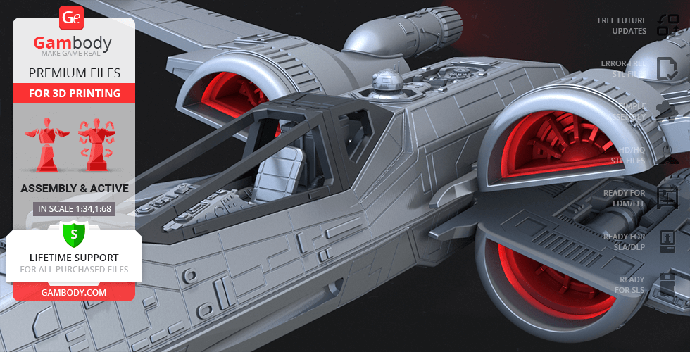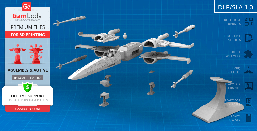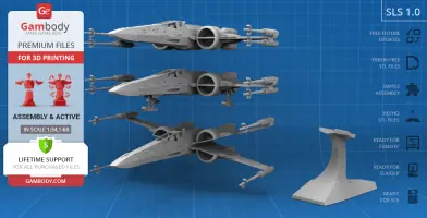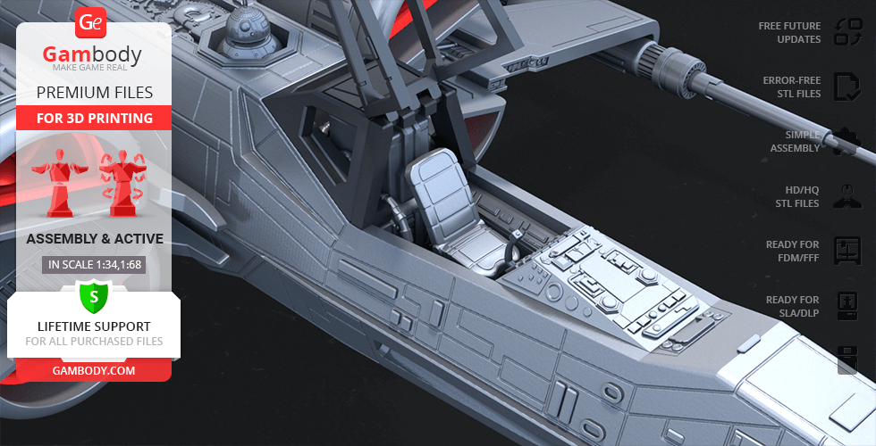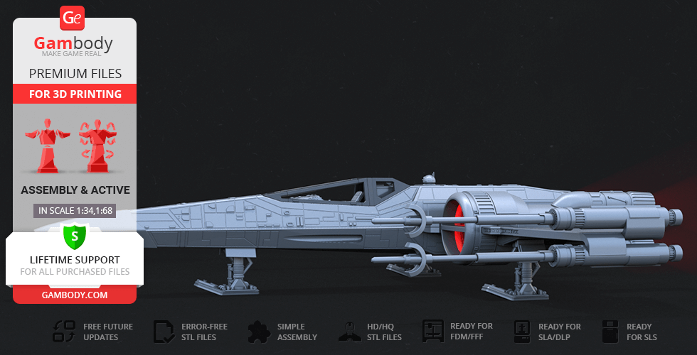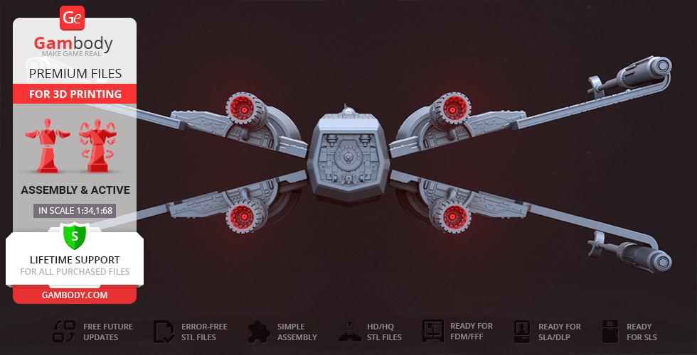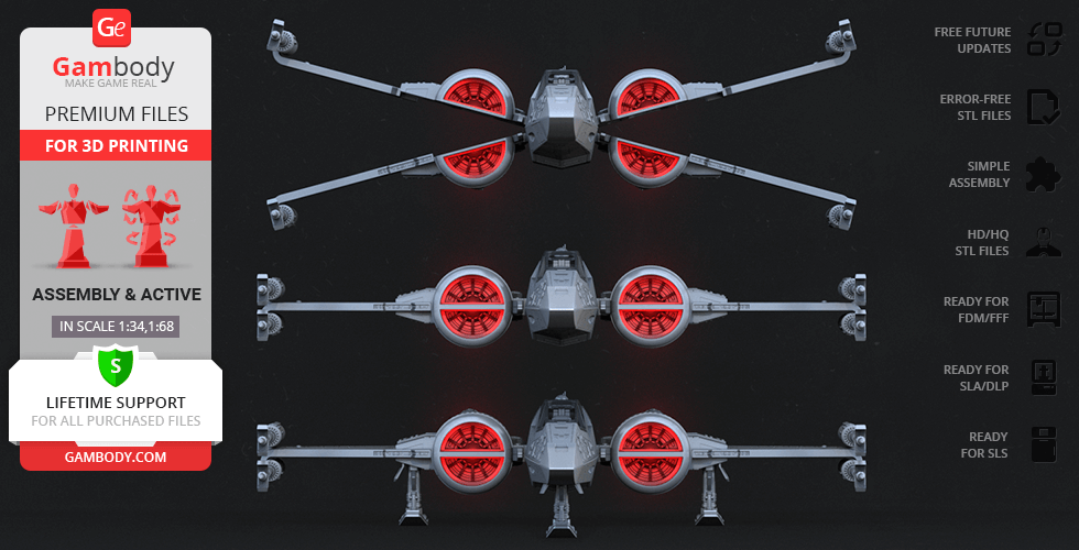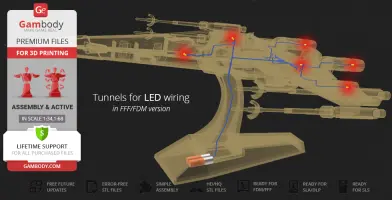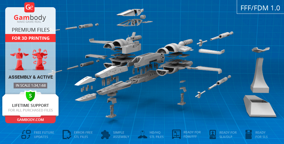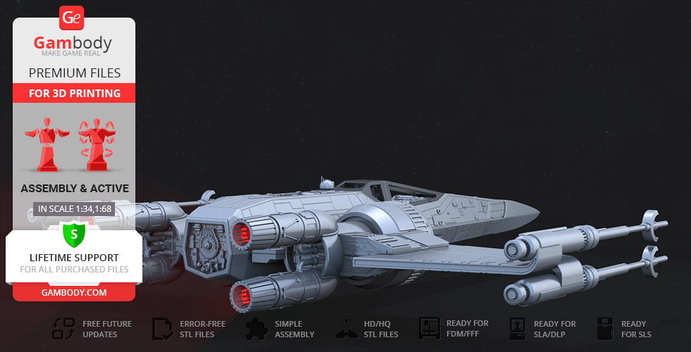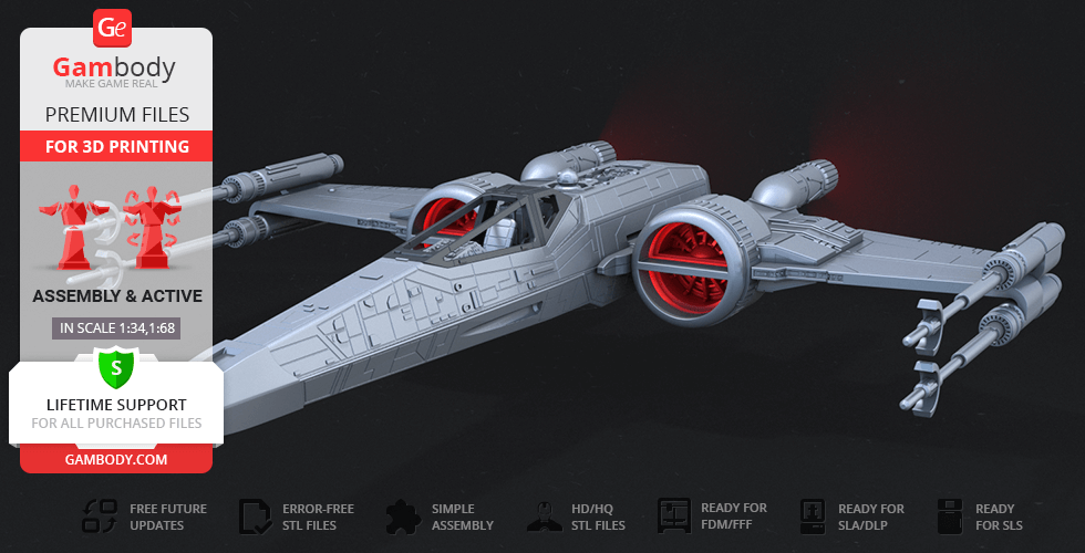 T-70 X-Wing model for 3D printing is an articulated assembly model and its moderation and adaptation for different types of 3D printers took Gambody team 35 hours in total. The model’s cutting was chosen to minimise the amount of filament needed for generated support. Moreover, for you to receive the cleanest printing result possible the starfighter was divided into many assembly parts, e.g. laser cannons, proton torpedo launchers, landing gear parts and even BB-8 astromech who occupies his designated place are provided as separate STL files. For you to display the X-Wing model among your starships collection there is a platform, though its usage is optional - you can also assemble the fighter with landing gear instead of using caps. The model’s wings can fold and unfold and X-Wing’s canopy is also articulated for you to display the starfighter in different modes. There can also be found special tunnels throughout the whole model that were designed by our team for you to easily introduce LED wiring. All the assembly parts are provided in STL files in recommended positions that were worked out so to ensure the smoothness of the details’ surfaces after printing and so that the 3D printing beginners won't face difficulties when placing the parts on a build plate.