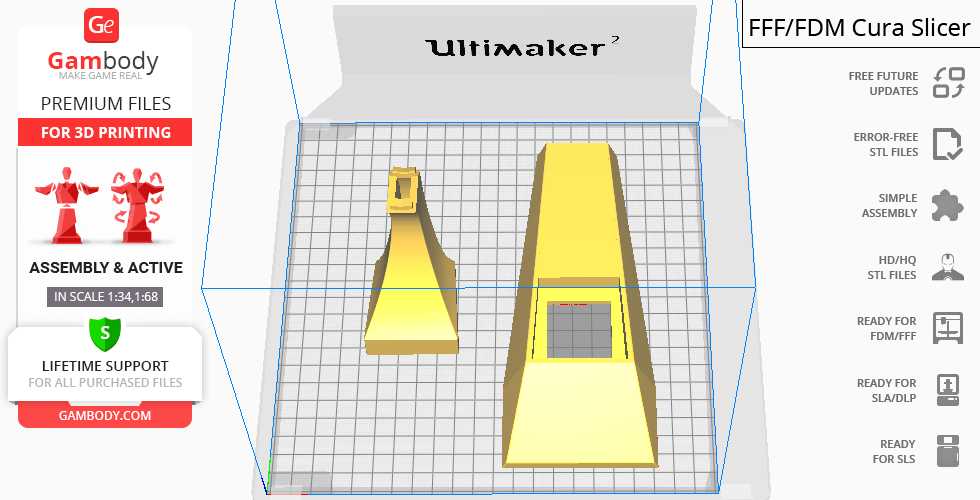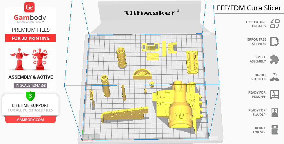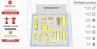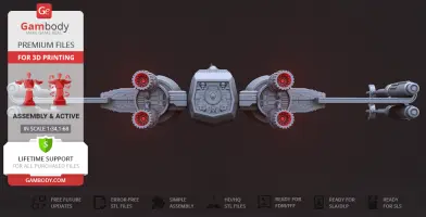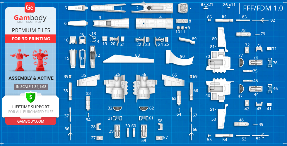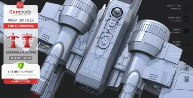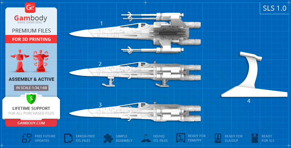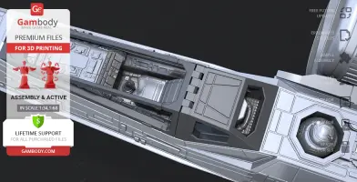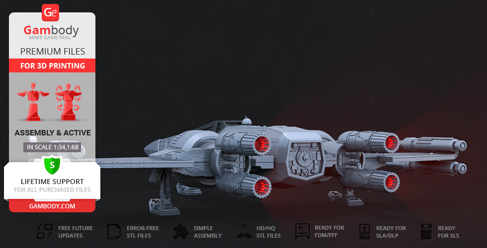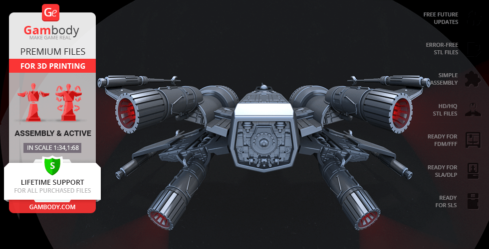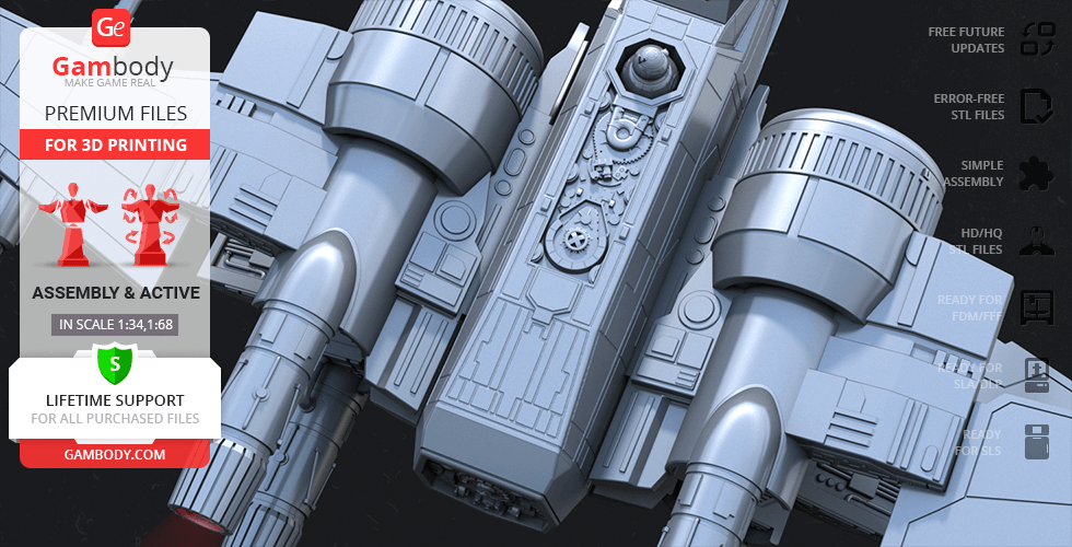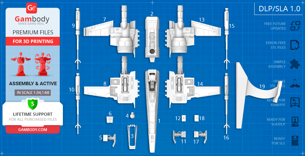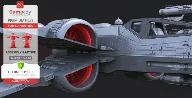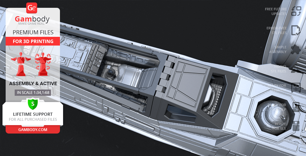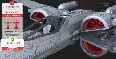 T-70 X-Wing model for 3D printing is an articulated assembly model and its moderation and adaptation for different types of 3D printers took Gambody team 35 hours in total. The model’s cutting was chosen to minimise the amount of filament needed for generated support. Moreover, for you to receive the cleanest printing result possible the starfighter was divided into many assembly parts, e.g. laser cannons, proton torpedo launchers, landing gear parts and even BB-8 astromech who occupies his designated place are provided as separate STL files. For you to display the X-Wing model among your starships collection there is a platform, though its usage is optional - you can also assemble the fighter with landing gear instead of using caps. The model’s wings can fold and unfold and X-Wing’s canopy is also articulated for you to display the starfighter in different modes. There can also be found special tunnels throughout the whole model that were designed by our team for you to easily introduce LED wiring. All the assembly parts are provided in STL files in recommended positions that were worked out so to ensure the smoothness of the details’ surfaces after printing and so that the 3D printing beginners won't face difficulties when placing the parts on a build plate.