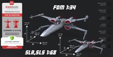 The model's scale was calculated from the T-70 X-Wing's actual length that is 12480 mm. The 3D printing model's chosen scale is 1/34 for the FFF/FDM version and 1/68 for the DLP/SLA/SLS versions.