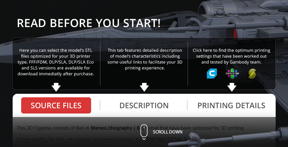T-70 X-Wing 3D Printing Model comes in 4 versions for each 3D printer type (FFF/FDM, DLP/SLA and SLS). Files for each version are available for download after the purchase.