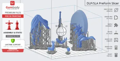 DLP/SLA 1.0 version features:- Contains 16 parts;- A printed model is 170 mm tall, 234 mm wide, 167 mm deep;- Figurine comes with three alternative platforms - a simple base, a powerful splash of water and the defeated Hirudegarn's head;- All parts are divided in such a way to fit the build plates and to ensure that support structures are generated where needed.
