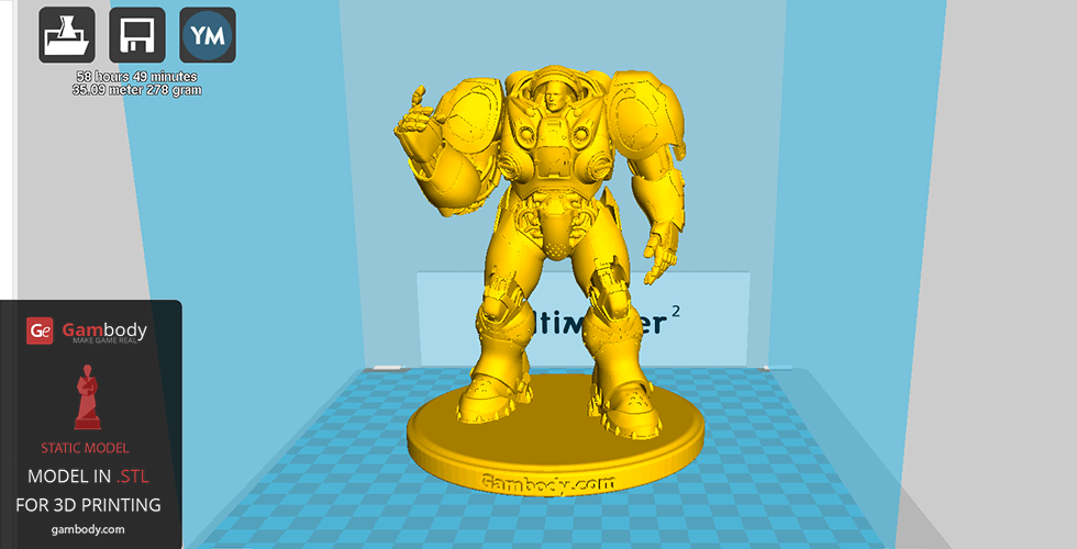 Terran Marine 3D printable model is 134.84mm deep, 138.52mm wide, and 159.63mm tall. Printing time will be 59h while filament consumption will be around 35m or 278gram.