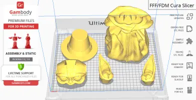 The model’s cutting was chosen by our team to minimise the amount of generated support and some of the parts were hollowed out for you to save resin in the Eco version. In order to conceal the places where the assembly parts of the figurine are connected, Baby Yoda Thanksgiving was cut along the contour of his body and clothes. For you to achieve the cleanest 3D printed result, the character’s head, hands, legs, sleeves, capotain, turkey leg etc. are provided as separate assembly parts.