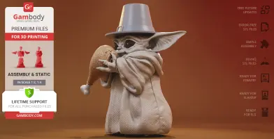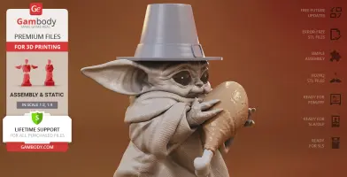 Baby Yoda Thanksgiving for 3D printing is a static assembly model, and its moderation and adaptation for different types of 3D printers took Gambody team 27 hours. The figurines' anatomy and proportions were thoroughly reviewed during the moderation process for the creature to be depicted harmoniously in the intended pose.