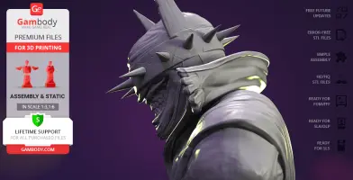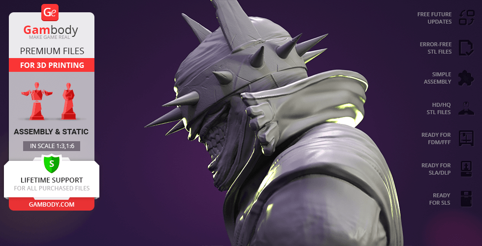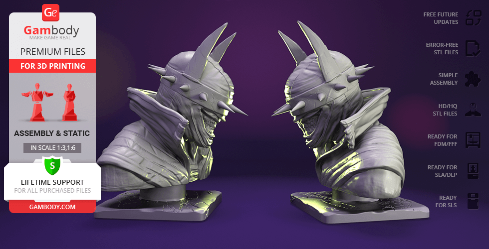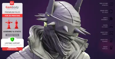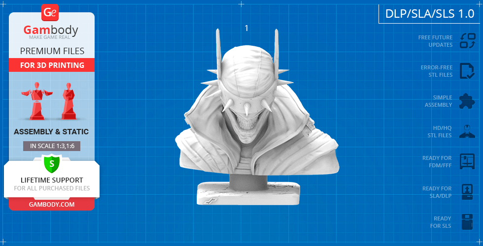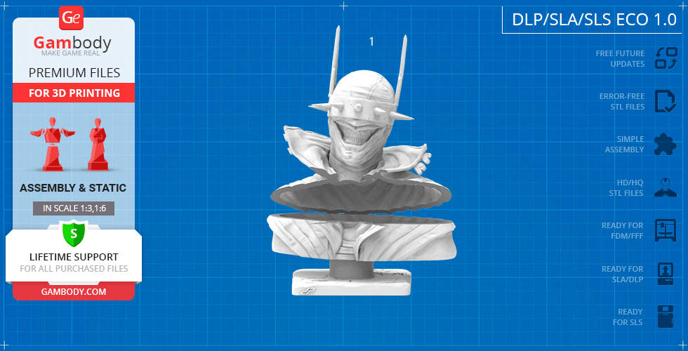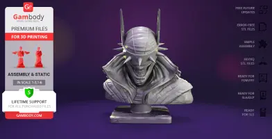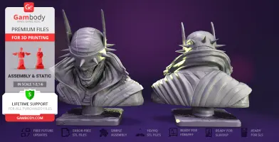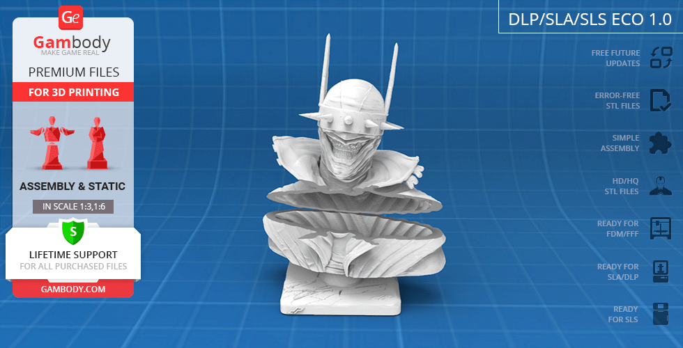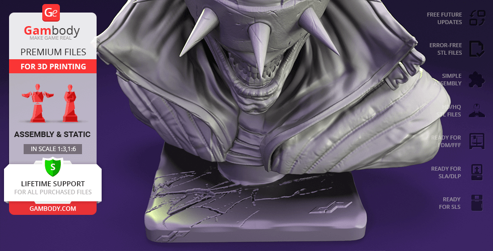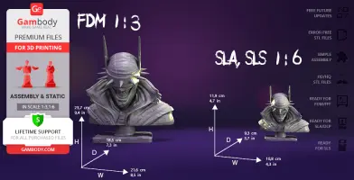 The Batman Who Laughs Bust for 3D printing is a static assembly figurine and its moderation and adaptation for different types of 3D printers took Gambody team 32 hours in total. The model’s cutting in its assembly version was chosen by our team to minimise the amount of filament needed for generated support. Therefore, and also so to ensure the cleanest 3D printed result possible, each spike on the villain’s spiked visor is provided as a separate assembly piece. Besides, some of the parts were hollowed out for you to save resin in the bust’s Eco version. All the assembly parts are provided in STL files in recommended positions that were worked out so to ensure the smoothness of the details’ surfaces after printing and that the 3D printing beginners won't face difficulties when placing the parts on a build plate.