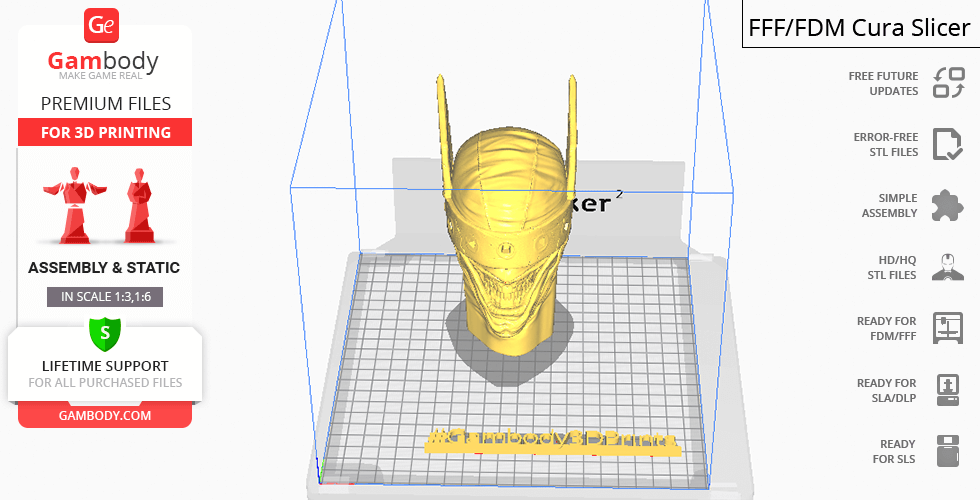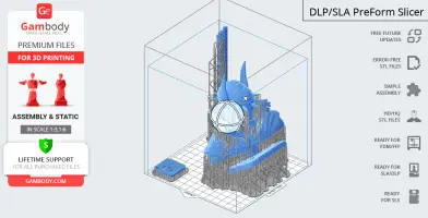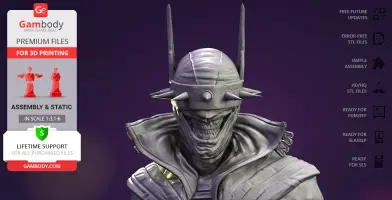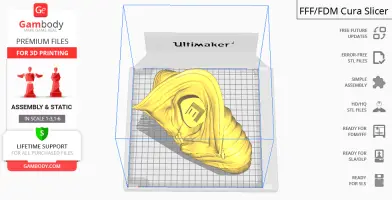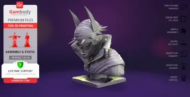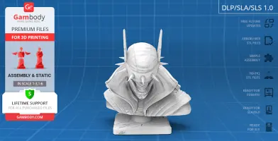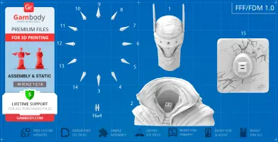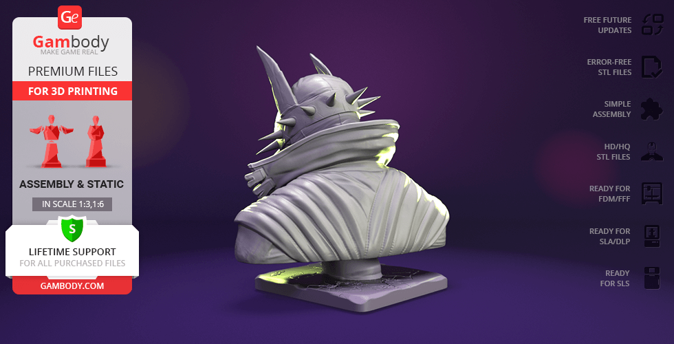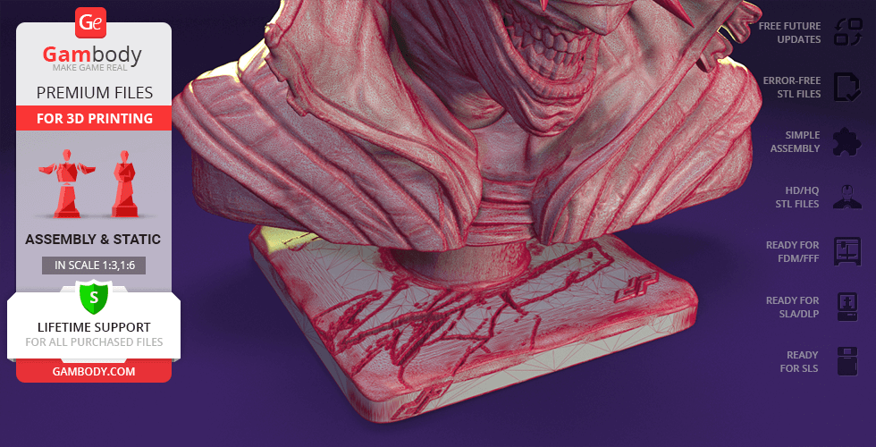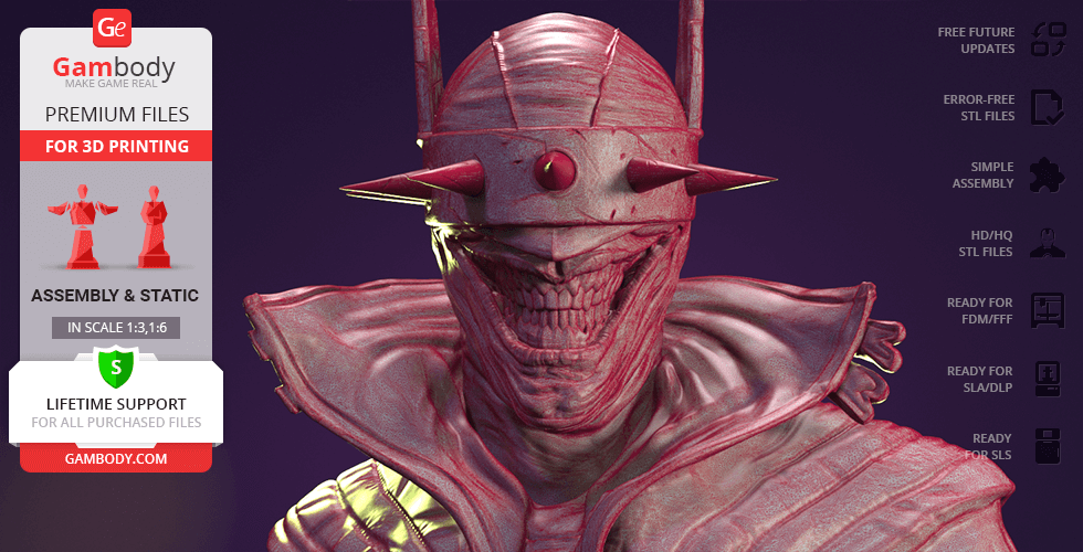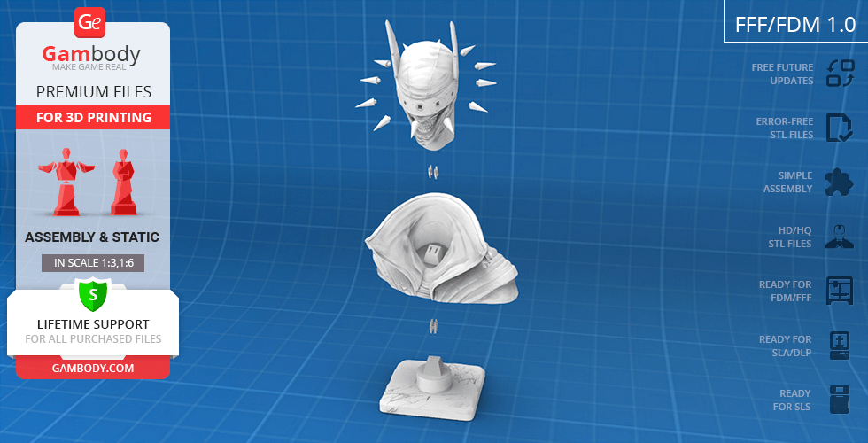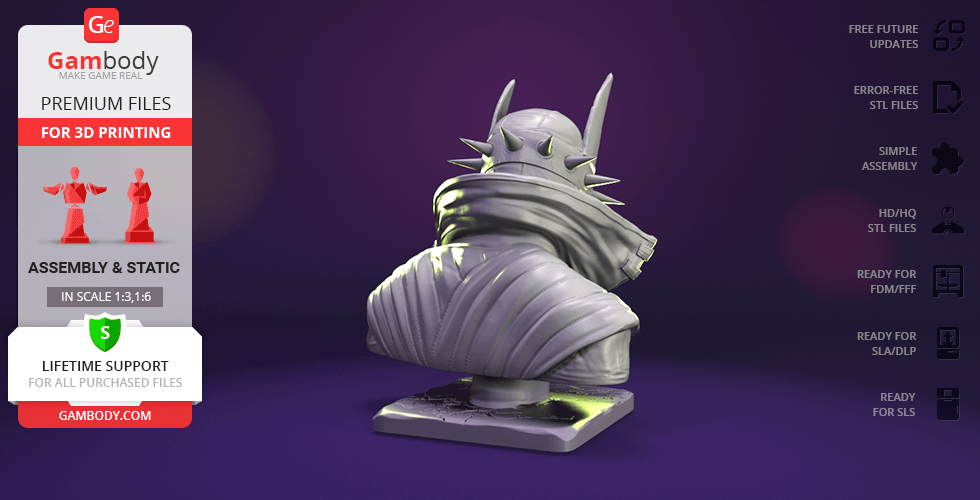 The Batman Who Laughs Bust for 3D printing is a static assembly figurine and its moderation and adaptation for different types of 3D printers took Gambody team 32 hours in total. The model’s cutting in its assembly version was chosen by our team to minimise the amount of filament needed for generated support. Therefore, and also so to ensure the cleanest 3D printed result possible, each spike on the villain’s spiked visor is provided as a separate assembly piece. Besides, some of the parts were hollowed out for you to save resin in the bust’s Eco version. All the assembly parts are provided in STL files in recommended positions that were worked out so to ensure the smoothness of the details’ surfaces after printing and that the 3D printing beginners won't face difficulties when placing the parts on a build plate.