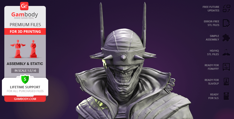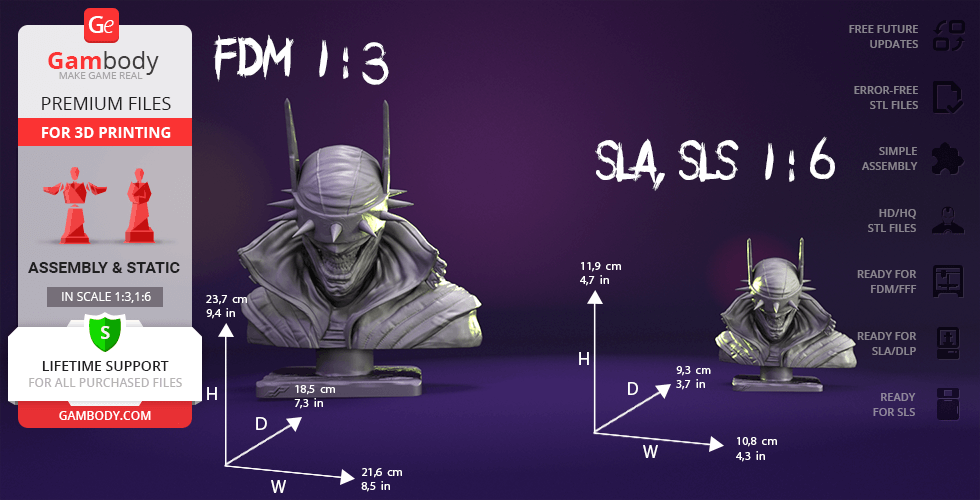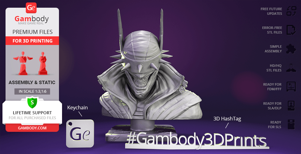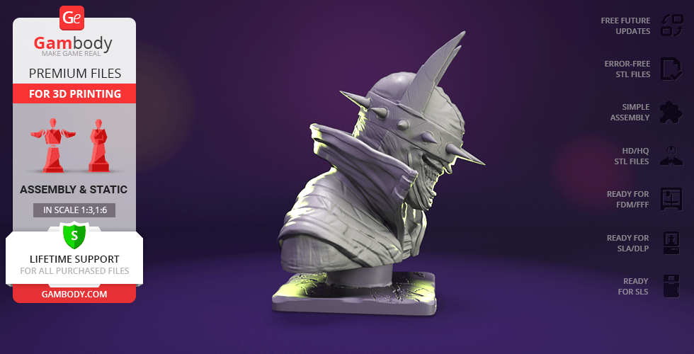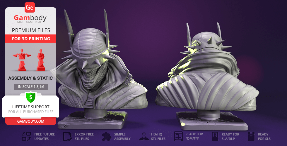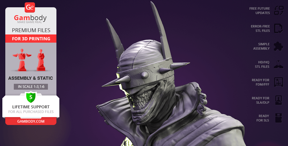 The Batman Who Laughs Bust 3D Printing Figurine comes in 3 versions for different 3D printer types (FFF/FDM, DLP/SLA and SLS). Files for each version are available for download after the purchase.
