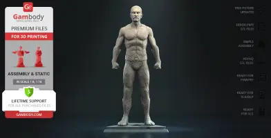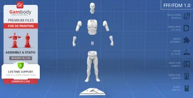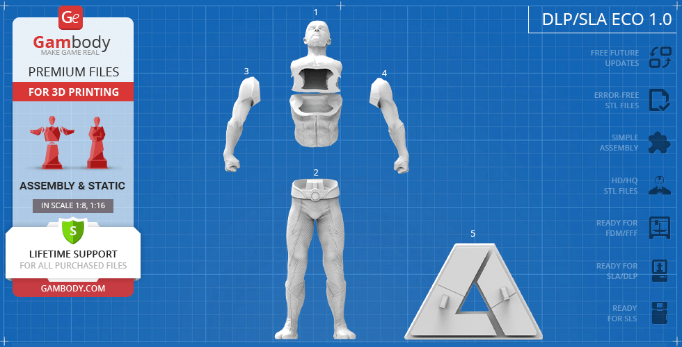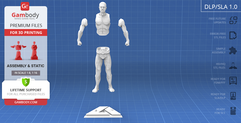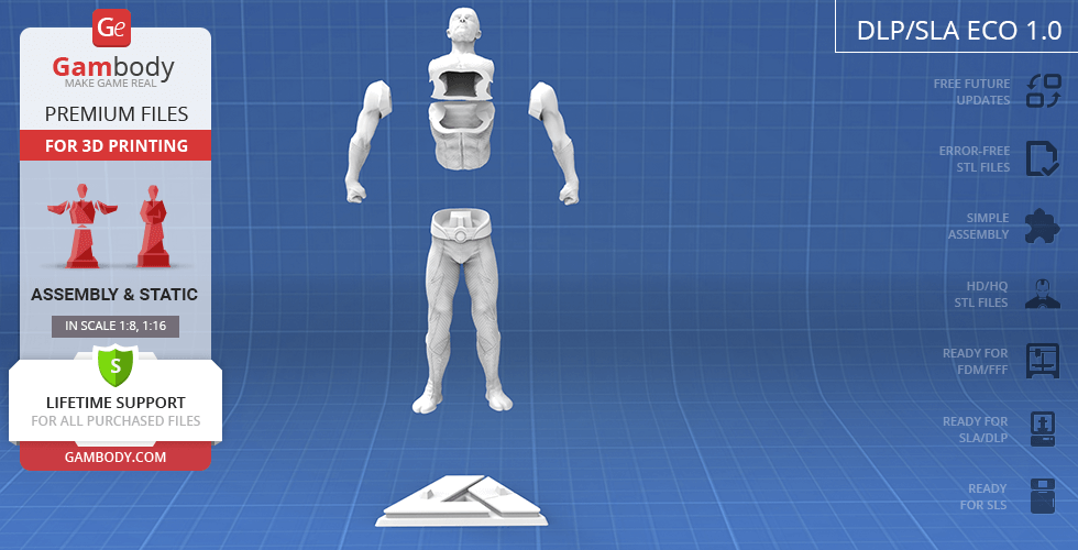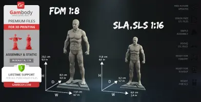 All parts are manually hollowed out to save resin. The assembly parts are connected using specially designed integrated connectors that fit securely into the corresponding slots. Optionally, for added strength and rigidity, the static connections can be glued together;