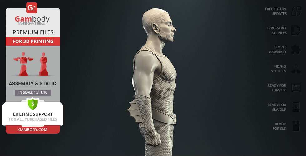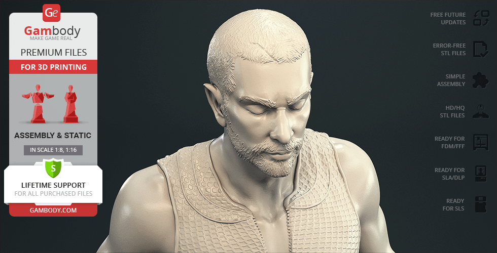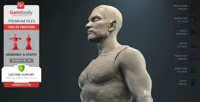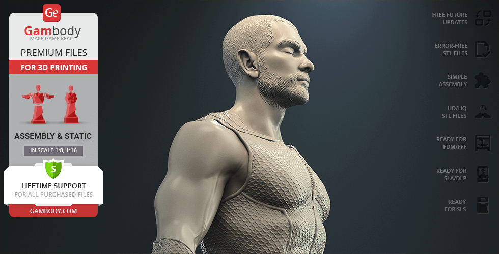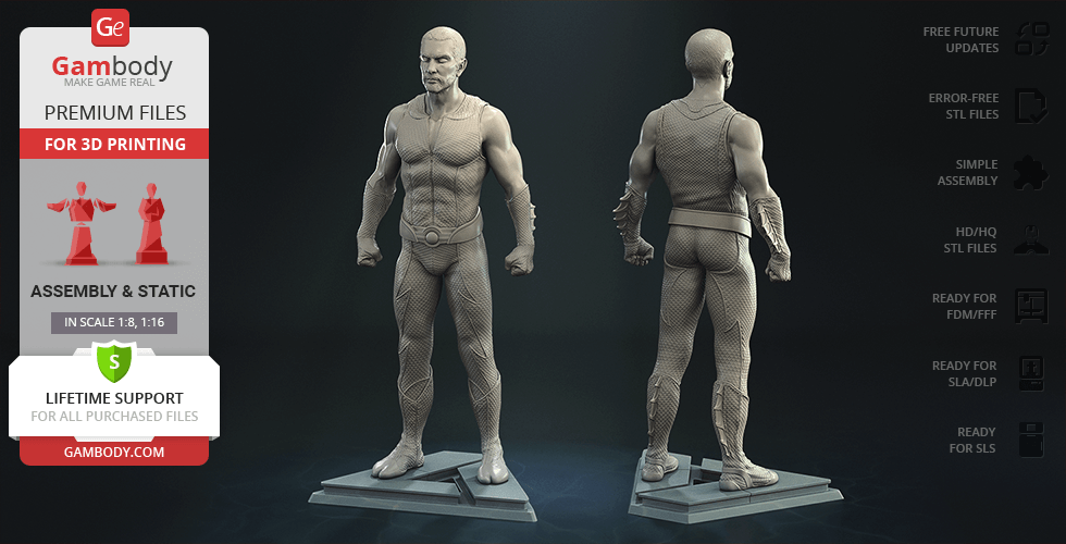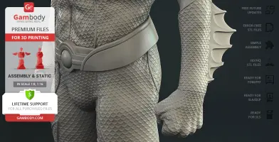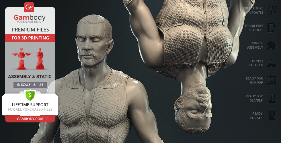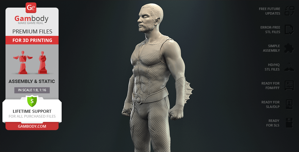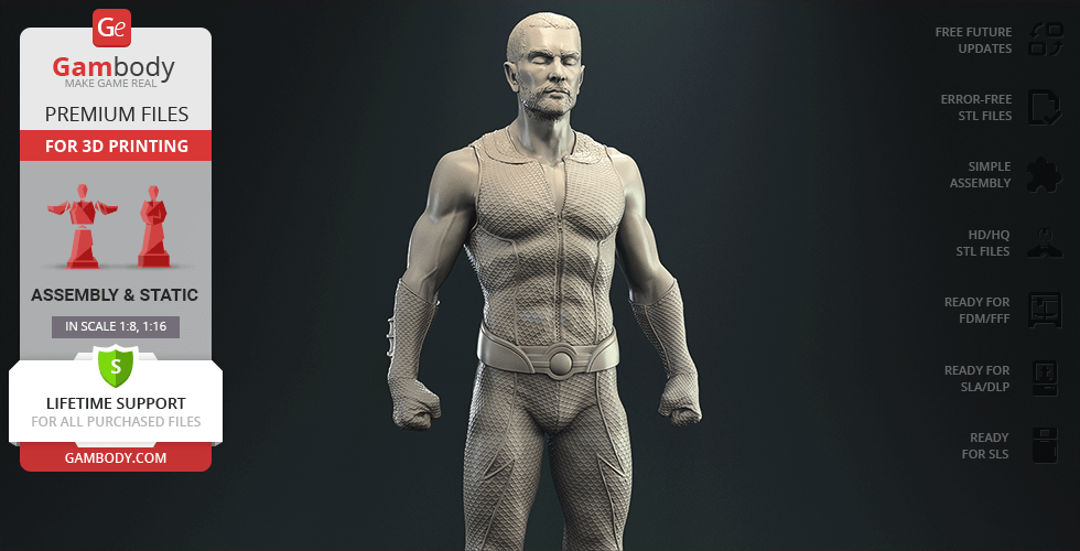 Inspired by the hilarious character from The Seven, our contributing 3D artist presented the Deep 3D printing design. The model is meticulously designed, it recreates in great detail the appearance of the villain, starting from the physique and facial features of the character and ending with the detailing of the scaly jumpsuit and the haircut. The posture of the hero speaks of his determination and fearlessness, he’s not hesitant to engage in dangerous endeavours. Discover the wide opportunities to paint the printed design or implement it in a diorama and turn The Deep into an outstanding item in your collection!