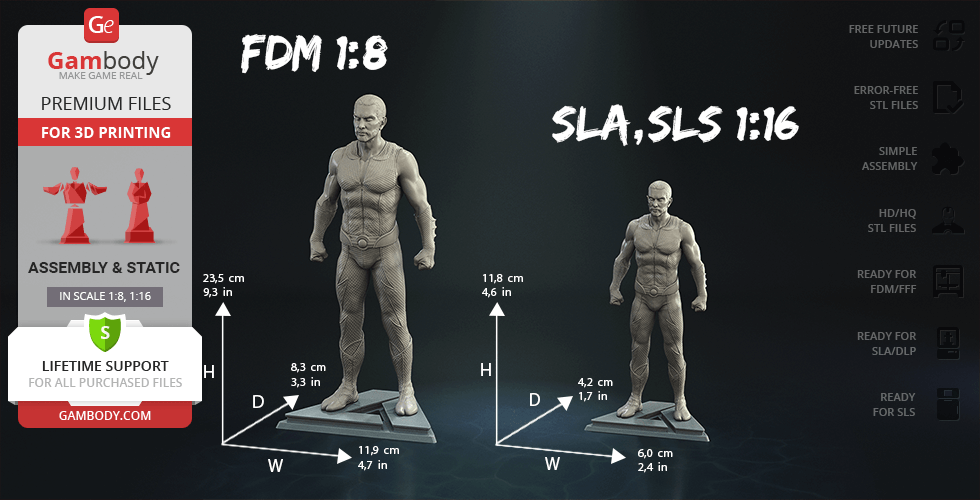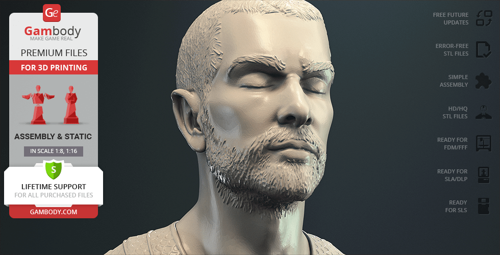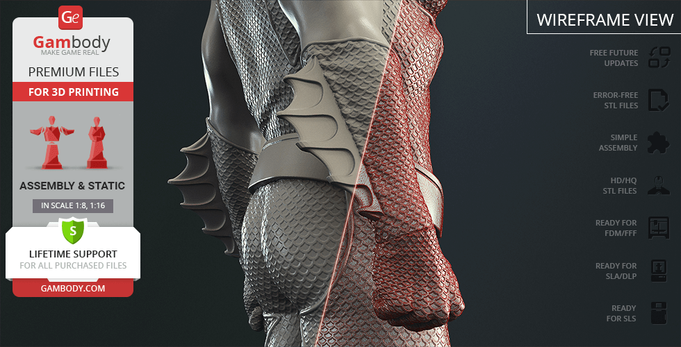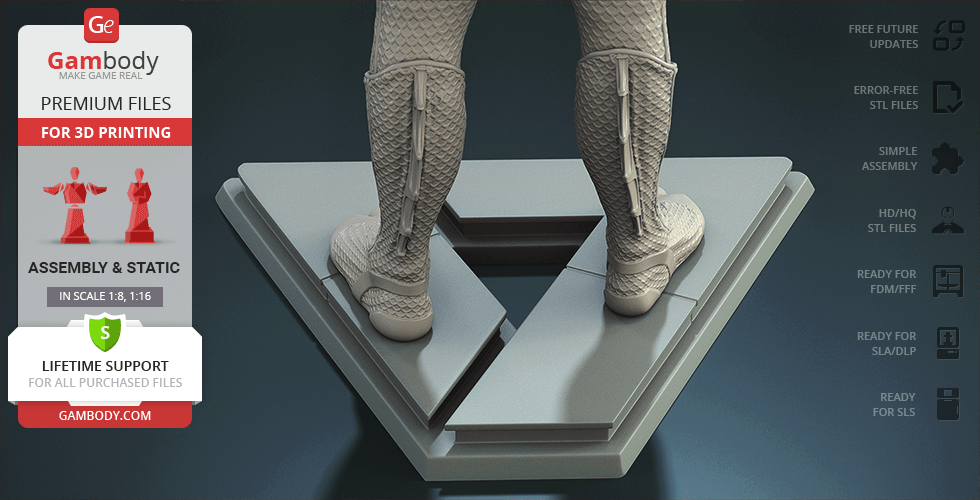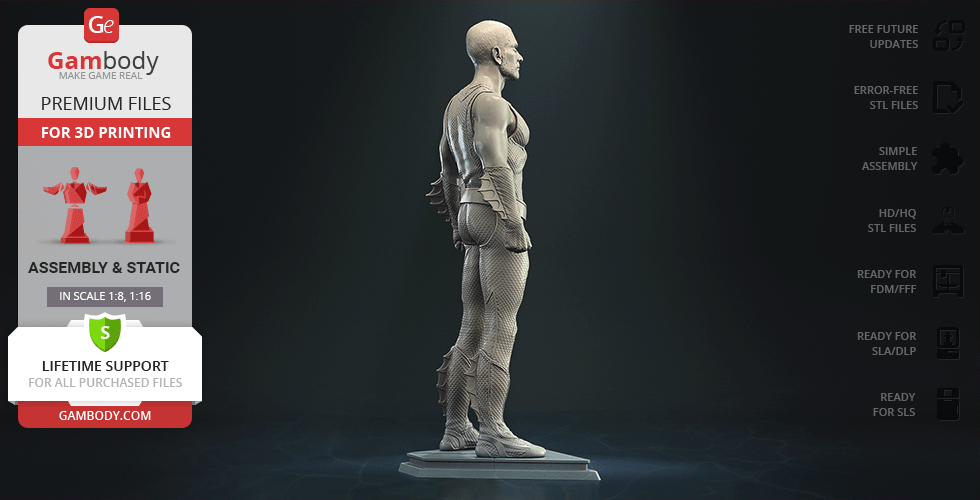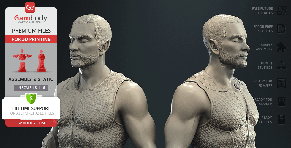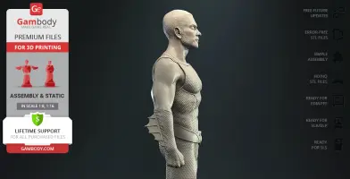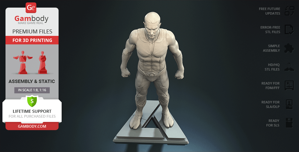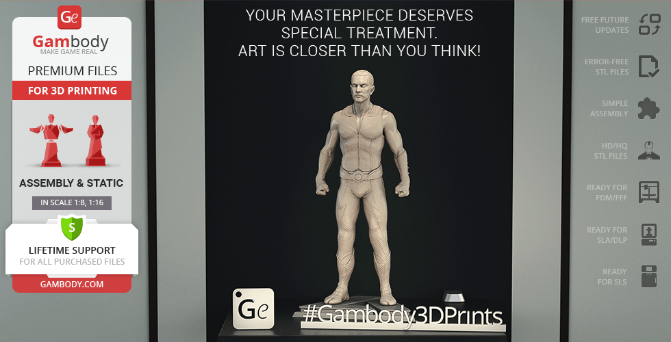 Inspired by the hilarious character from The Seven, our contributing 3D artist presented the Deep 3D printing design. The model is meticulously designed, it recreates in great detail the appearance of the villain, starting from the physique and facial features of the character and ending with the detailing of the scaly jumpsuit and the haircut. The posture of the hero speaks of his determination and fearlessness, he’s not hesitant to engage in dangerous endeavours. Discover the wide opportunities to paint the printed design or implement it in a diorama and turn The Deep into an outstanding item in your collection!