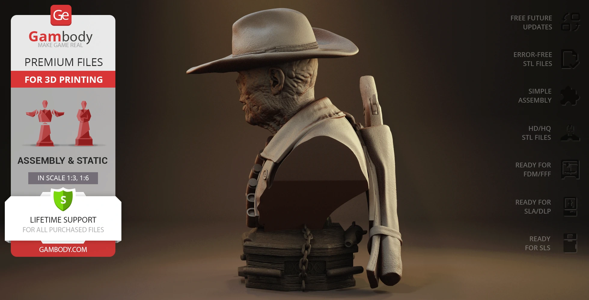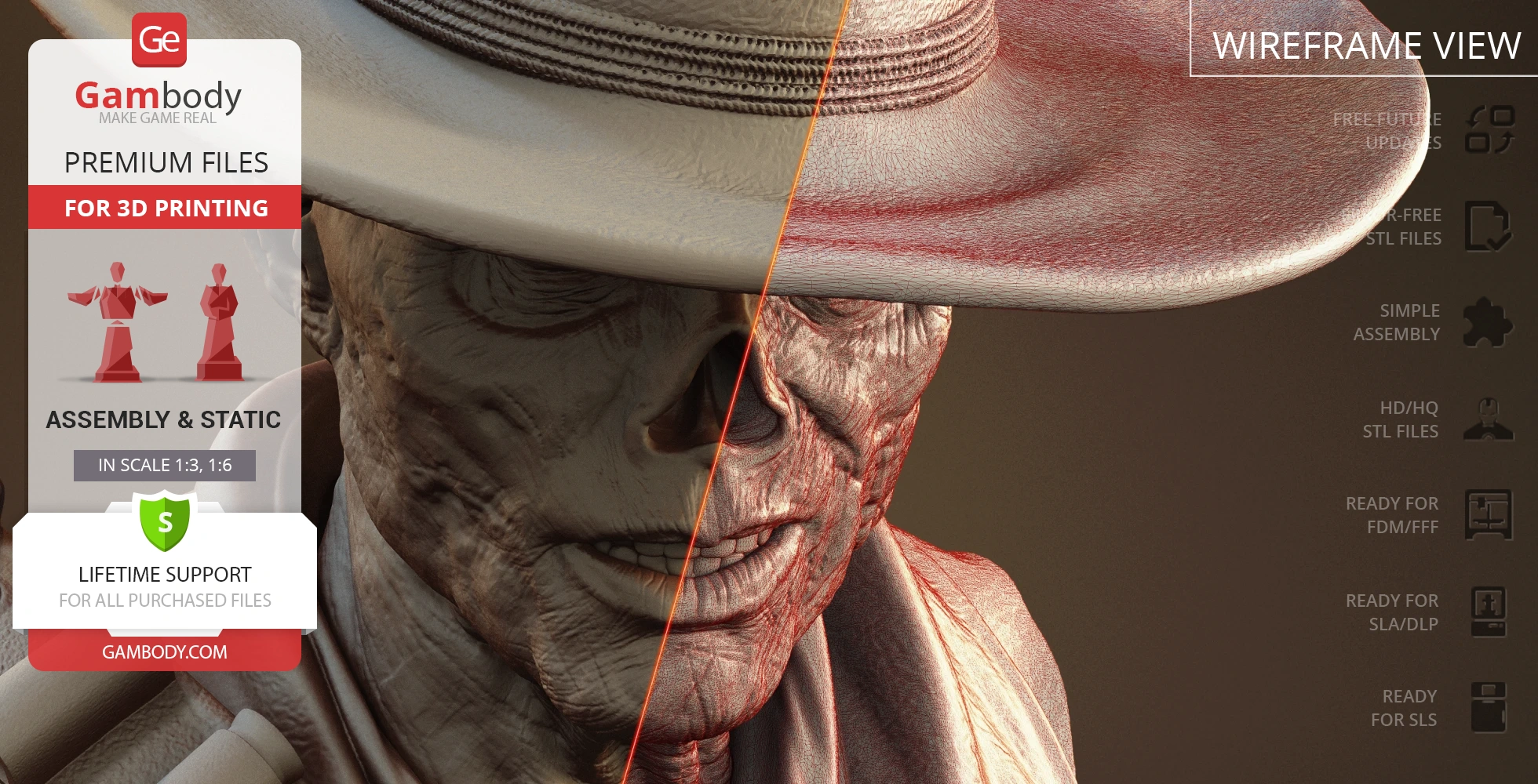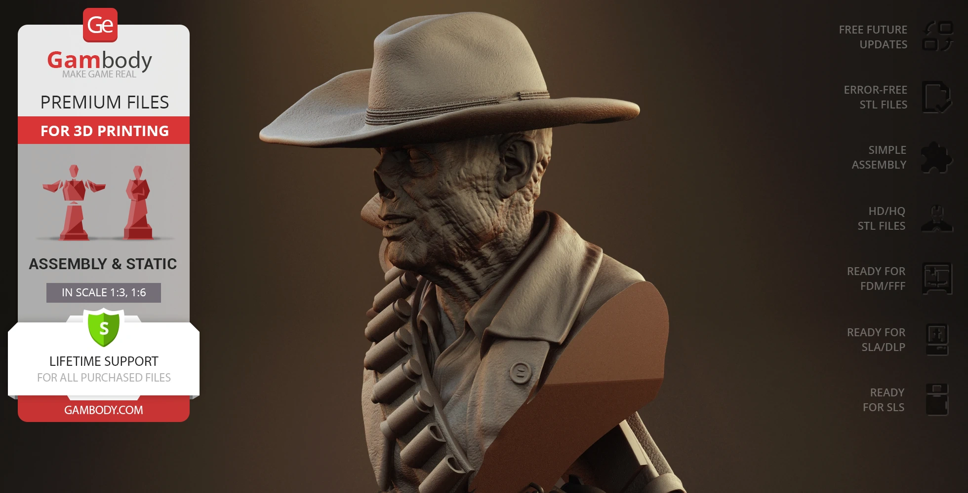 The Ghoul Bust is a masterful work of our contributing 3D artist that stands out for its precise design and authentic look. The author put a lot of effort when sculpting the face of The Ghoul and managed to preserve the resemblance with the film actor to a great extent: the facial expression of the bounty hunter is very familiar to every Fallout TV fan and the texture of the skin with the scars, burns and muscles impresses with its level of detail. The cowboy hat and short barrel rifle are immutable attributes of the Ghoul who has the background of a Western actor. The Ghoul Bust will exceed your expectations, so let yourself start a new adventure in the world of 3D printing!