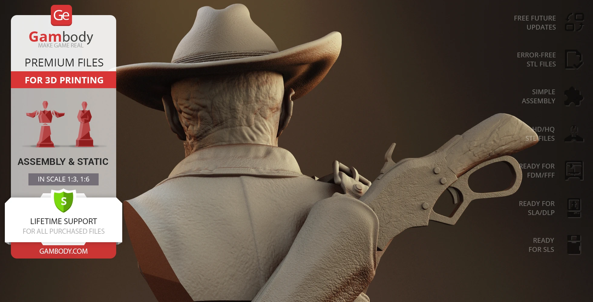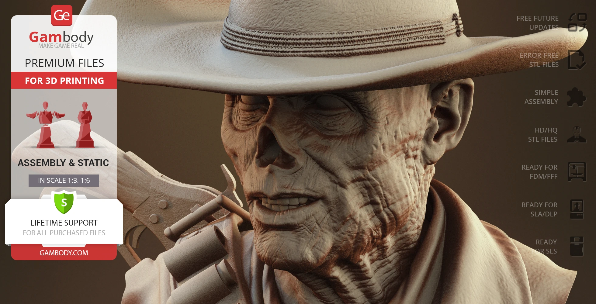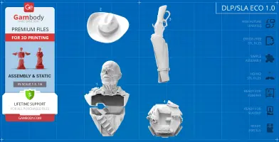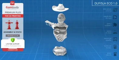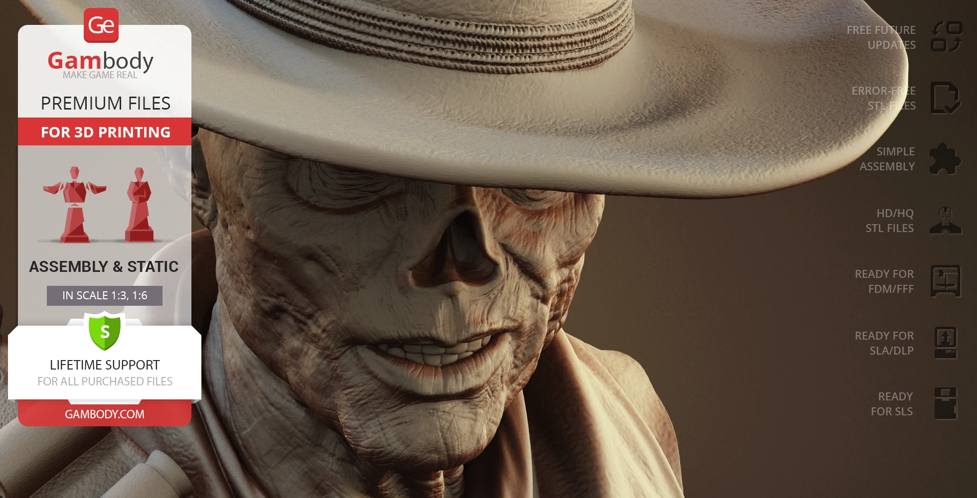 The Ghoul Bust is a masterful work of our contributing 3D artist that stands out for its precise design and authentic look. The author put a lot of effort when sculpting the face of The Ghoul and managed to preserve the resemblance with the film actor to a great extent: the facial expression of the bounty hunter is very familiar to every Fallout TV fan and the texture of the skin with the scars, burns and muscles impresses with its level of detail. The cowboy hat and short barrel rifle are immutable attributes of the Ghoul who has the background of a Western actor. The Ghoul Bust will exceed your expectations, so let yourself start a new adventure in the world of 3D printing!