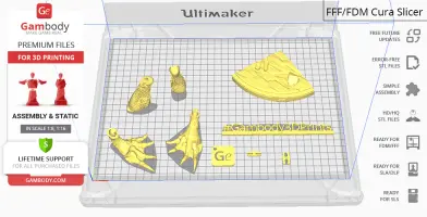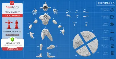 FFF/FDM 1.0 version features:- Contains 27 parts;- A printed model is 240 mm tall, 167 mm wide, 173 mm deep;- Assembly kit includes locks. One lock 26_ge_lock_10H(x1) to connect the model's body and legs securely needs to be printed once; lock 27_ge_lock_7S(x12) needs to be printed 12 times;- All parts are divided in such a way that you will print them with the smallest number of support structures.
