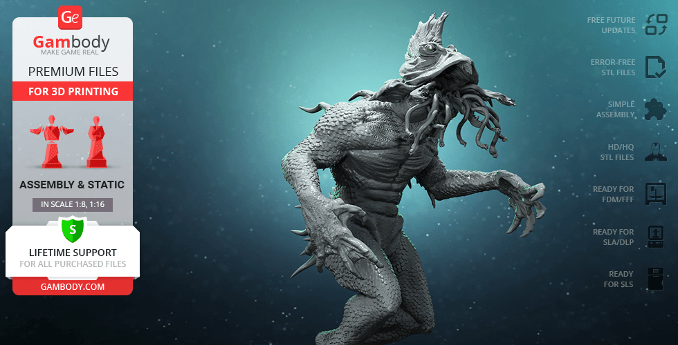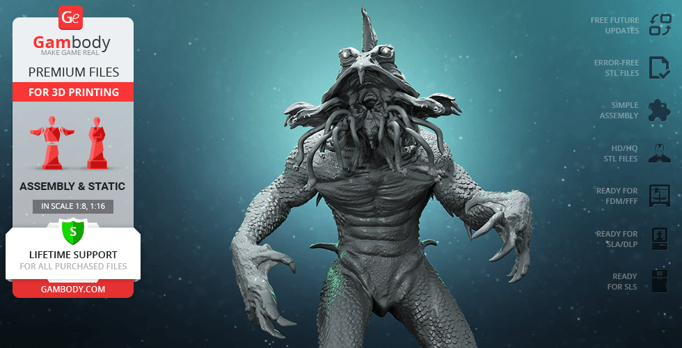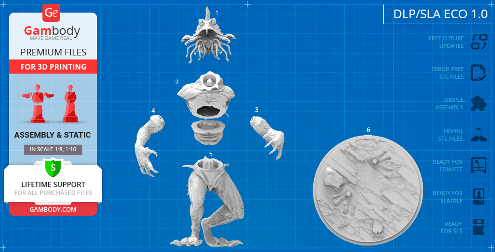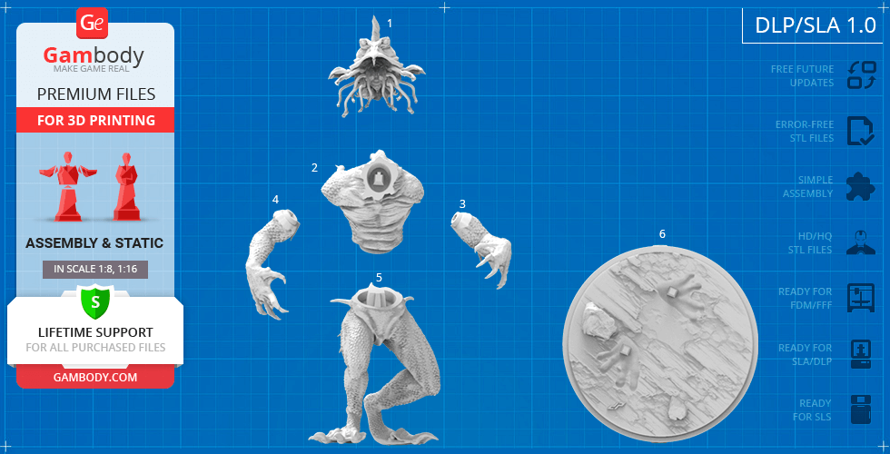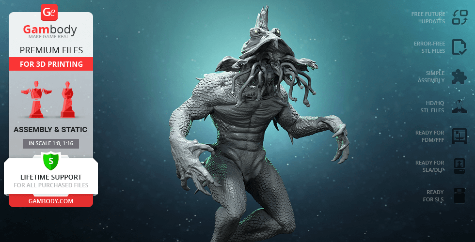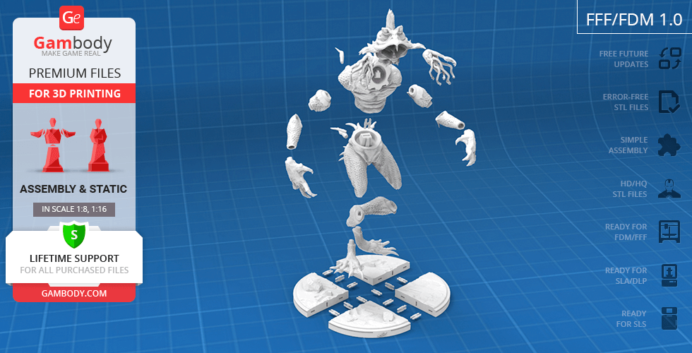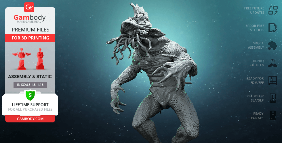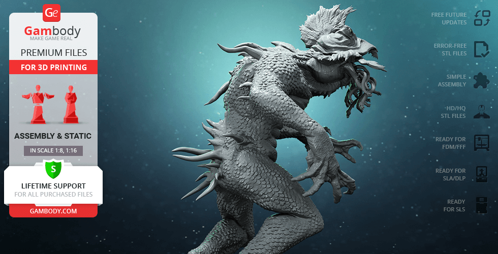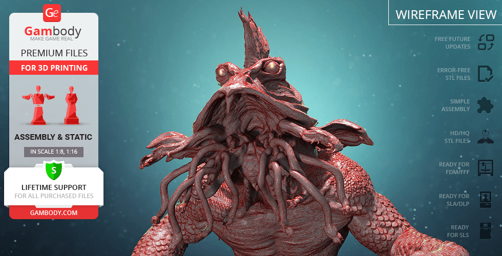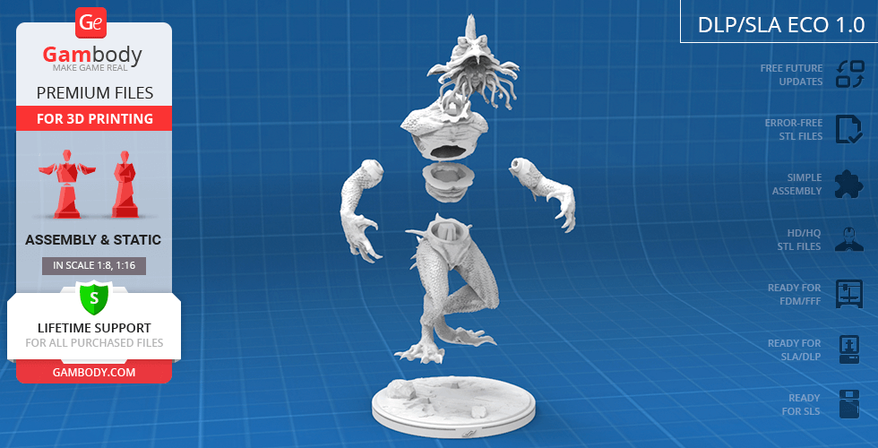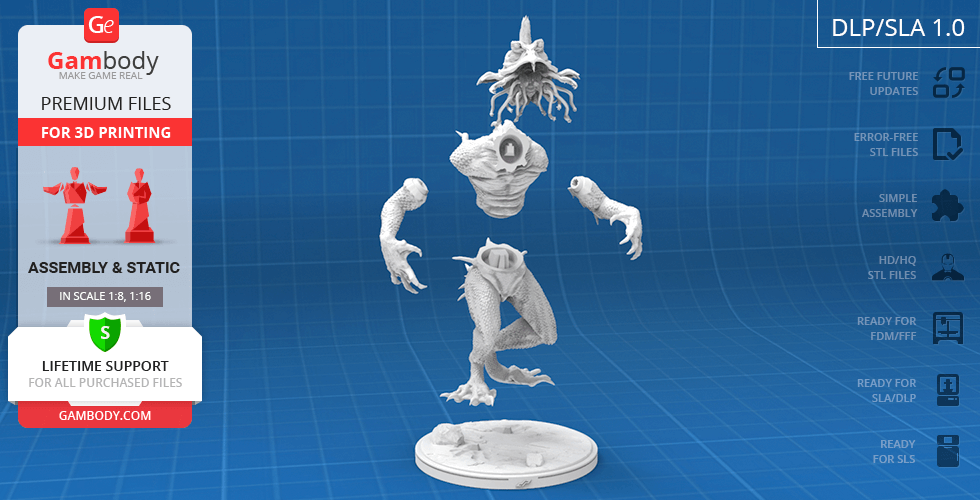 Party Beach Monster is a static assembly figurine and its moderation and adaptation for different types of 3D printers took Gambody team 52 hours in total. The cutting of the freaky creature was chosen by our team to minimise the amount of filament needed for generated support and some of the model’s parts were hollowed out for you to save resin in the model’s Eco version. In order to ensure the cleanest 3D printed result possible, the creature's appendages, as well as each dorsal tentacle, are provided as separate assembly pieces. All assembly parts come in STL files in recommended positions that were worked out to ensure the smoothness of the details’ surfaces after printing and so that the 3D printing beginners won't face difficulties when placing the parts on a build plate. All the parts have special connecting elements for you to assemble the figurine in the easiest way possible and there are locks provided in the model’s assembly version to connect the details if you don’t want to glue the parts. It is especially convenient for those who are going to paint the model.