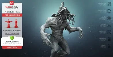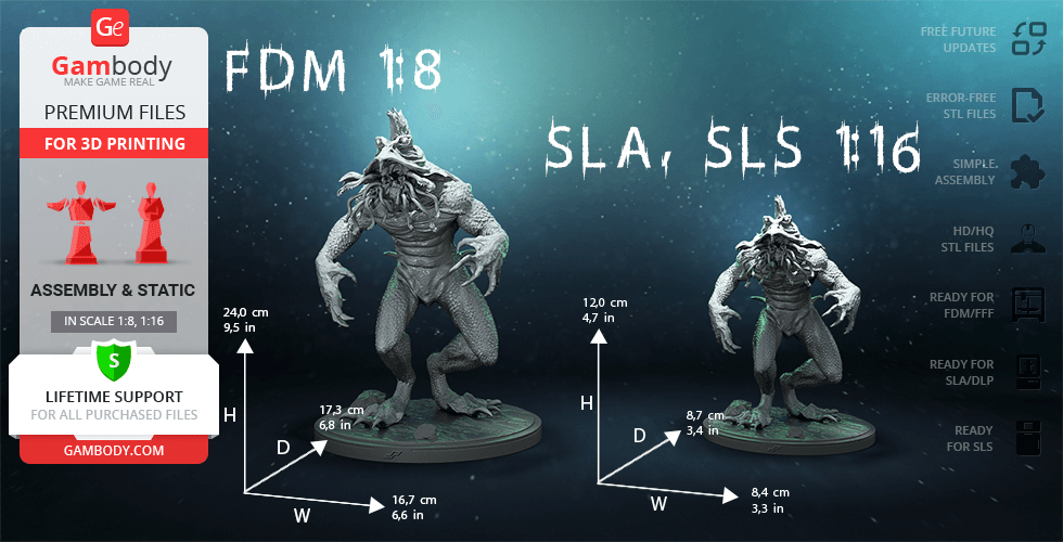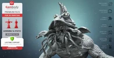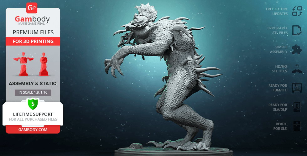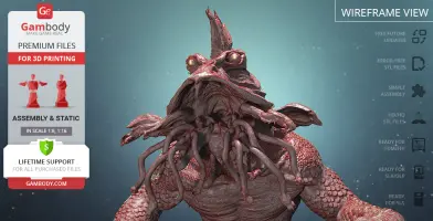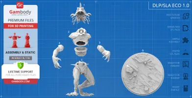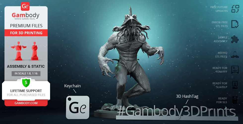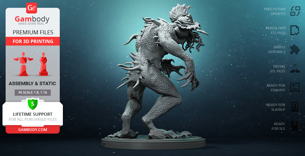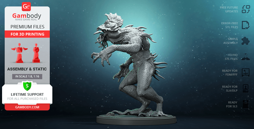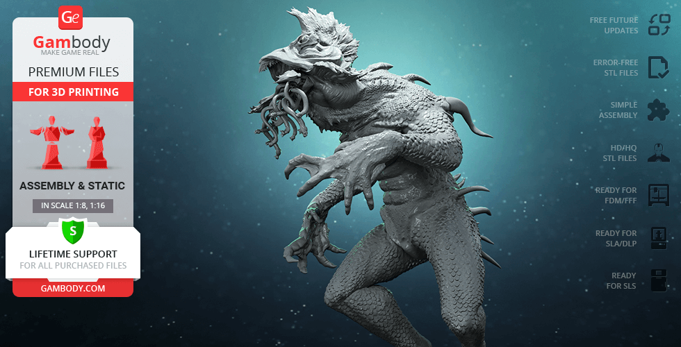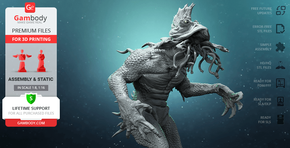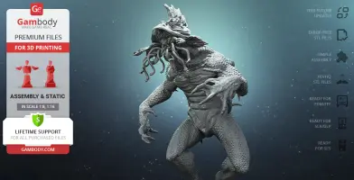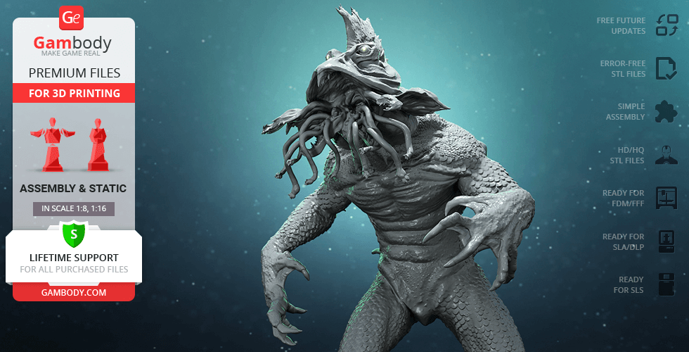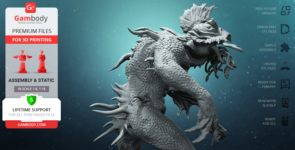 Party Beach Monster is a static assembly figurine and its moderation and adaptation for different types of 3D printers took Gambody team 52 hours in total. The cutting of the freaky creature was chosen by our team to minimise the amount of filament needed for generated support and some of the model’s parts were hollowed out for you to save resin in the model’s Eco version. In order to ensure the cleanest 3D printed result possible, the creature's appendages, as well as each dorsal tentacle, are provided as separate assembly pieces. All assembly parts come in STL files in recommended positions that were worked out to ensure the smoothness of the details’ surfaces after printing and so that the 3D printing beginners won't face difficulties when placing the parts on a build plate. All the parts have special connecting elements for you to assemble the figurine in the easiest way possible and there are locks provided in the model’s assembly version to connect the details if you don’t want to glue the parts. It is especially convenient for those who are going to paint the model.