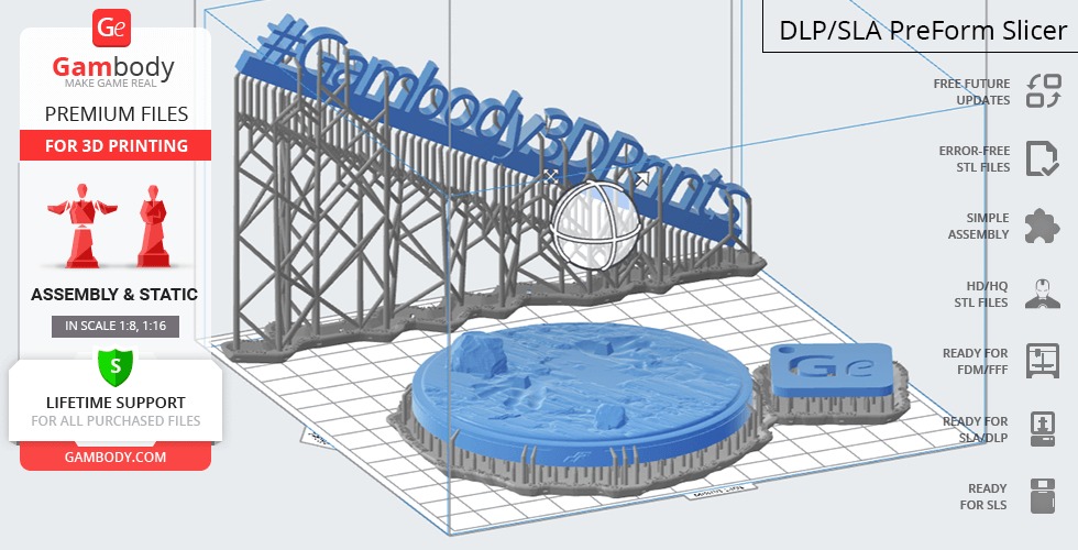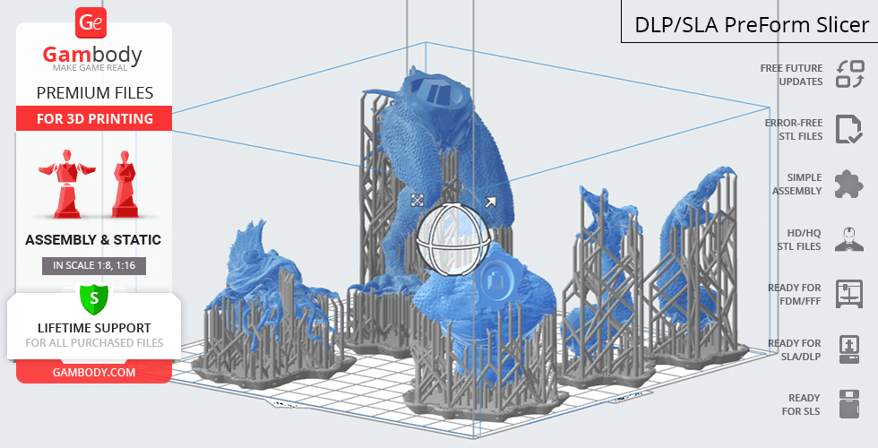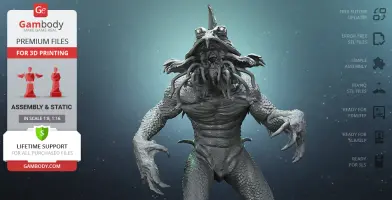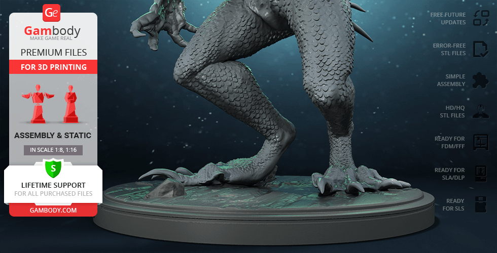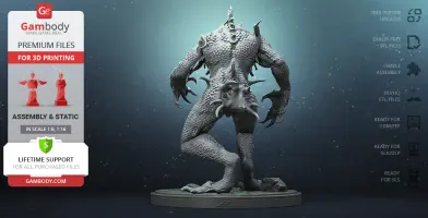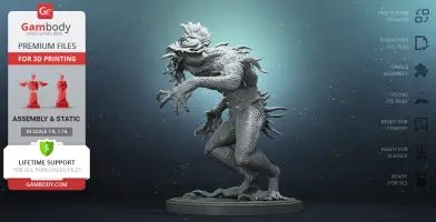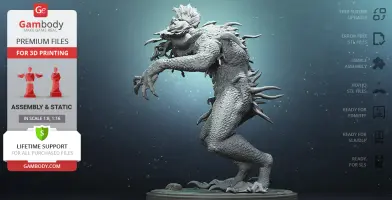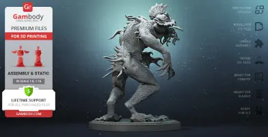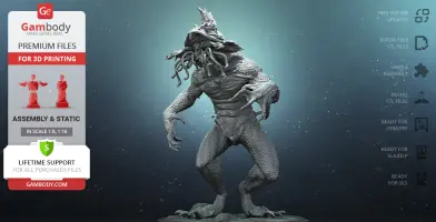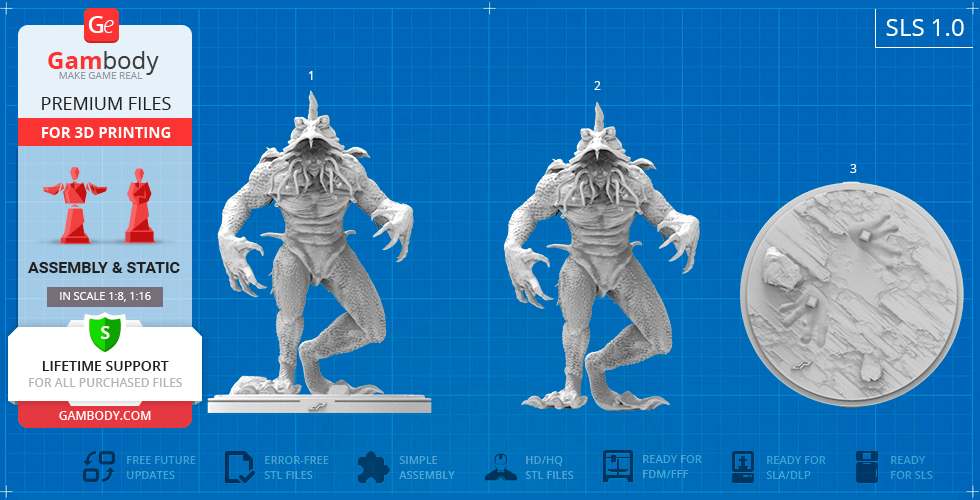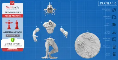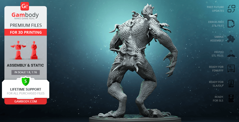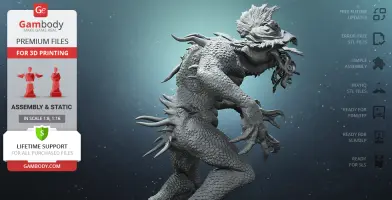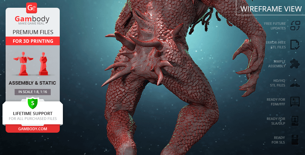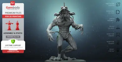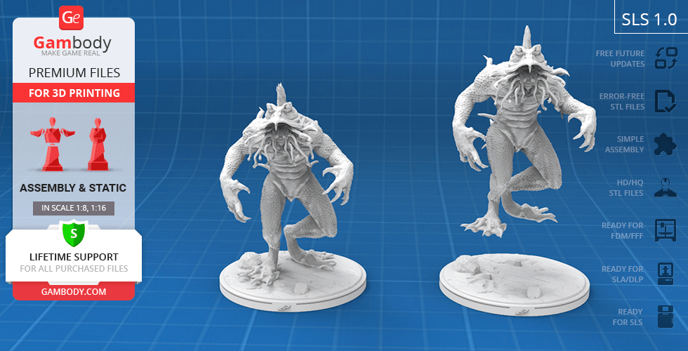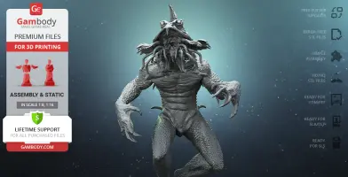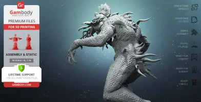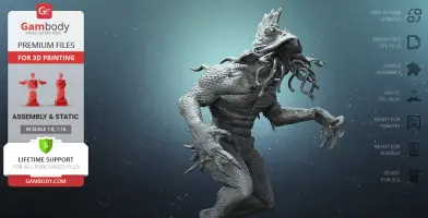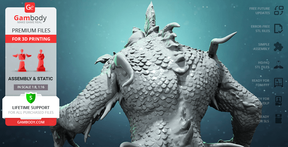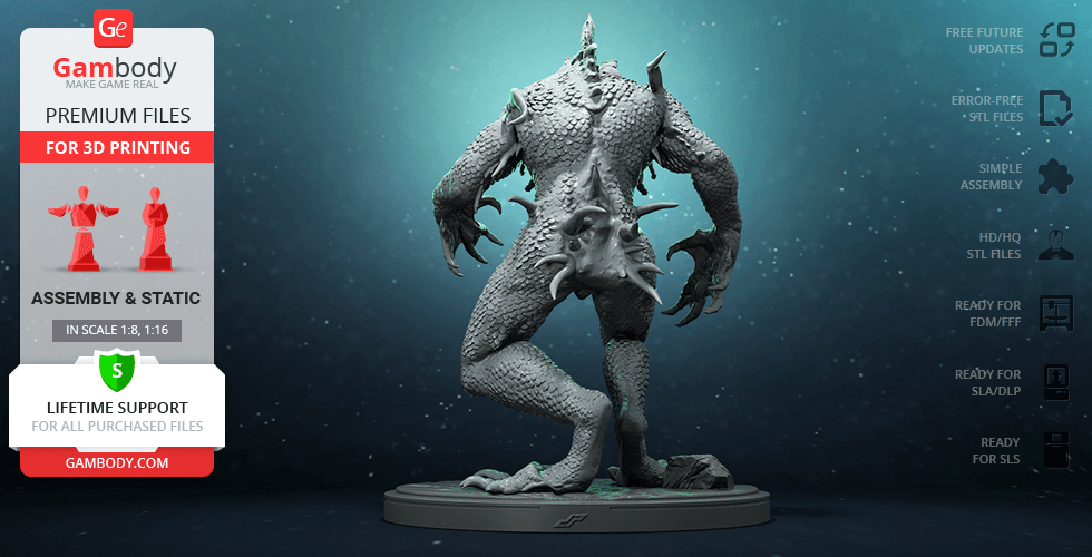 Party Beach Monster is a static assembly figurine and its moderation and adaptation for different types of 3D printers took Gambody team 52 hours in total. The cutting of the freaky creature was chosen by our team to minimise the amount of filament needed for generated support and some of the model’s parts were hollowed out for you to save resin in the model’s Eco version. In order to ensure the cleanest 3D printed result possible, the creature's appendages, as well as each dorsal tentacle, are provided as separate assembly pieces. All assembly parts come in STL files in recommended positions that were worked out to ensure the smoothness of the details’ surfaces after printing and so that the 3D printing beginners won't face difficulties when placing the parts on a build plate. All the parts have special connecting elements for you to assemble the figurine in the easiest way possible and there are locks provided in the model’s assembly version to connect the details if you don’t want to glue the parts. It is especially convenient for those who are going to paint the model.