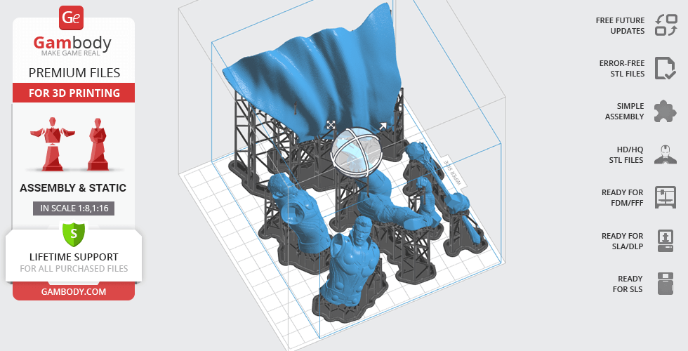 Scale: Thor actual height is 1920 mm. The model’s chosen scale is 1/8 for the FDM version and 1/16 for the DLP/SLA/SLS version.