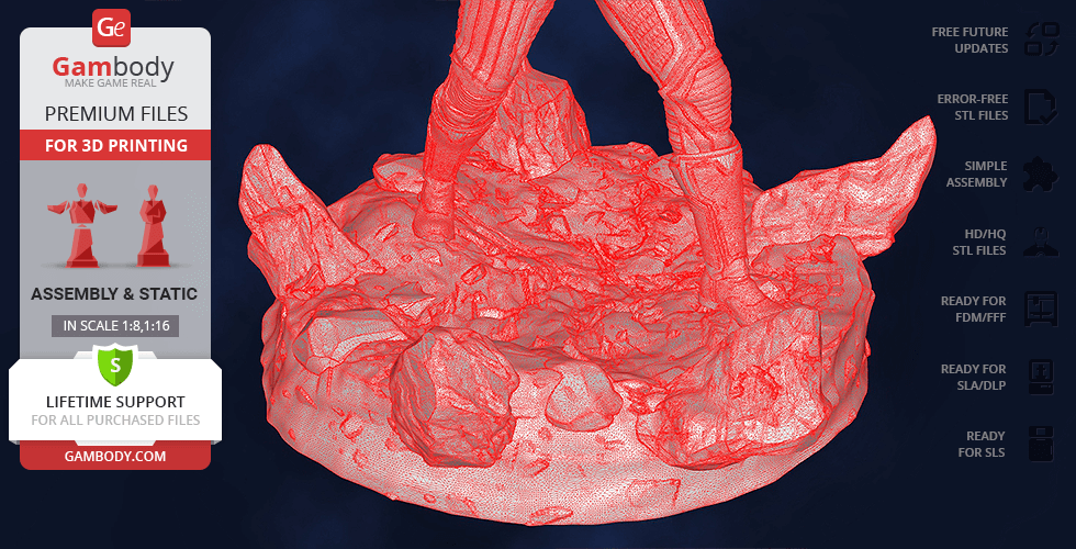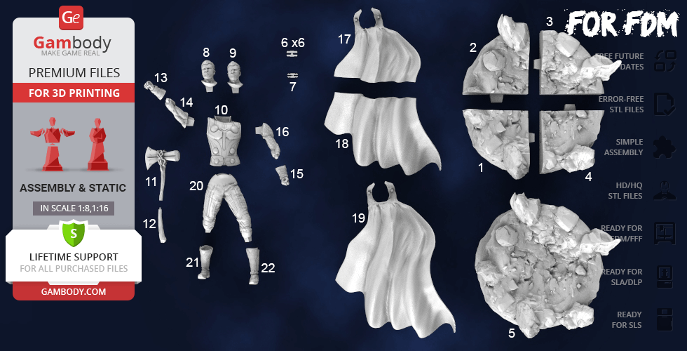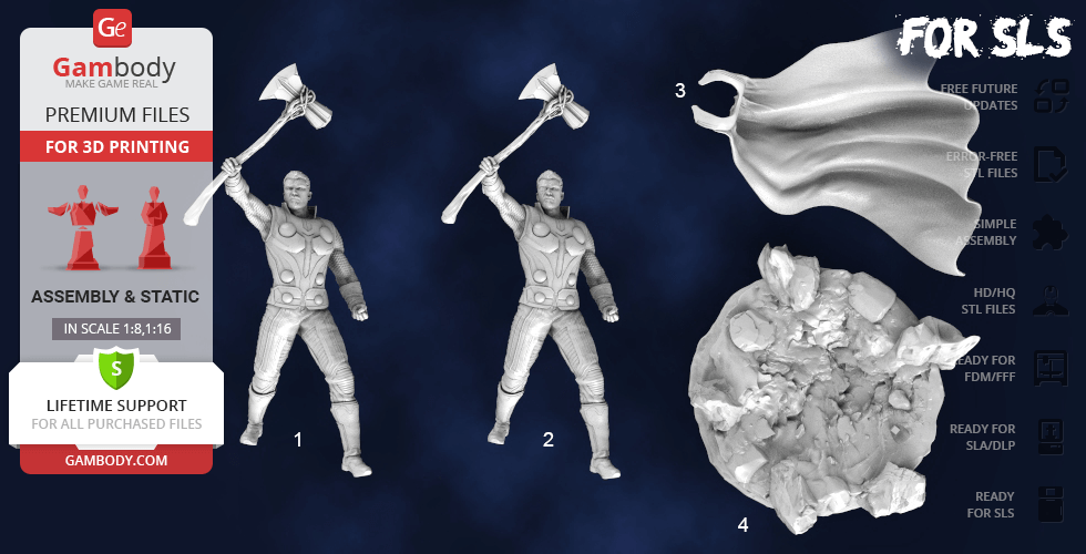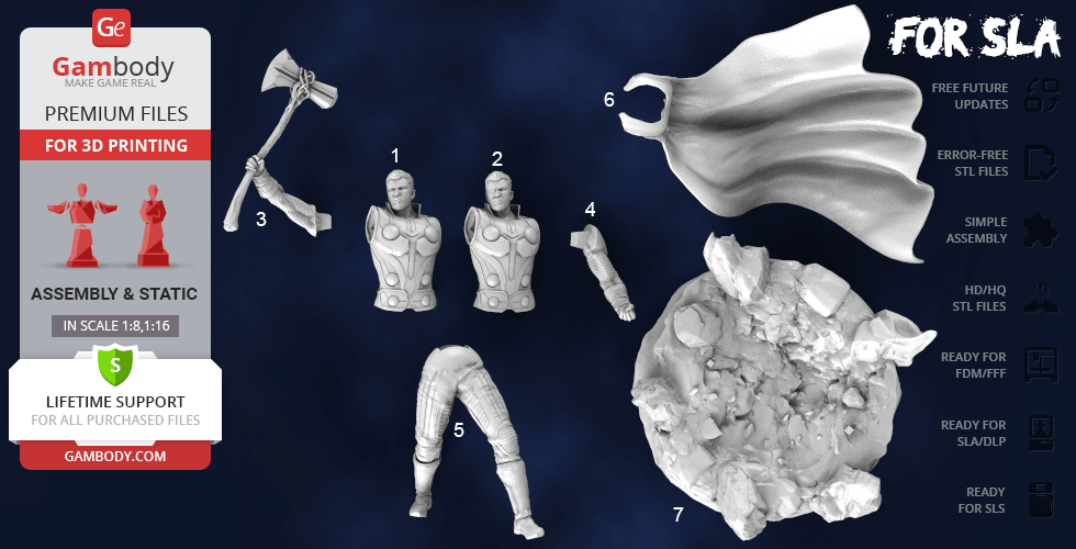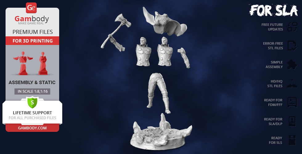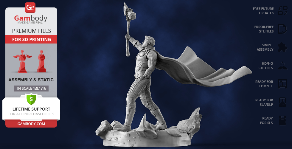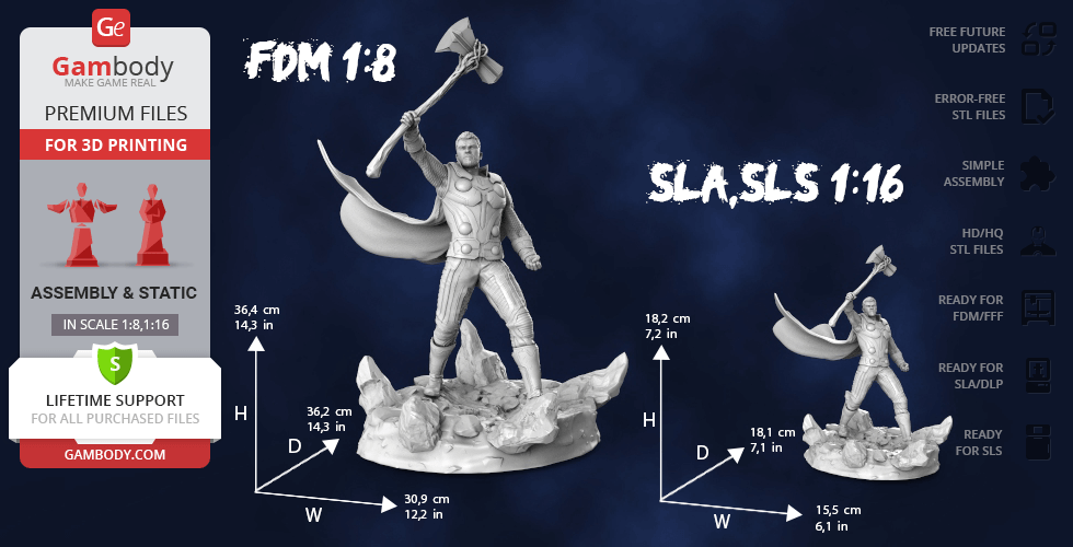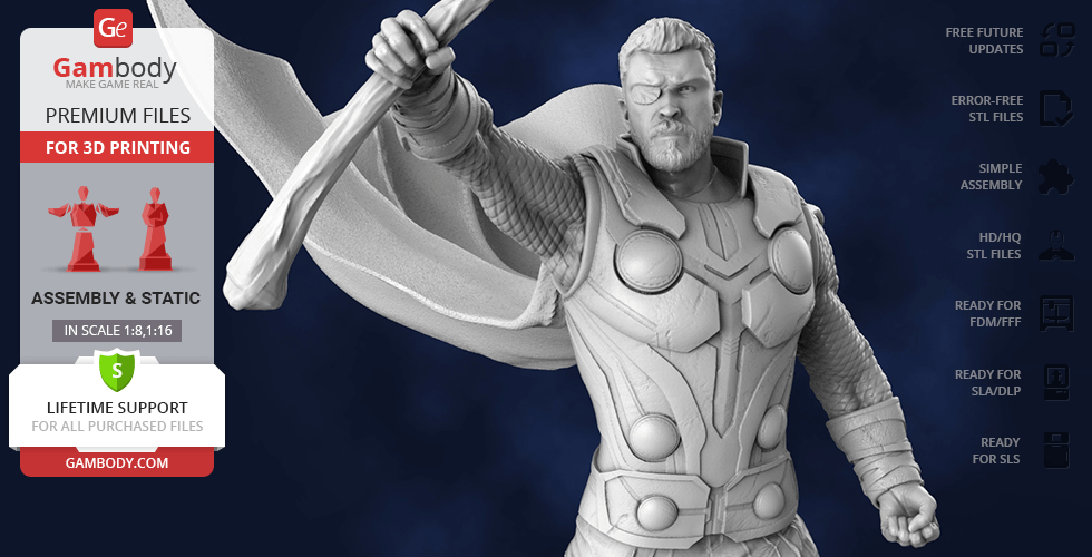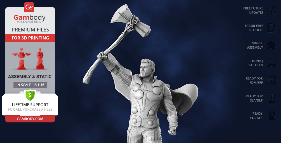 Thor with Stormbreaker 3D Printing Figurine comes in 3 versions for each 3D printer type (FDM/FFF, DLP/SLA and SLS). Files for each version are available for download after the purchase.