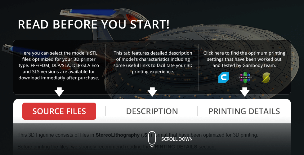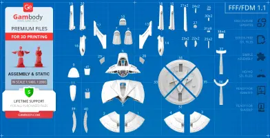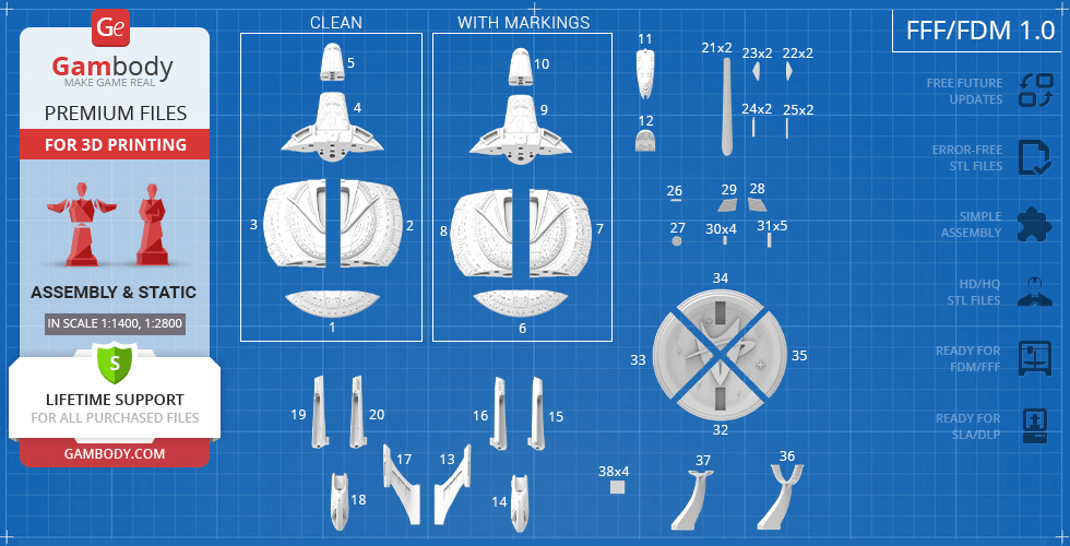 For you to receive the cleanest 3D printing result possible and minimize the amount of filament needed for generated support, the USS Enterprise NCC-1701-E was divided into convenient assembly parts.All assembly parts in the FFF/FDM 1.0 version are provided in STL files in recommended positions that were worked out in order to ensure the smoothness of the details’ surfaces after printing and that the 3D printing beginners won't face difficulties when placing the parts on a build plate. After downloading any model's file you will also receive "Assembly Manual" for FFF/FDM 1.0 and DLP/SLA 1.0 versions in PDF format. We highly recommend that you get acquainted with the “Assembly video” and "Assembly Manual" before getting down to the USS Enterprise NCC-1701-E model.