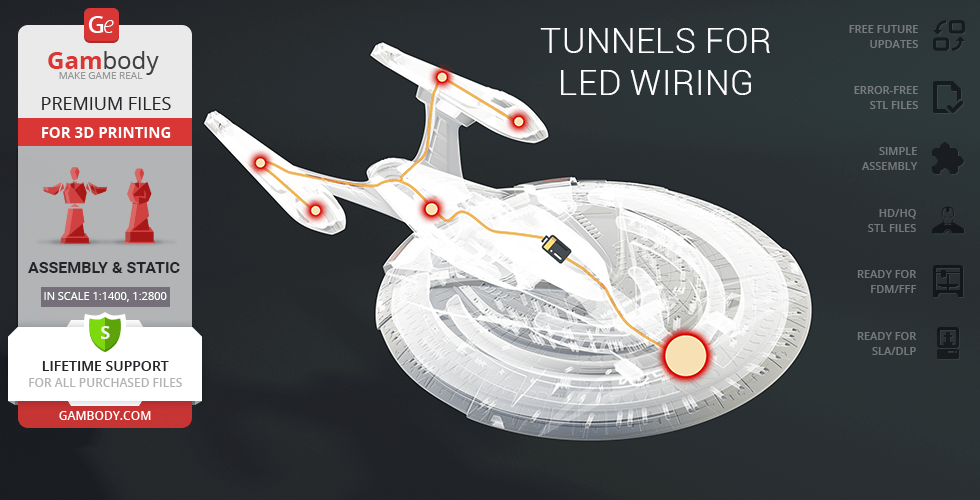 - You can choose between parts with raised markings and patterns and clean parts; the battery can be hidden in the head of the craft;- Tunnels for LED wiring to light up the engine ports, nacelle pylons, viewports;