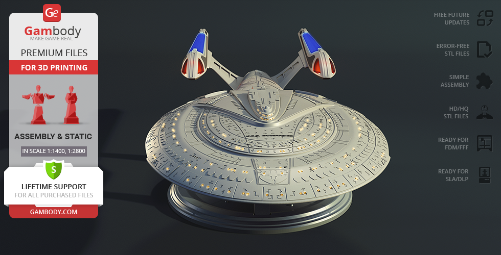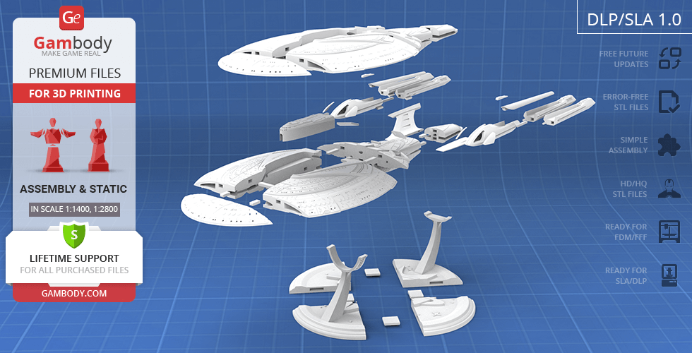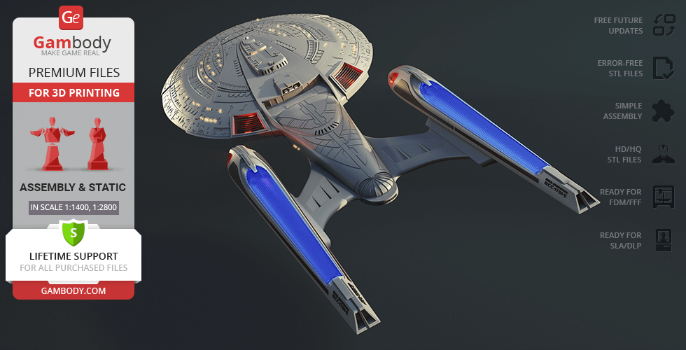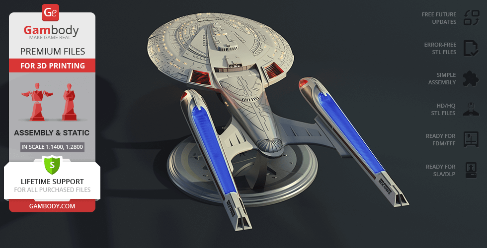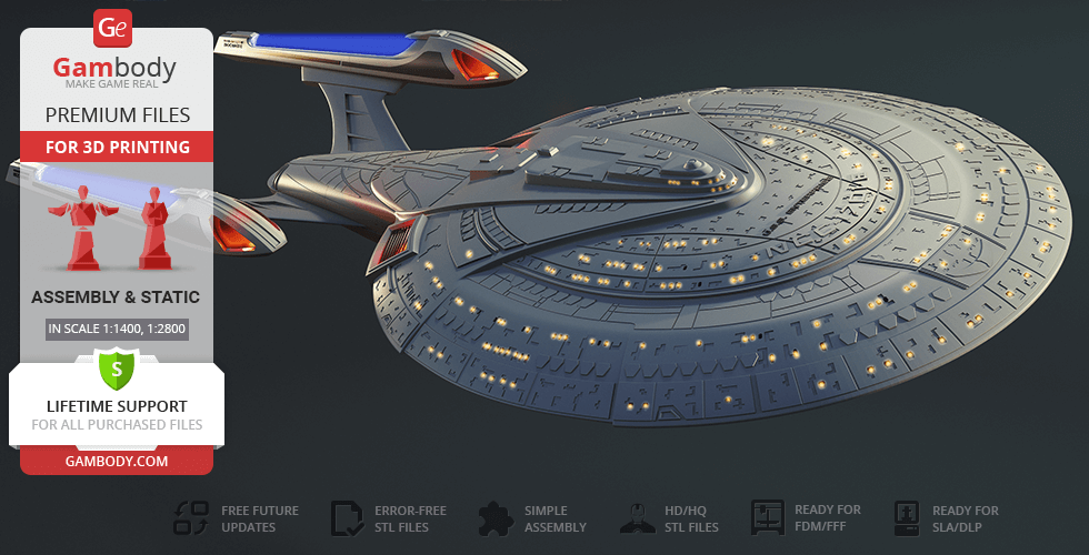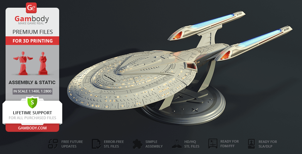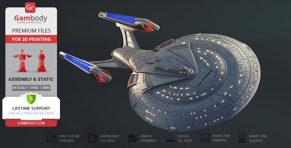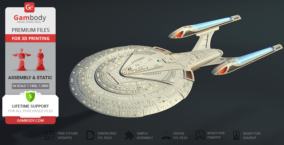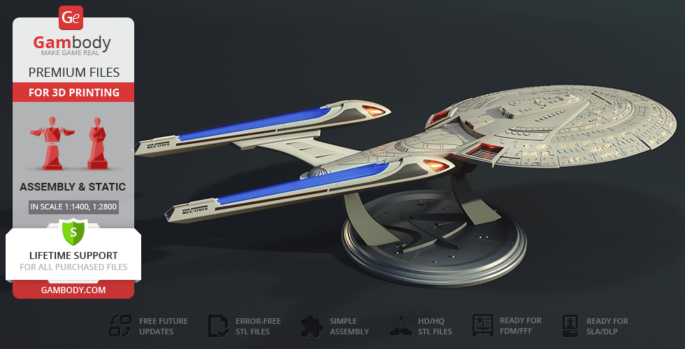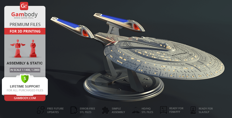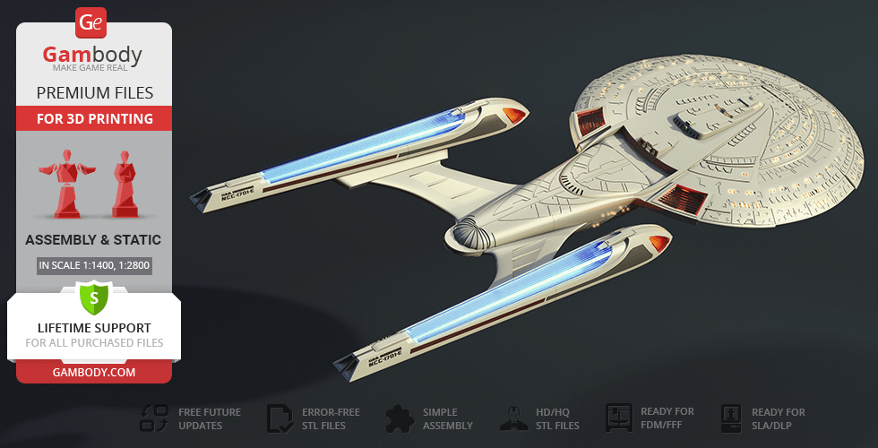 - 4 versions of the NCC-1701-E STL files for FFF/FDM, DLP/SLA 3D printers - files for each version are available for download after the purchase;