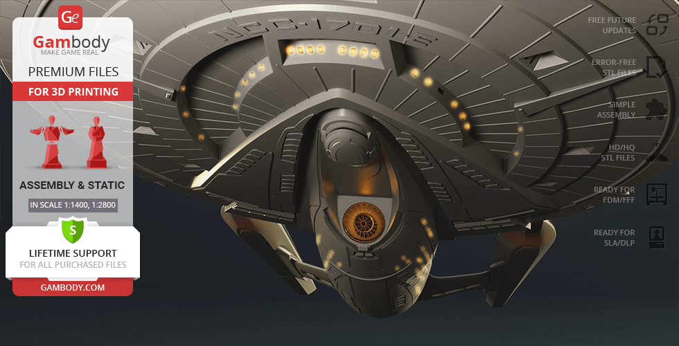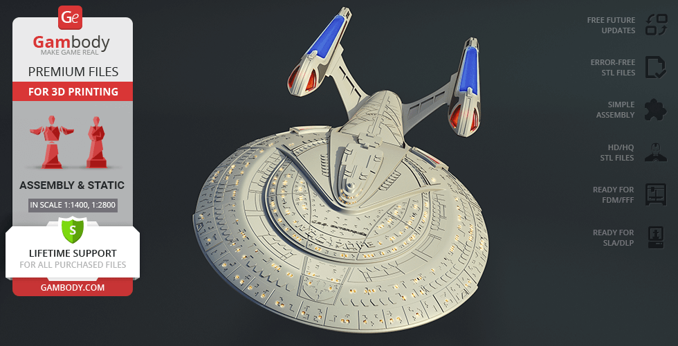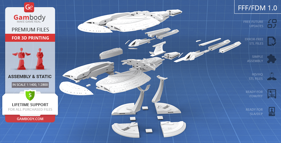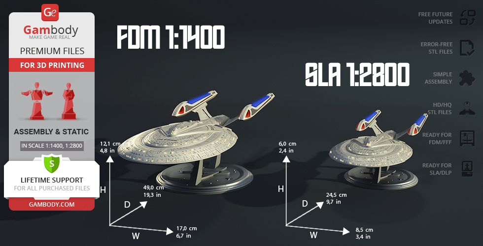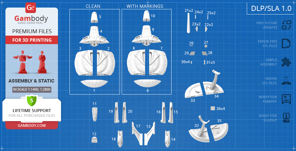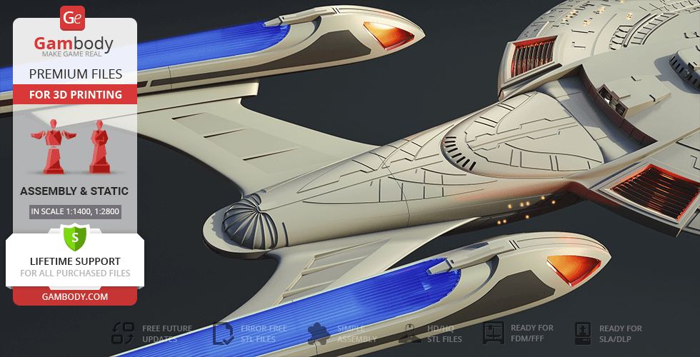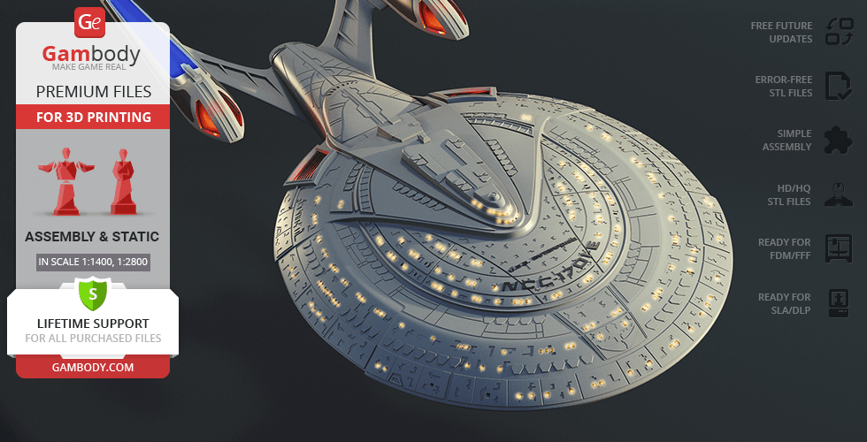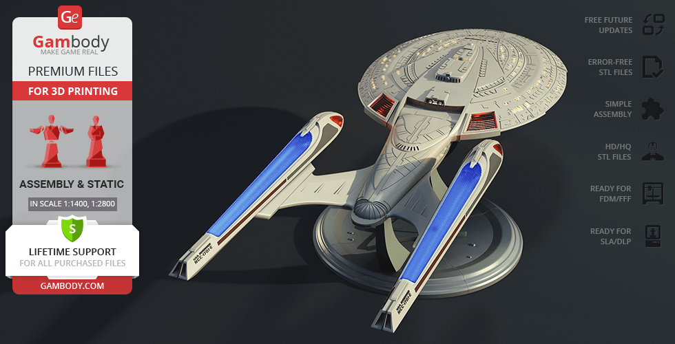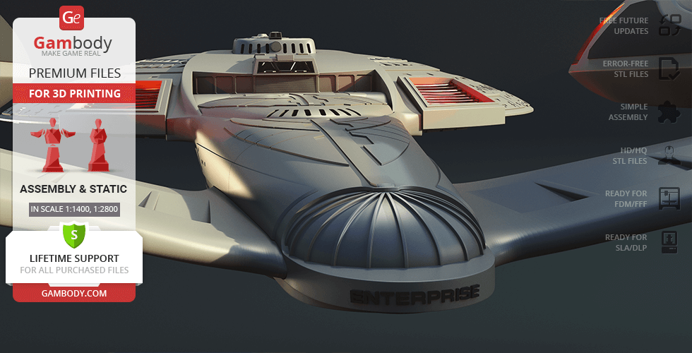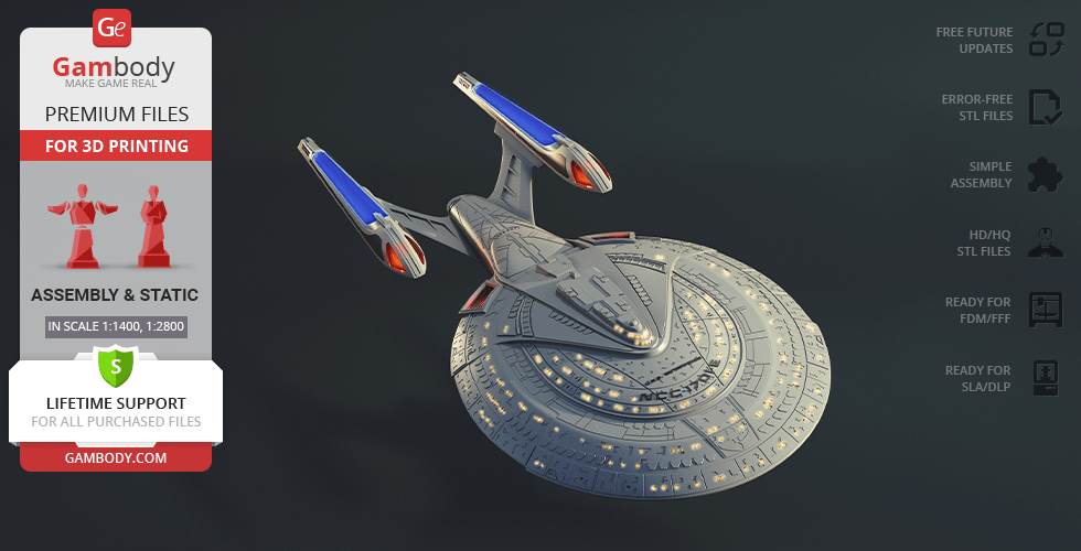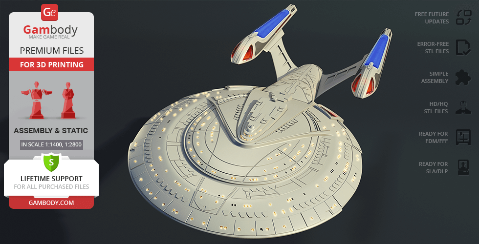 - 4 versions of the NCC-1701-E STL files for FFF/FDM, DLP/SLA 3D printers - files for each version are available for download after the purchase;
