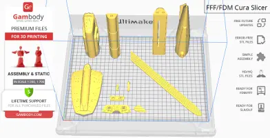 For you to receive the cleanest 3D printing result possible, minimize the amount of filament needed for generated support, and assemble the model with a variety of configurations, the ship was divided into convenient assembly parts.