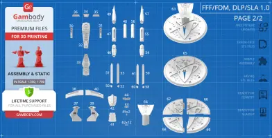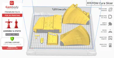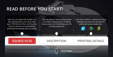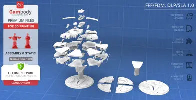 All assembly parts in the FFF/FDM 1.0 version are provided in STL files in recommended positions that were worked out in order to ensure the smoothness of the details’ surfaces after printing and that the 3D printing beginners won't face difficulties when placing the parts on a build plate. When downloading any model's file you will also receive "Assembly Manual" for FFF/FDM 1.0 and DLP/SLA 1.0 versions in PDF format. We highly recommend that you get acquainted with the “Assembly video” and "Assembly Manual" before getting down to the USS Reliant model.